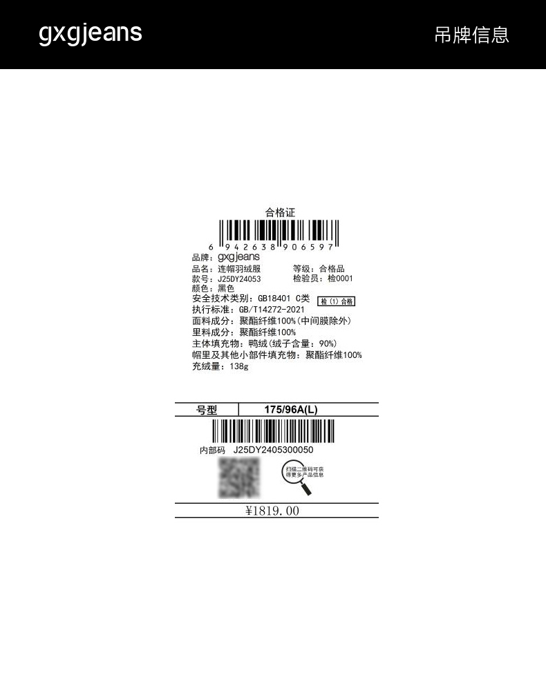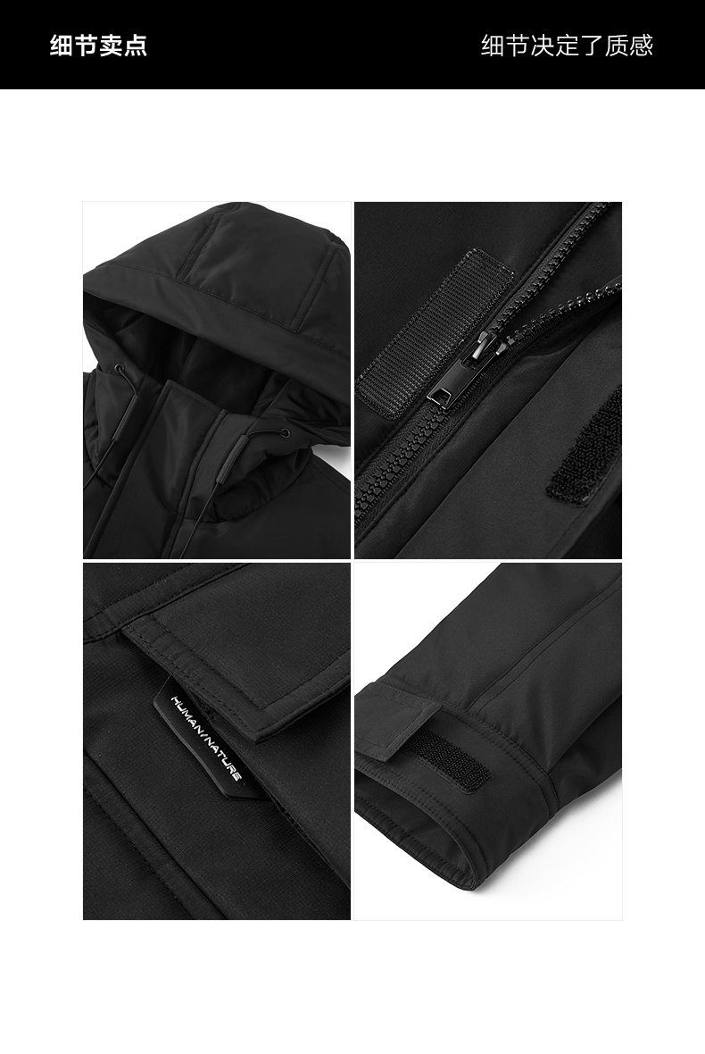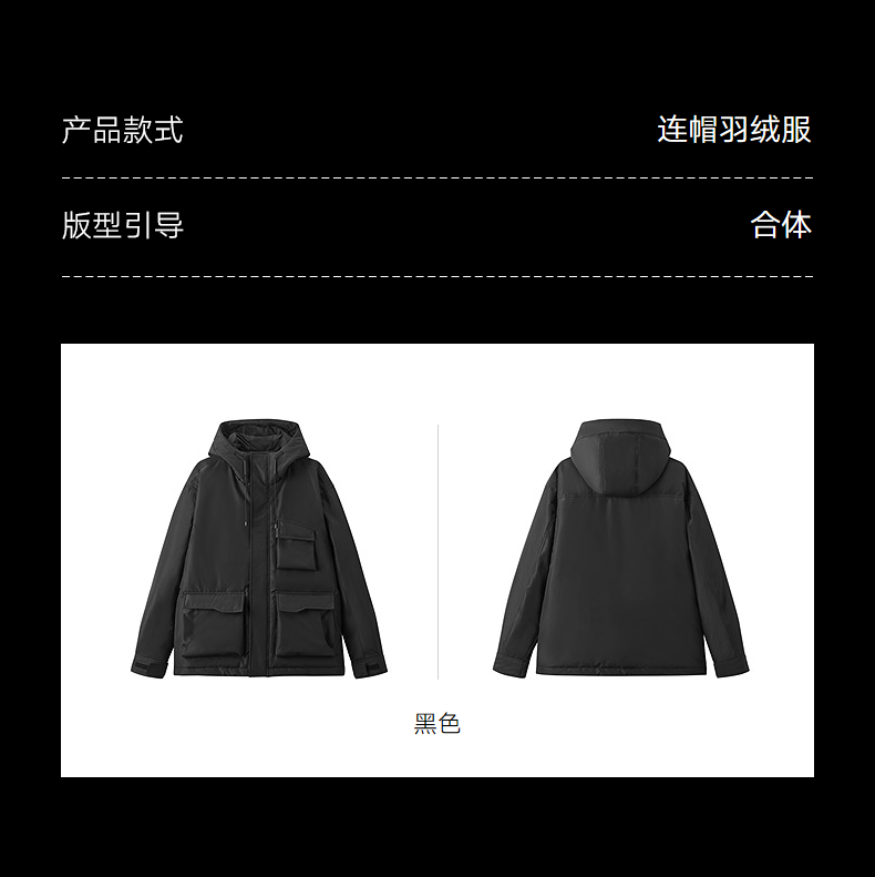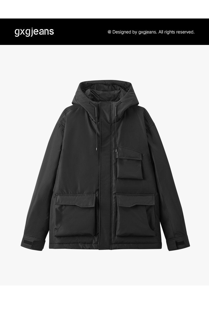 gxgjeans男装 黑色工装口袋设计保暖连帽羽绒服外套 冬季新品