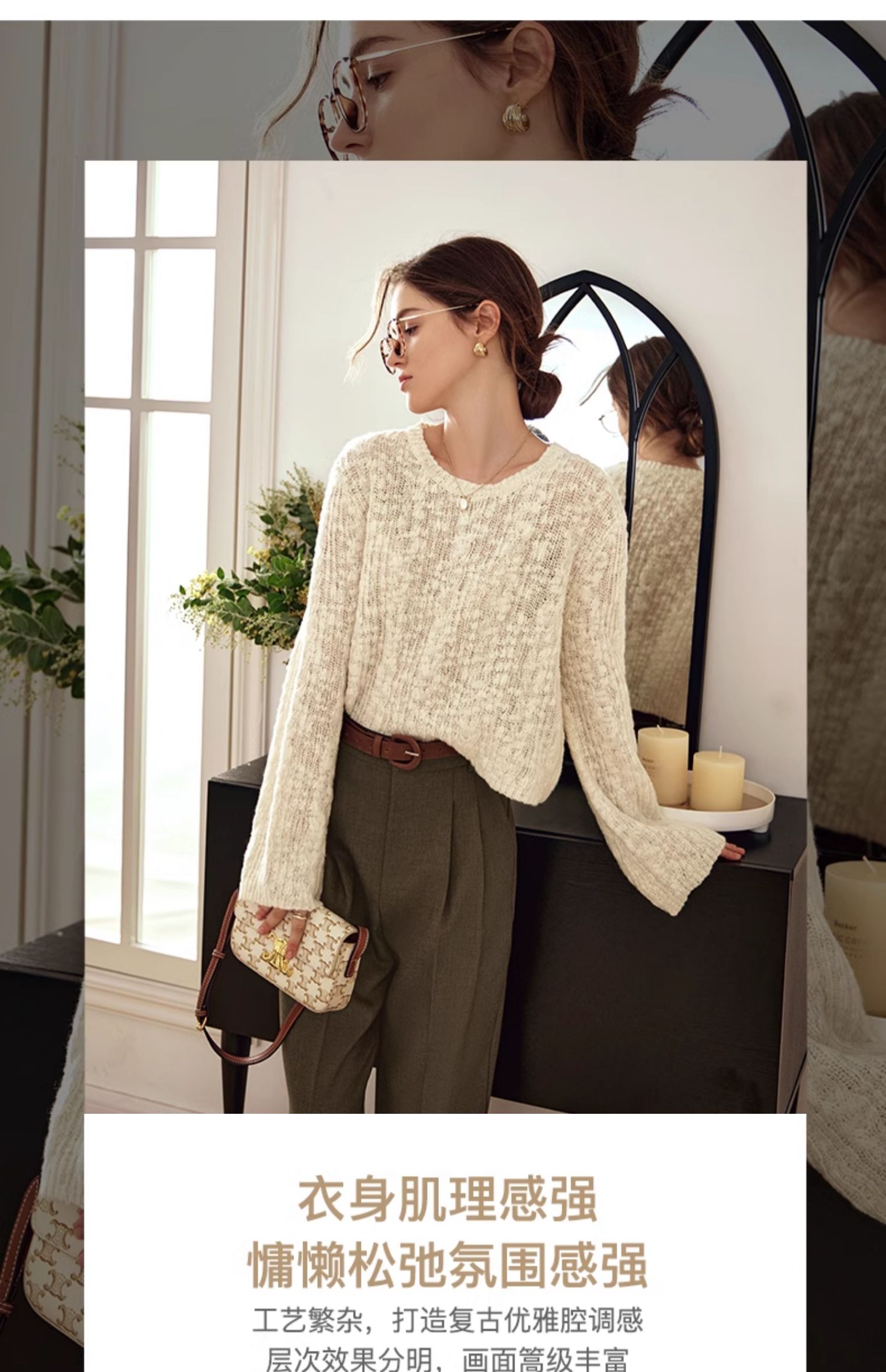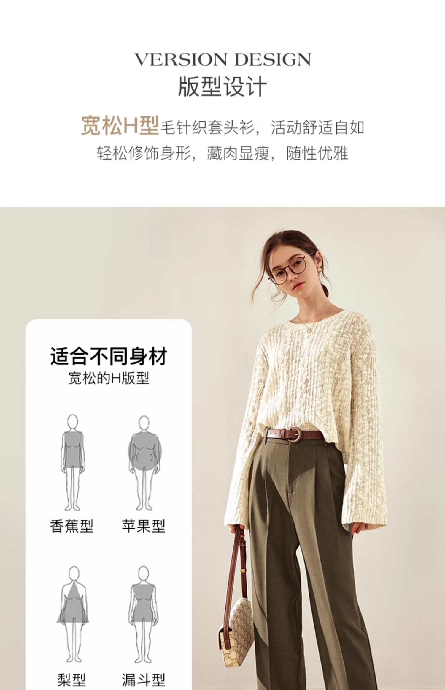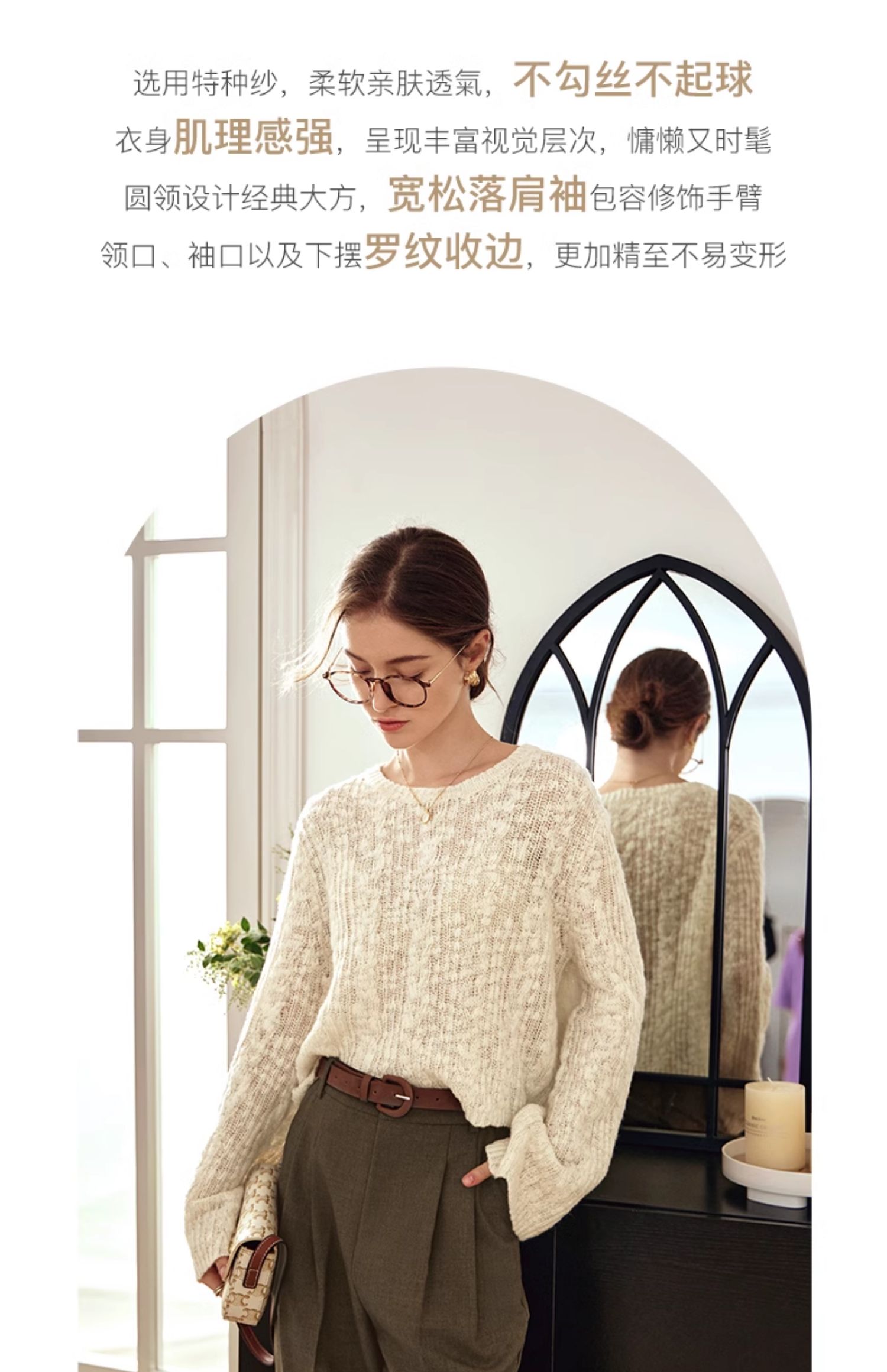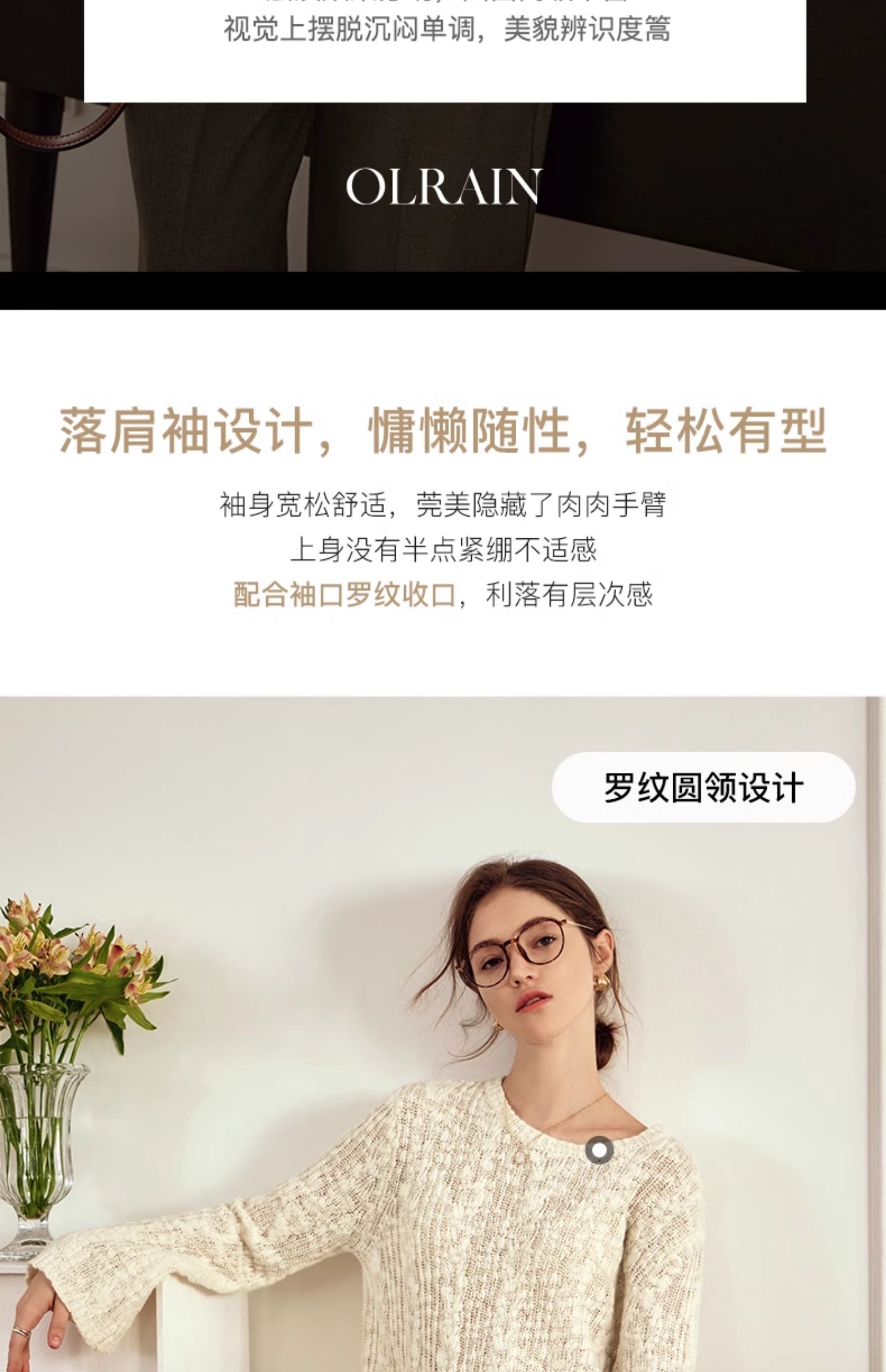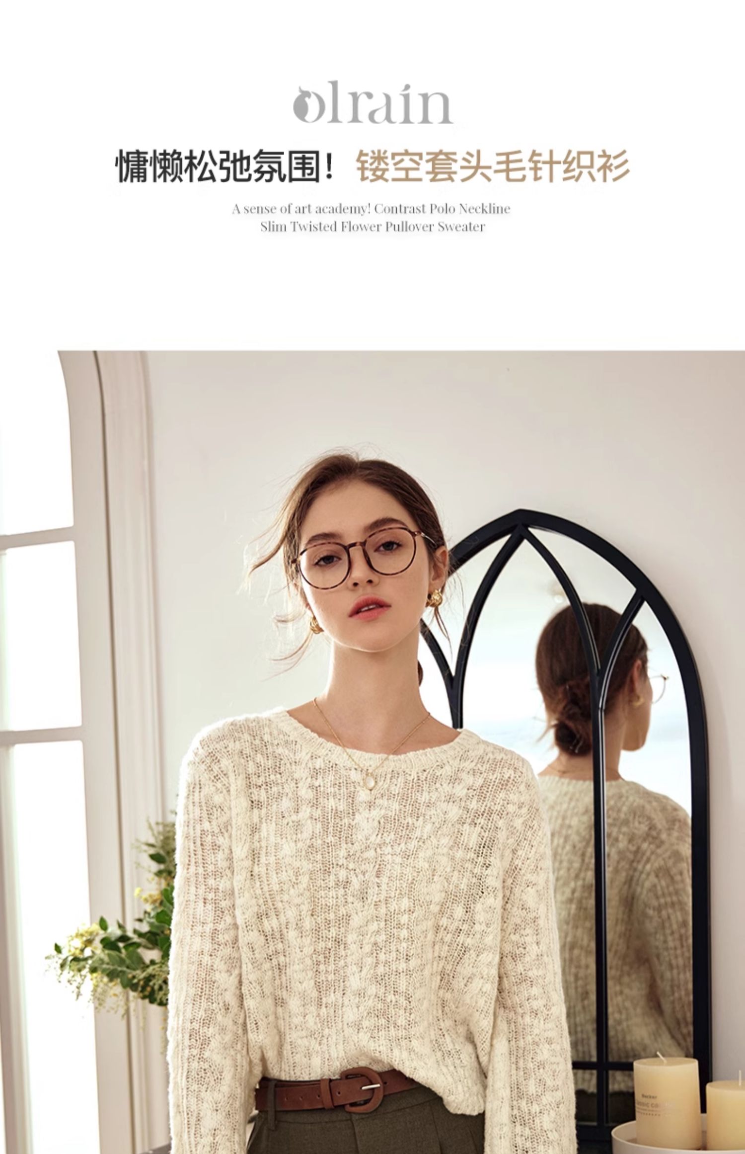 OLrain欧芮儿杏色镂空针织衫女早春2024年新款宽松圆领套头毛衣
