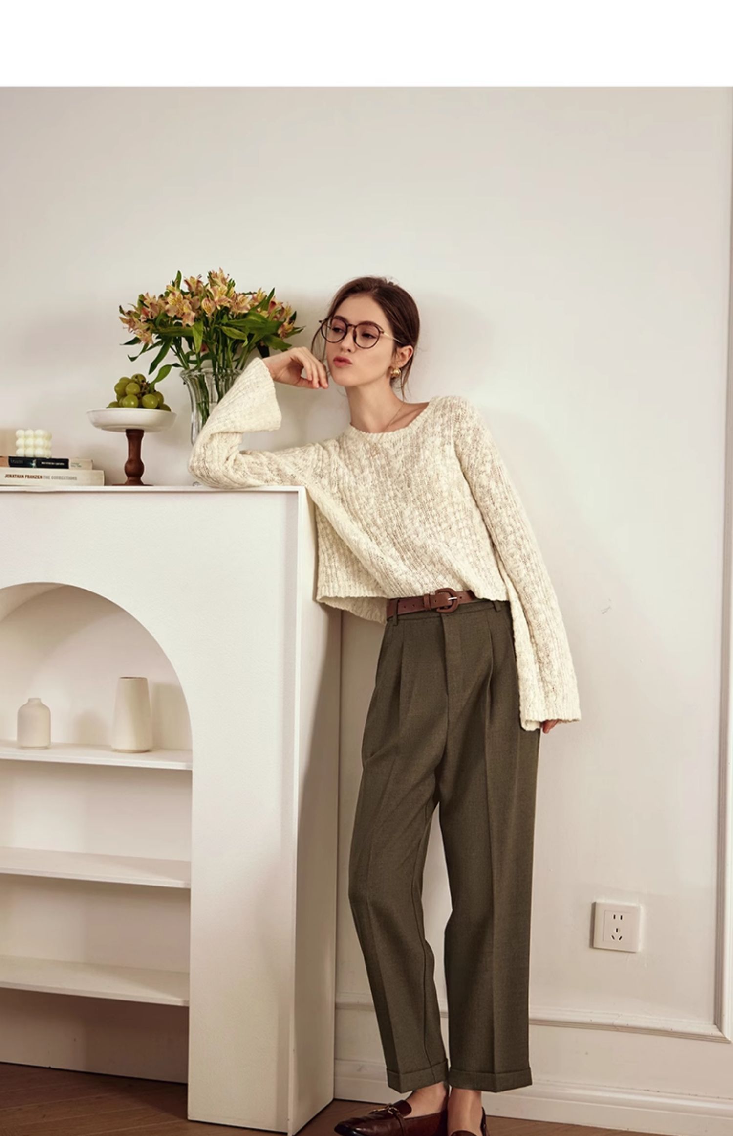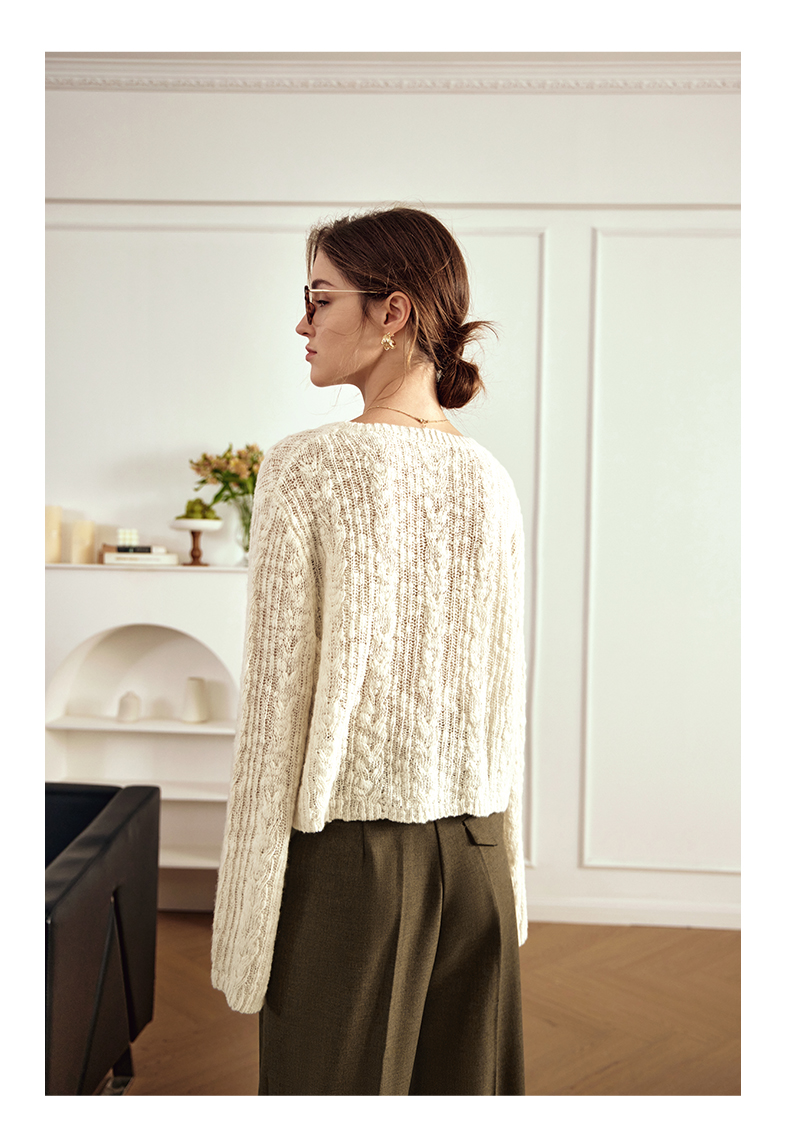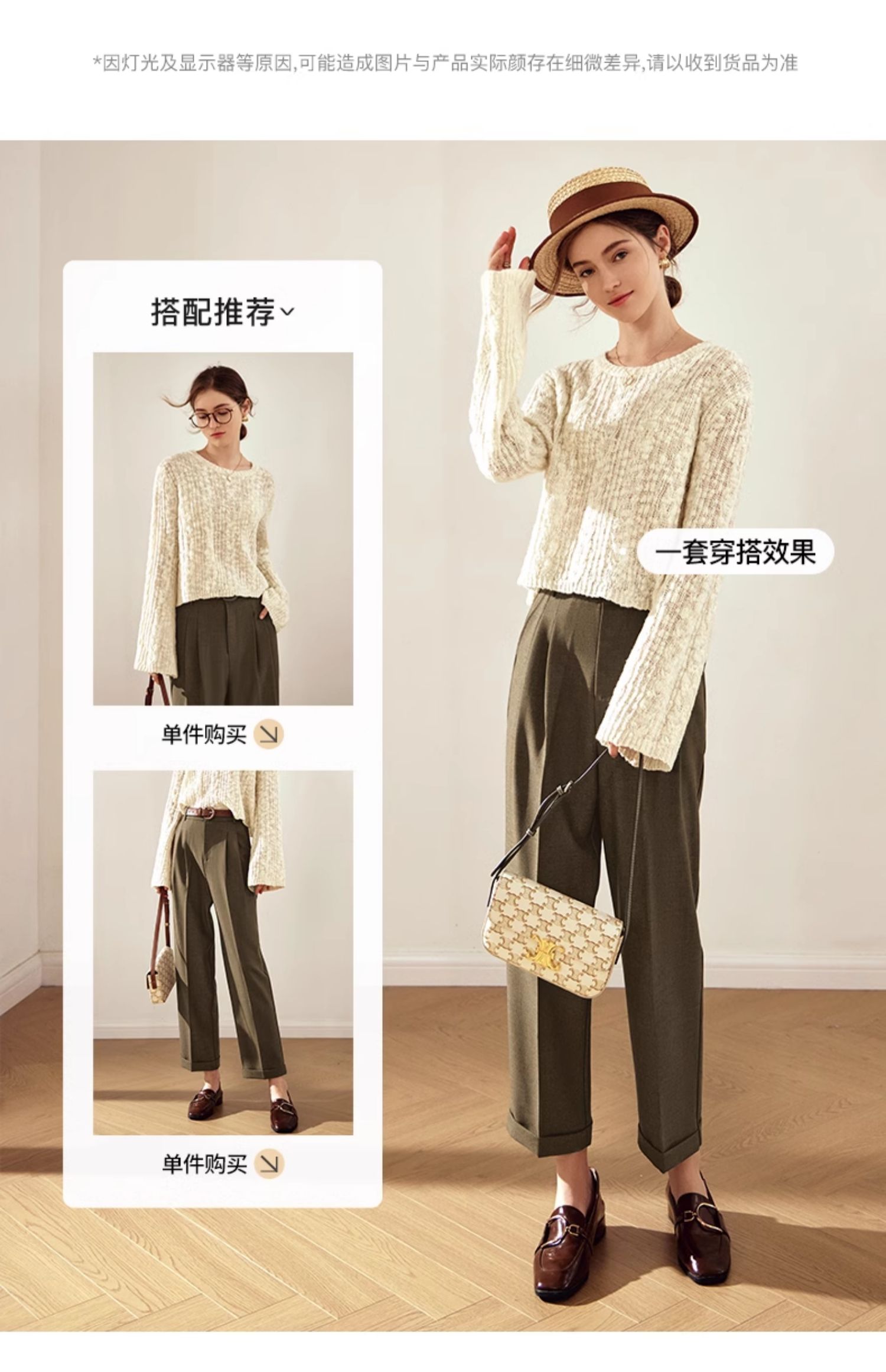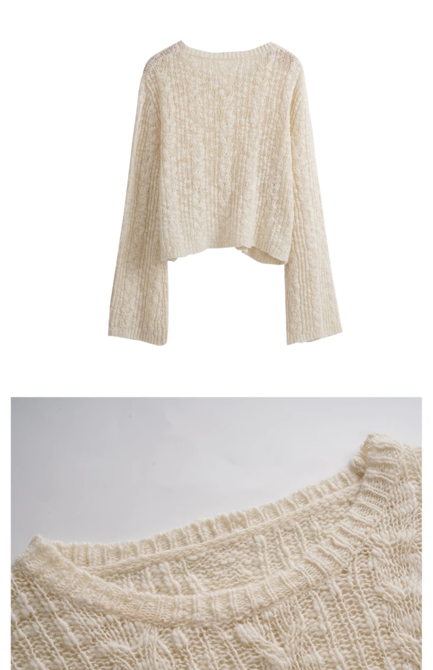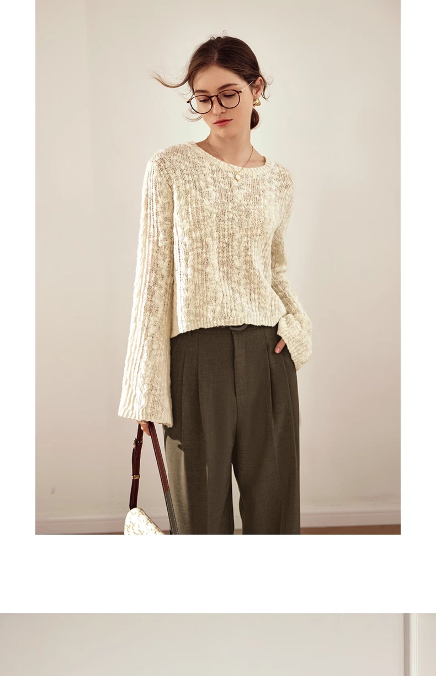 OLrain欧芮儿杏色镂空针织衫女早春2024年新款宽松圆领套头毛衣