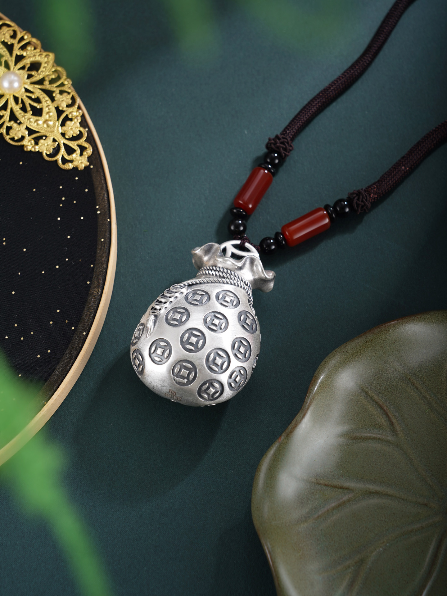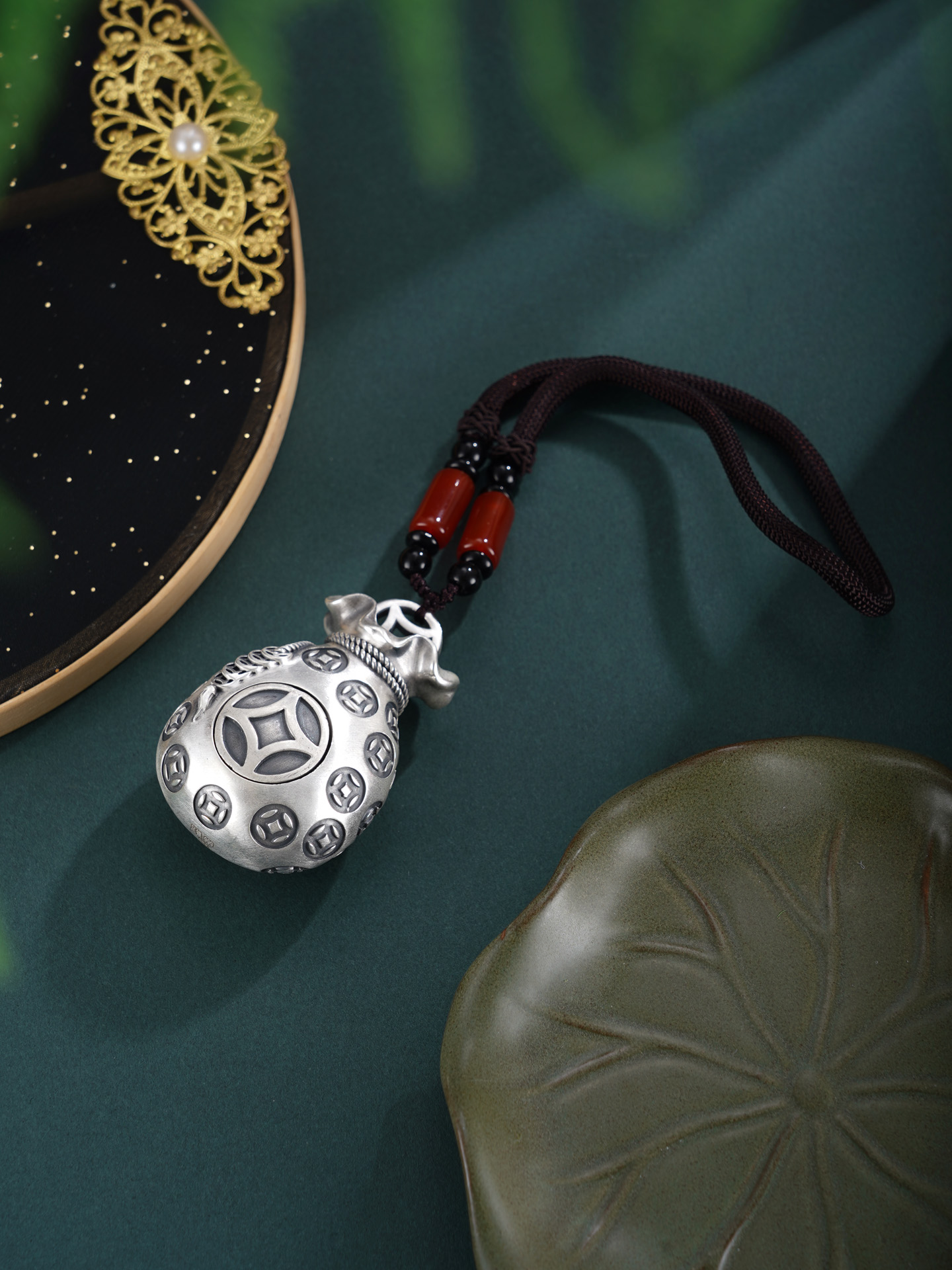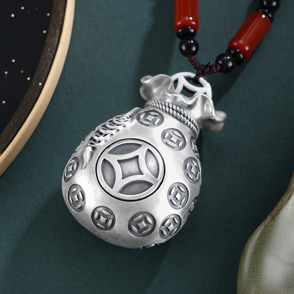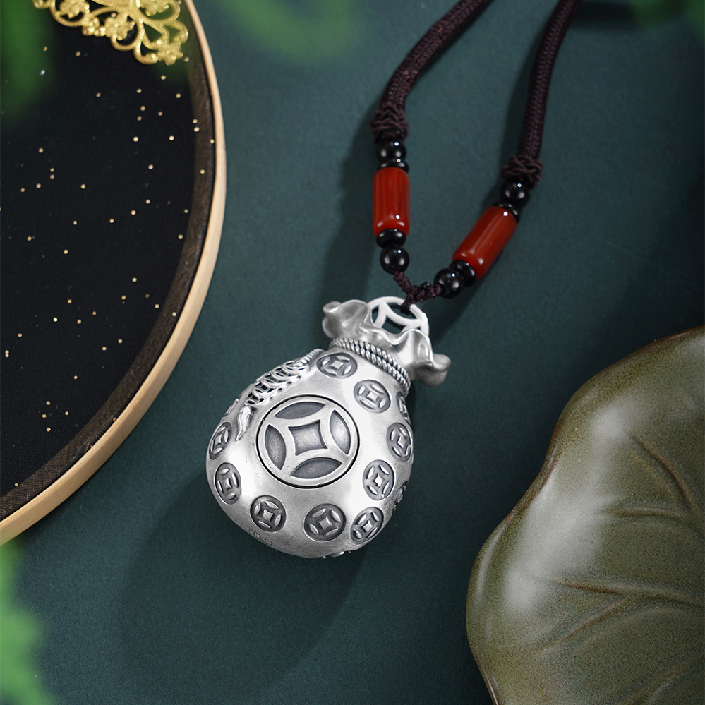 【寓意】:福袋的雏形可追溯至古代钱袋,人们将财宝或吉祥物置于布囊之中,取“袋”与“代”谐音之巧,寄寓“代代有福、福泽绵长”的美好期许。纯银手把件福袋,表面錾刻铜钱纹样,暗喻财源广进、代代有余。