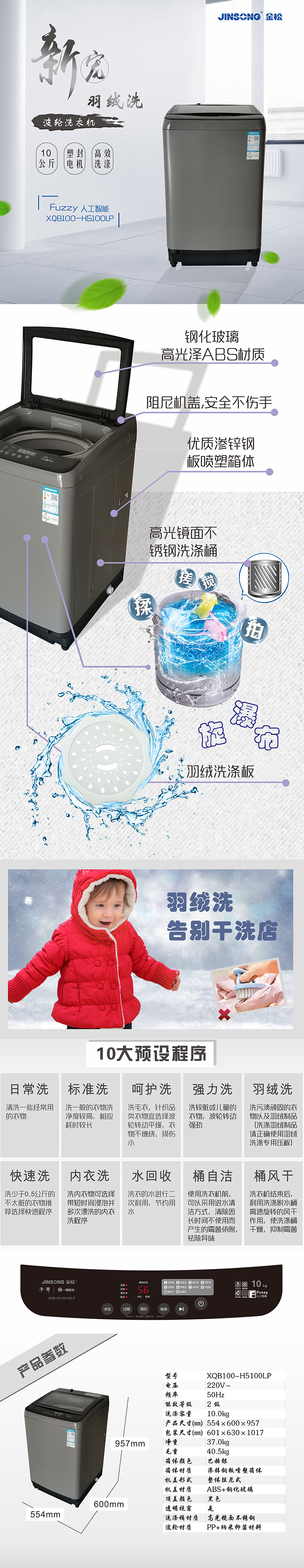 金松 洗衣机 XQB100-H5100LP 10公斤 灰 大容量全自动洗衣机 波轮 羽绒洗