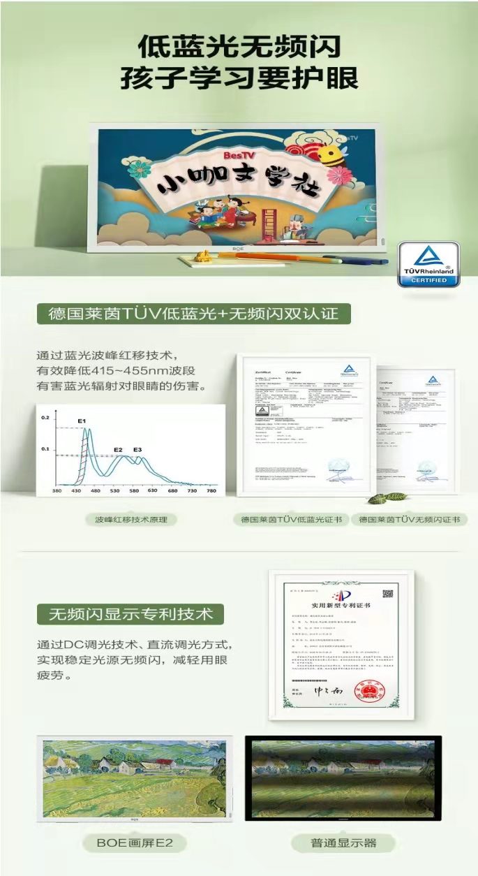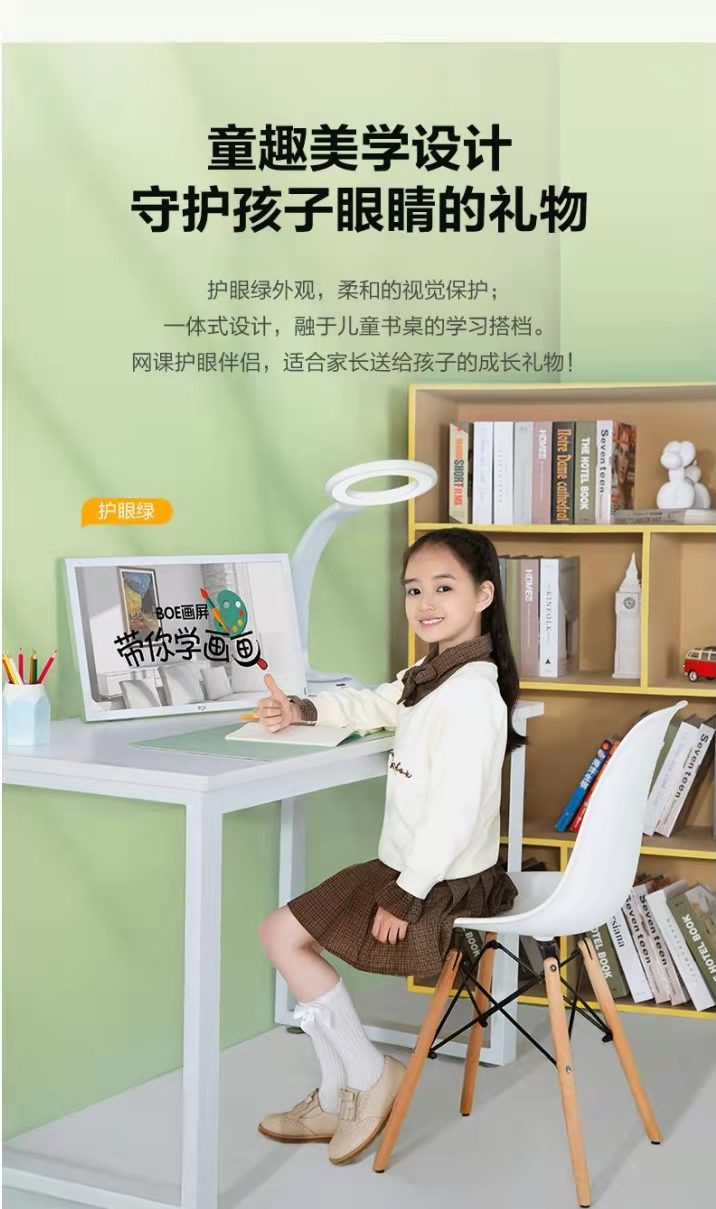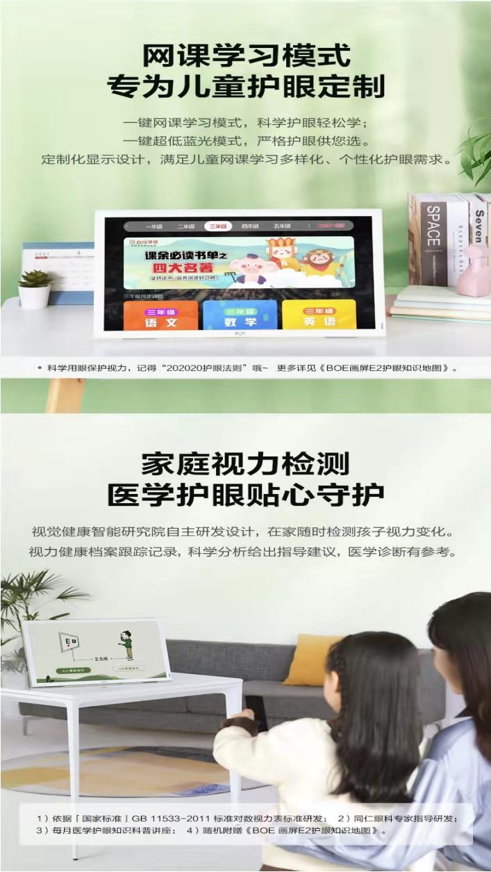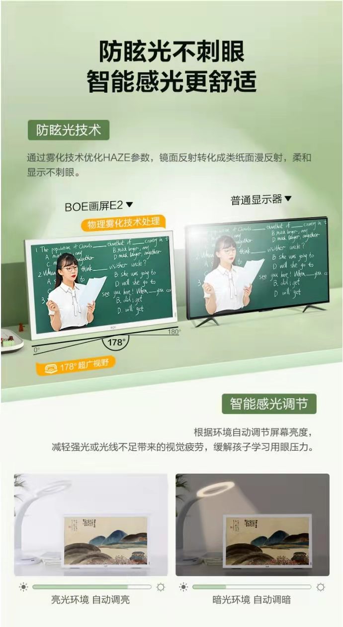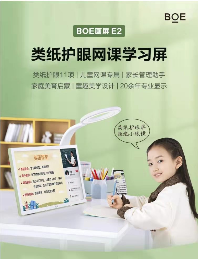 BOE 画屏 E2,类纸护眼网课学习屏。依托全球半导体显示产业龙头企业--京东方技术实力创新研 发,专为 3~15 岁儿童网课学习场景设计。