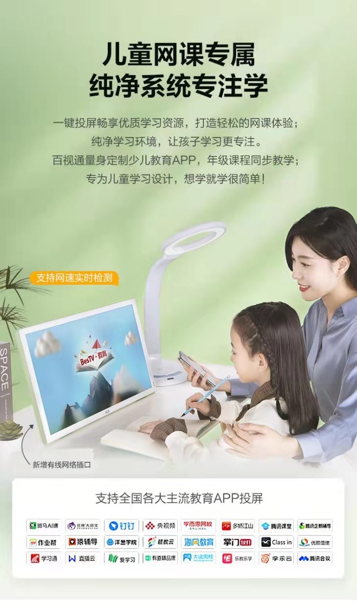 更有一键网课投屏、家长管理助手、百视通少儿教 育定制内容,打造纯净学习环境,让孩子专注学,高效学。
