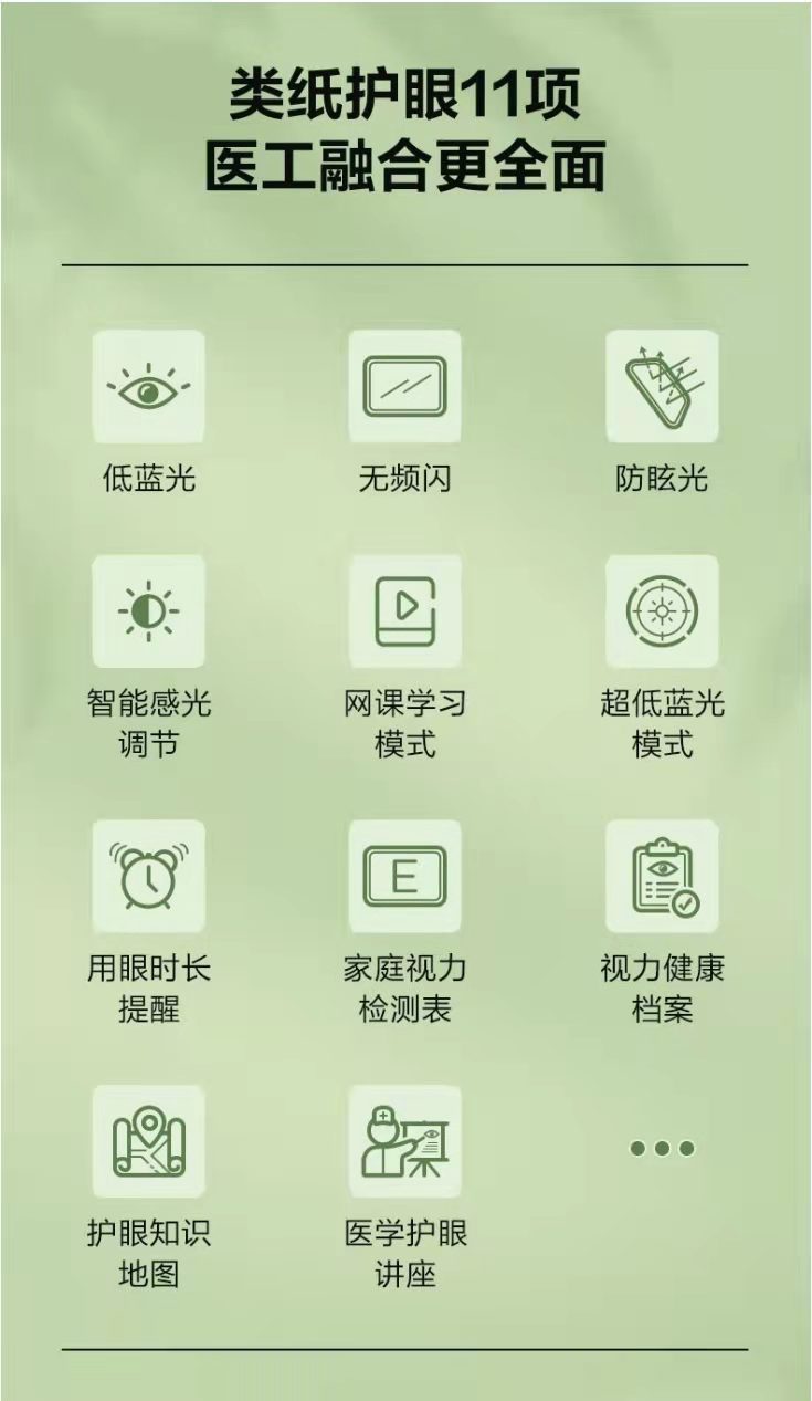 其凭借独有的类纸护眼显示技术,解决蓝光、频闪、眩光等 因素易造成儿童视力损伤的问题;辅助医学护眼方法,通过用眼时长提醒、视力随时检测、视力健康档 案、用眼习惯养成等方式,守护儿童网课用眼健康。