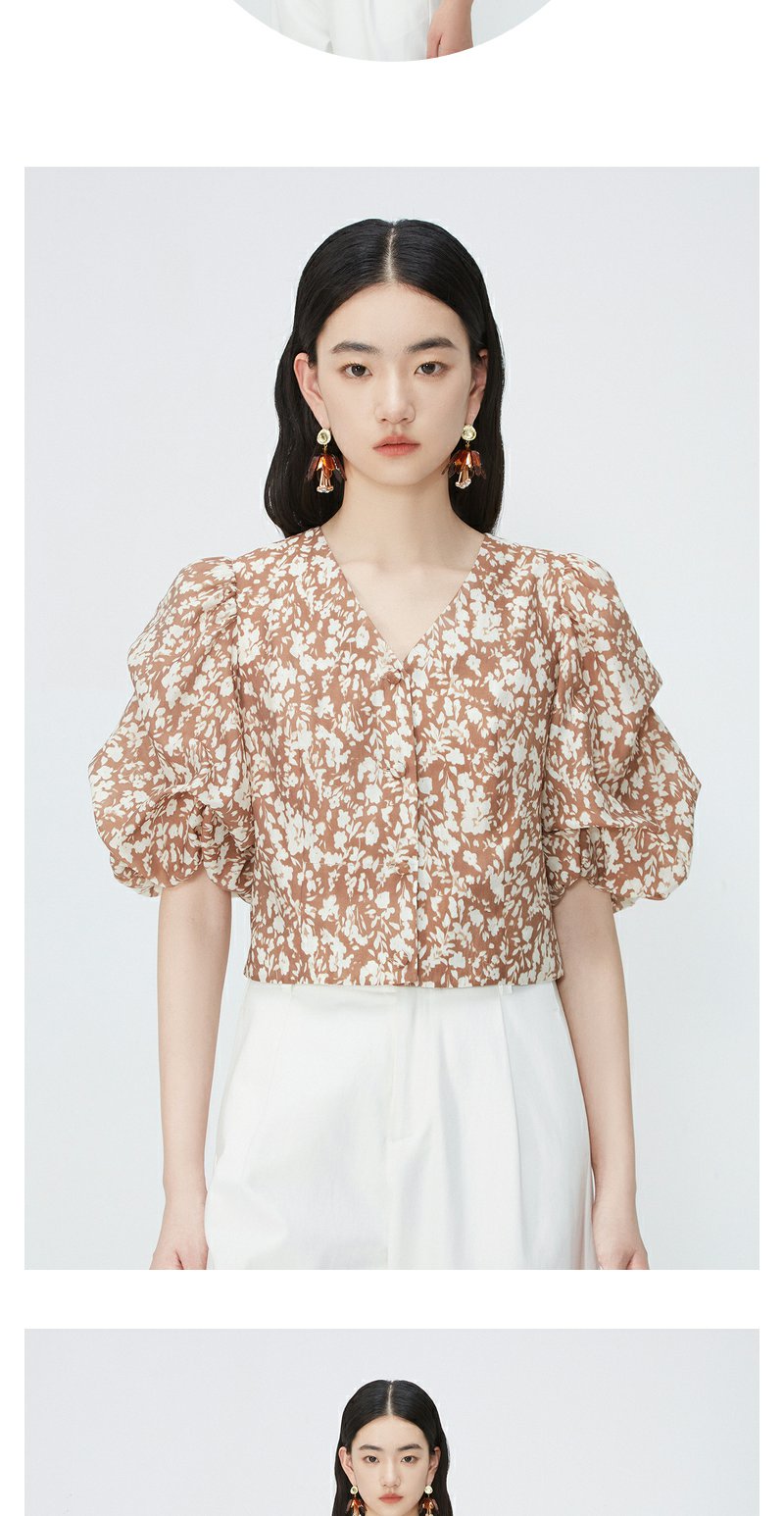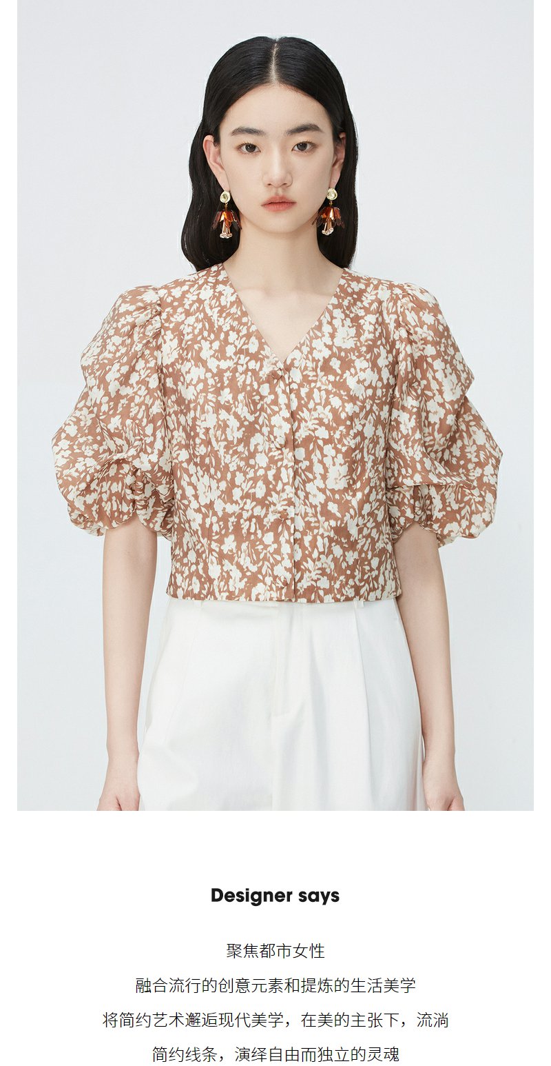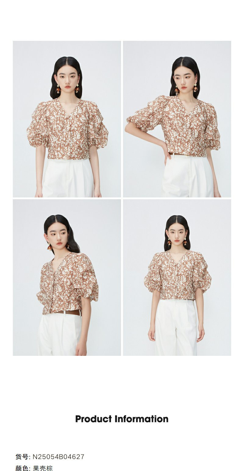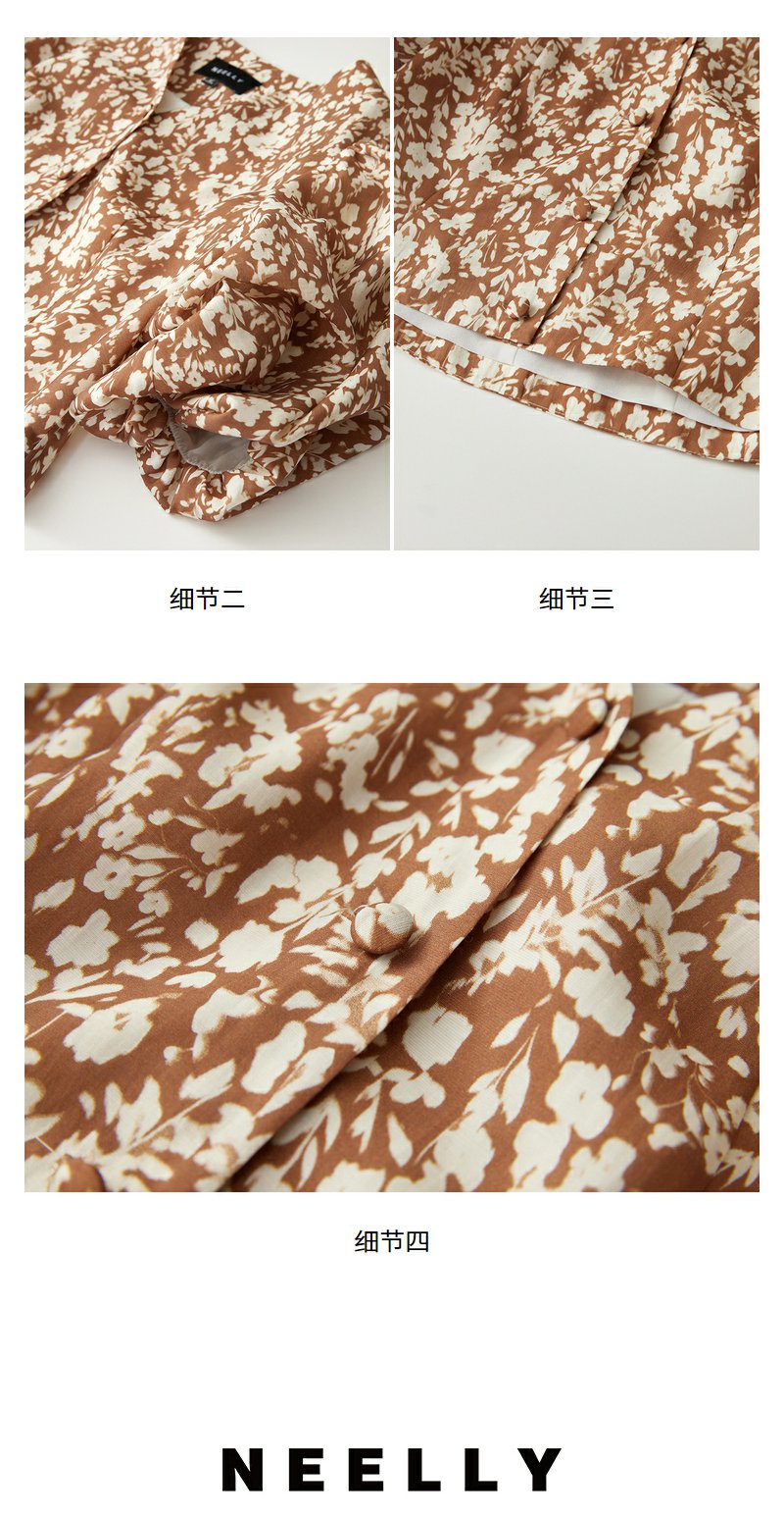 NEELLY纳俪商场同款夏新款泡泡袖V领衬衫女碎花桑蚕丝单排扣上衣N25054B04627
