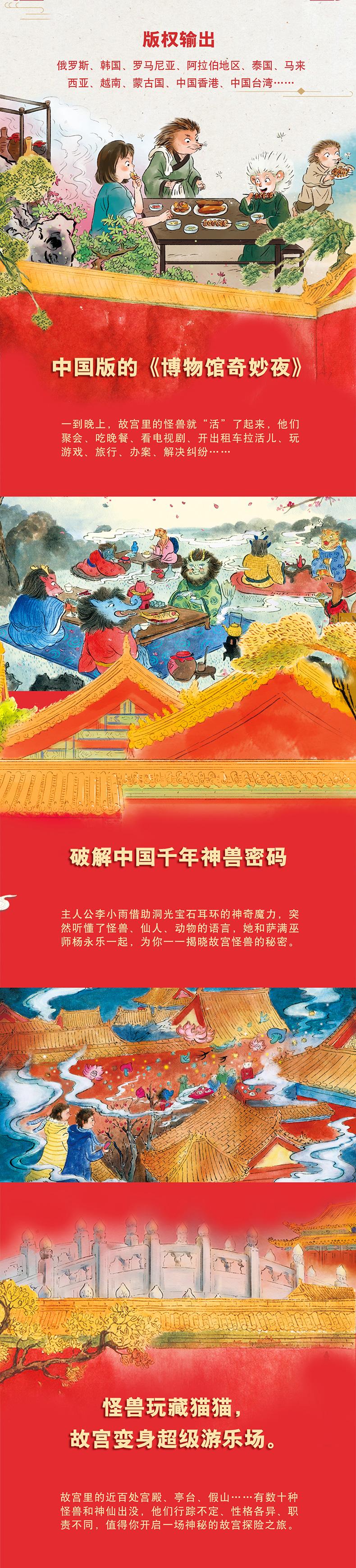 《故宫里的大怪兽》(套装18册)包括《洞光宝石的秘密》《御花园里的火车站》《睡龙床的男孩儿》《景仁宫的怪事》《独角兽的审判》《小小金殿里的木偶戏》《白泽大王的回忆》《恶魔龙的真相》《貔貅向往的世界》《追踪骊龙》《土耳其浴室里的战斗》《神仙院》《大明星驺虞》《木之精灵》《独角女孩》《畅音阁的卡拉》《西洋龙的离奇故事》《毕业了》。