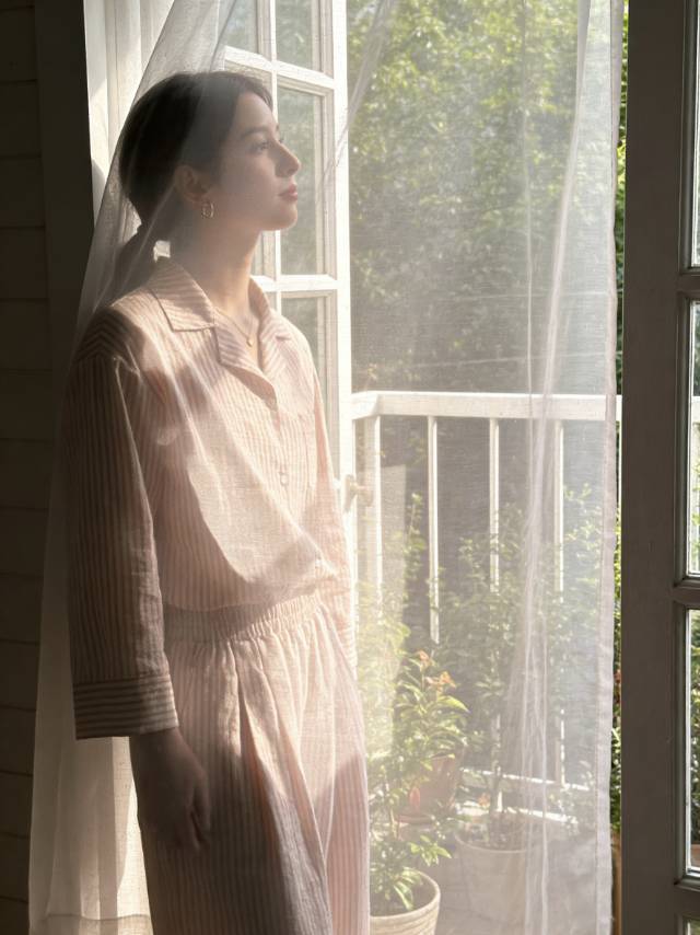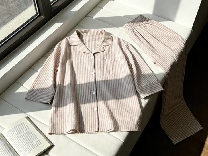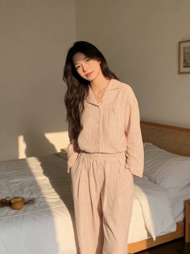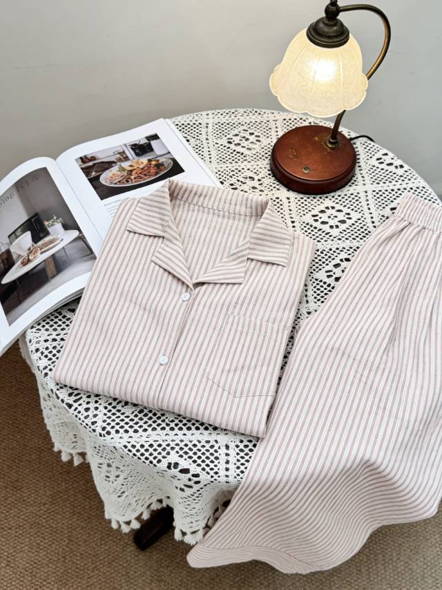 把生活过成温柔日常 真正有质感的生活,从不只在出门时。 这套粉条纹家居服,把松弛与精致揉进宅家每一刻。 低饱和粉白条纹,温柔不张扬,自带高级氛围感, 在家看书、追剧、小憩,都像在享受专属治愈时光。