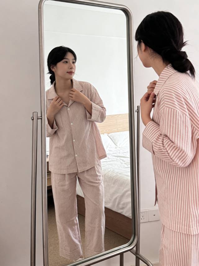 🎀 颜值|温柔粉雾细川,显白又减龄 温柔粉色条纹,色调柔和不刺眼, 上身穿显白提气色,减龄又显气质, 不挑肤色不挑年龄,轻松拿捏居家氛围感。
