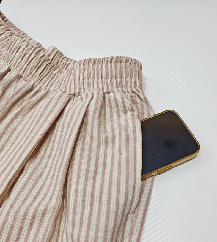 本布侧边口袋 裤子两侧做了同面料本布口袋,深度足够,放手机、纸巾、遥控器都稳妥,不会轻易滑落。口袋边缘走线工整,不鼓包、不外翻,美观又实用,居家随手一揣,安全感拉满。