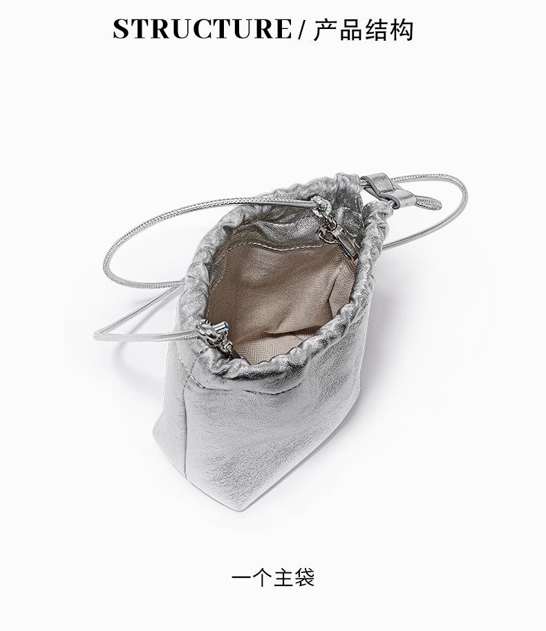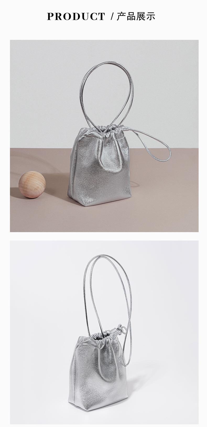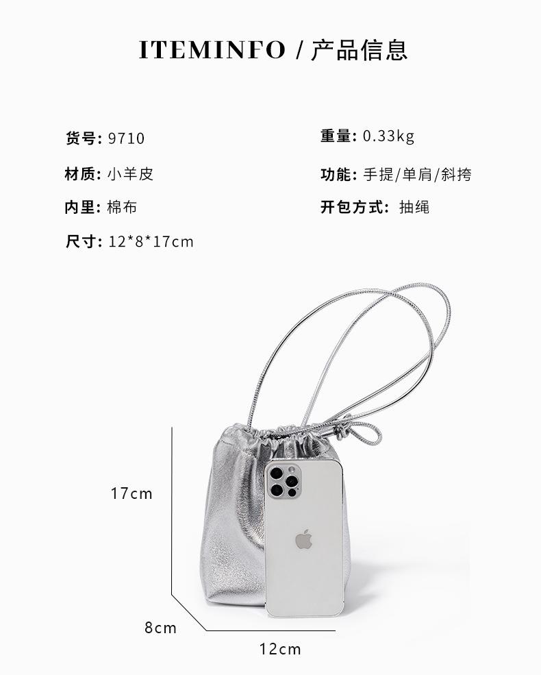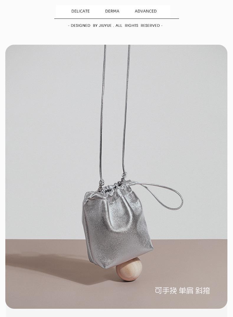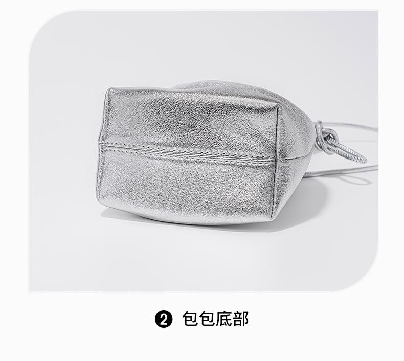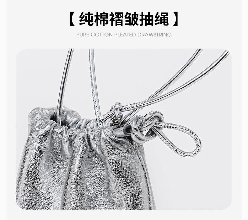 韩系小羊皮迷你福袋包软皮褶皱抽绳手拎水桶包新款银色真皮斜挎包