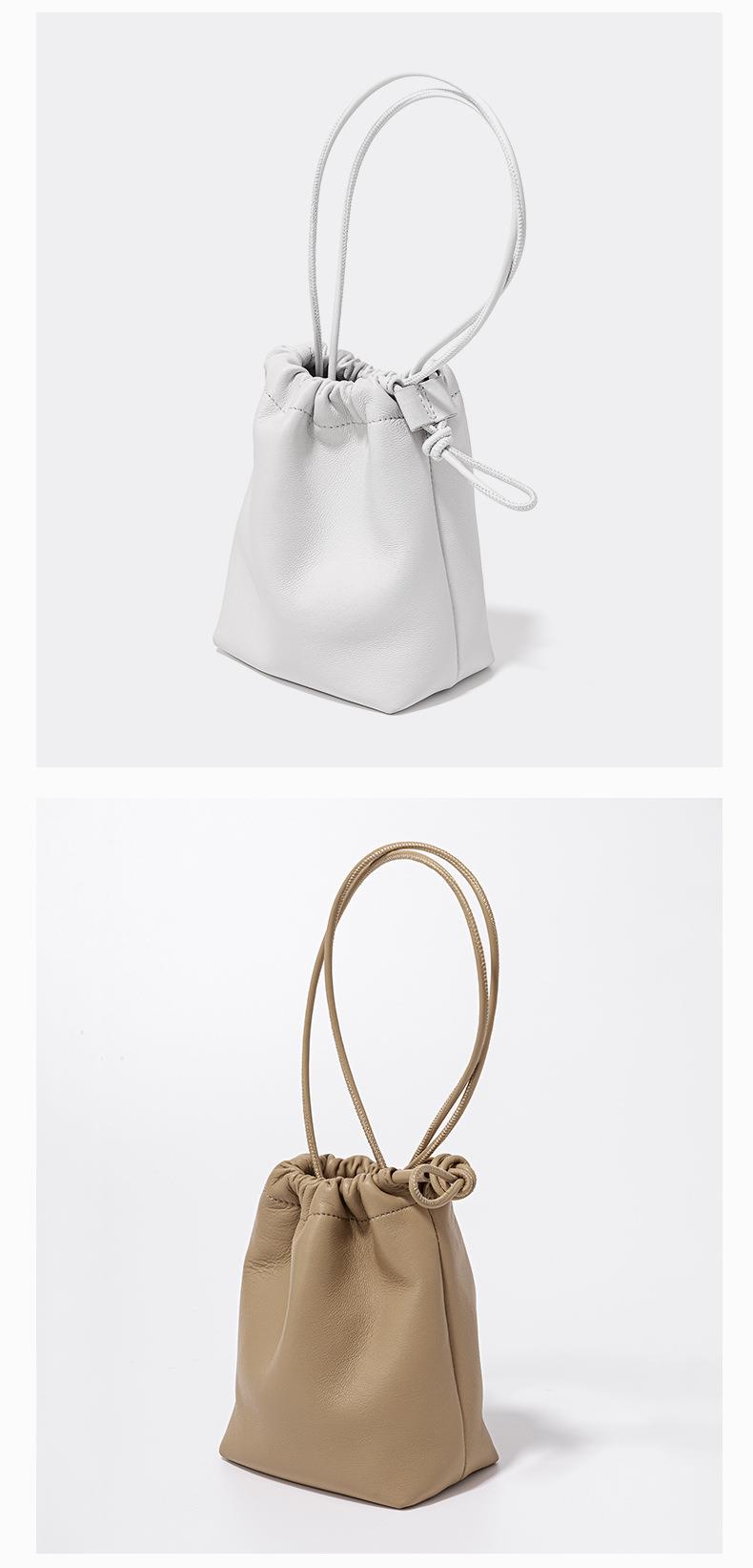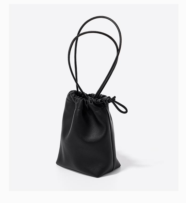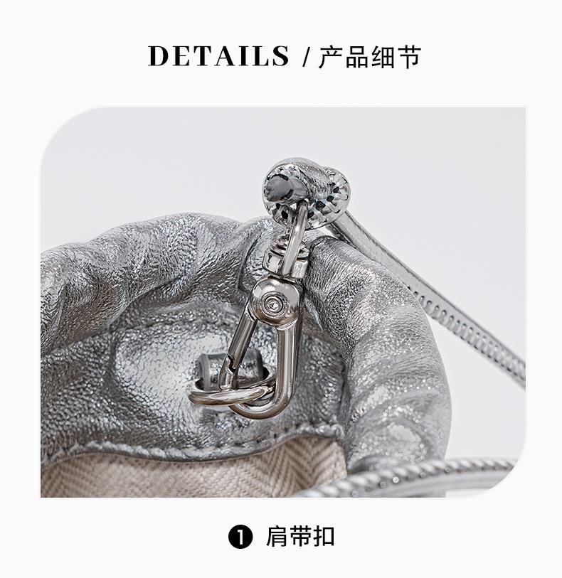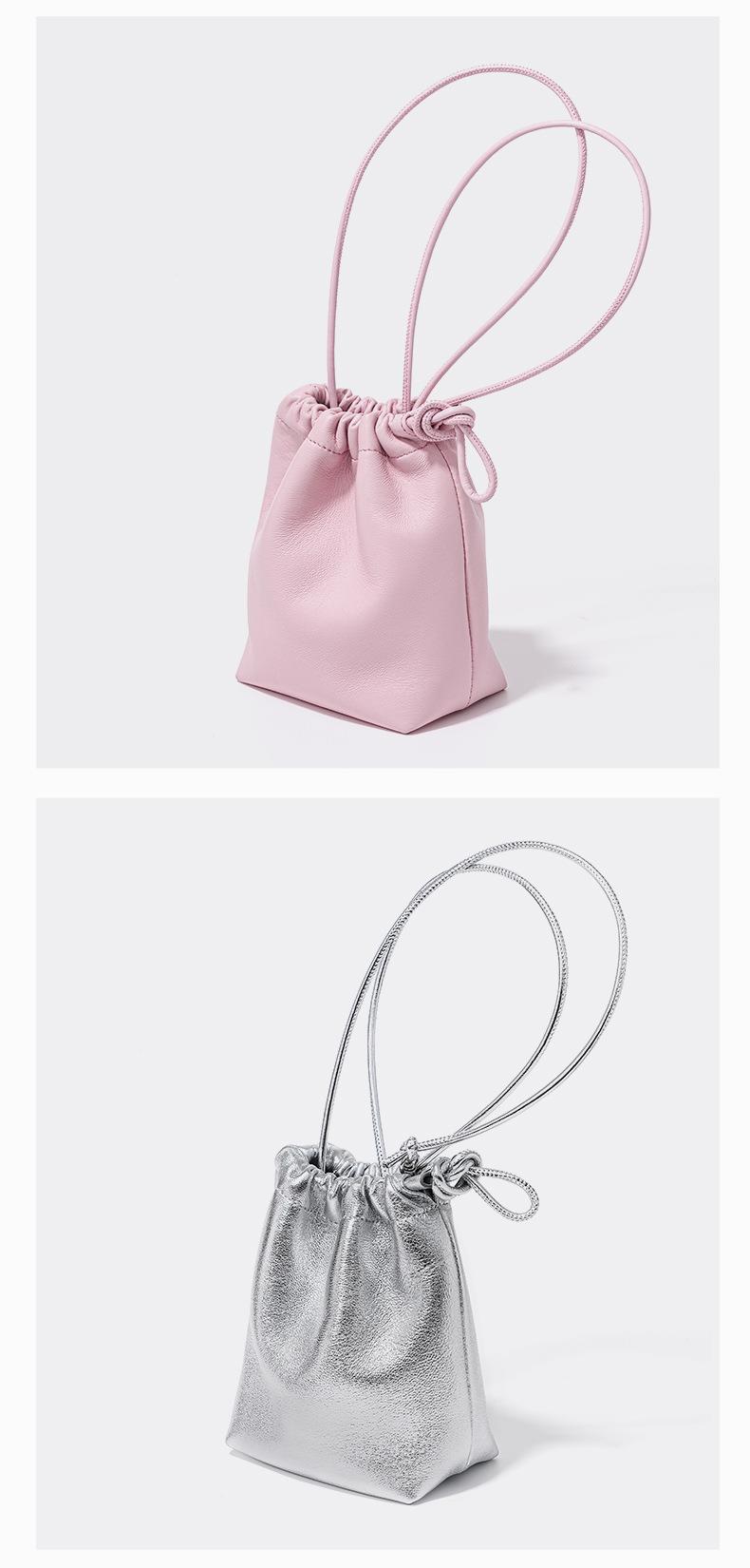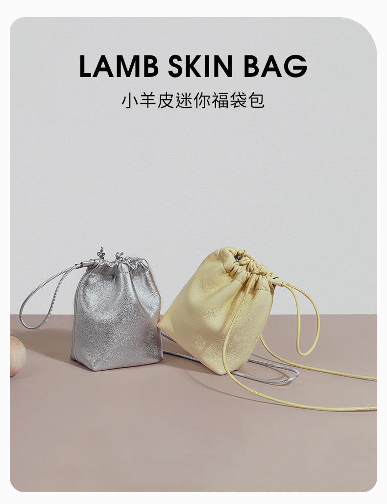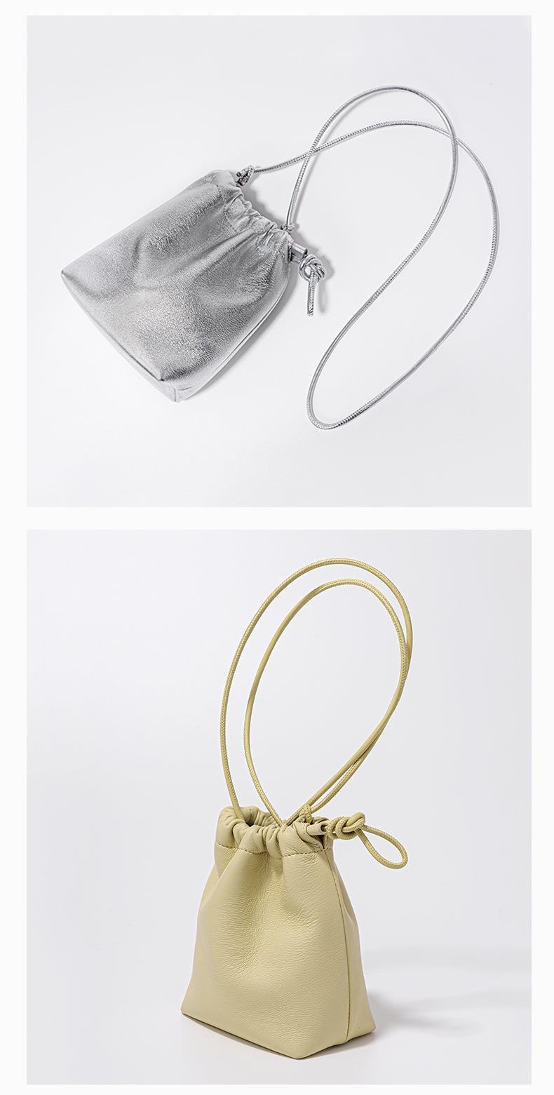 韩系小羊皮迷你福袋包软皮褶皱抽绳手拎水桶包新款银色真皮斜挎包