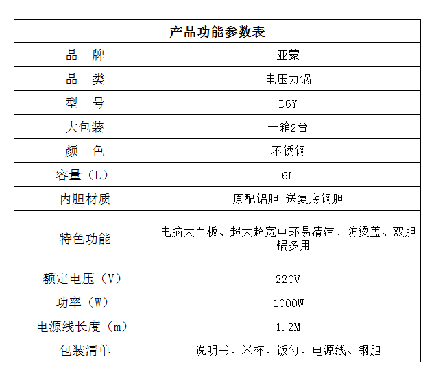 亚蒙 电压力锅 D6Y 1000W
