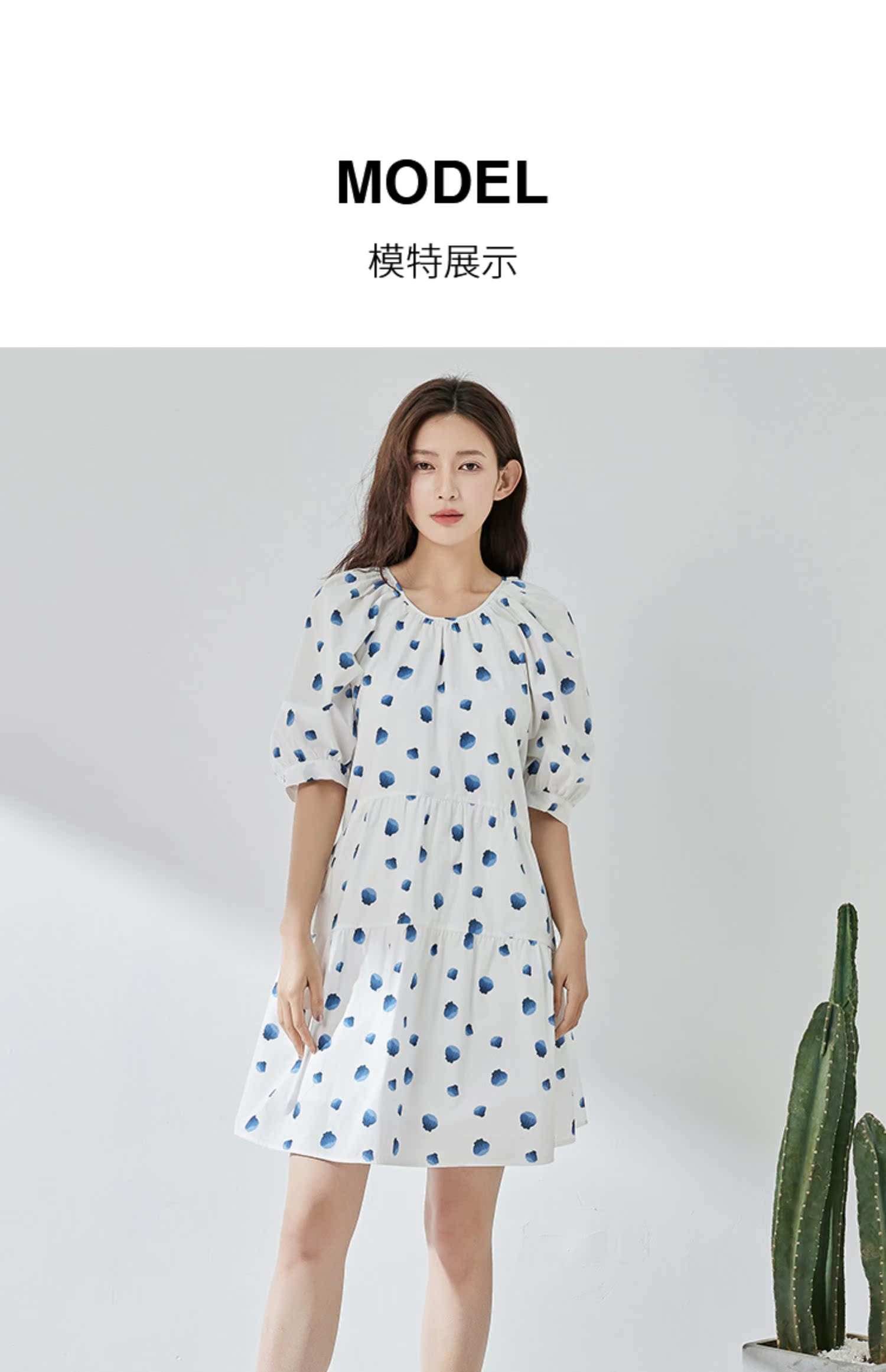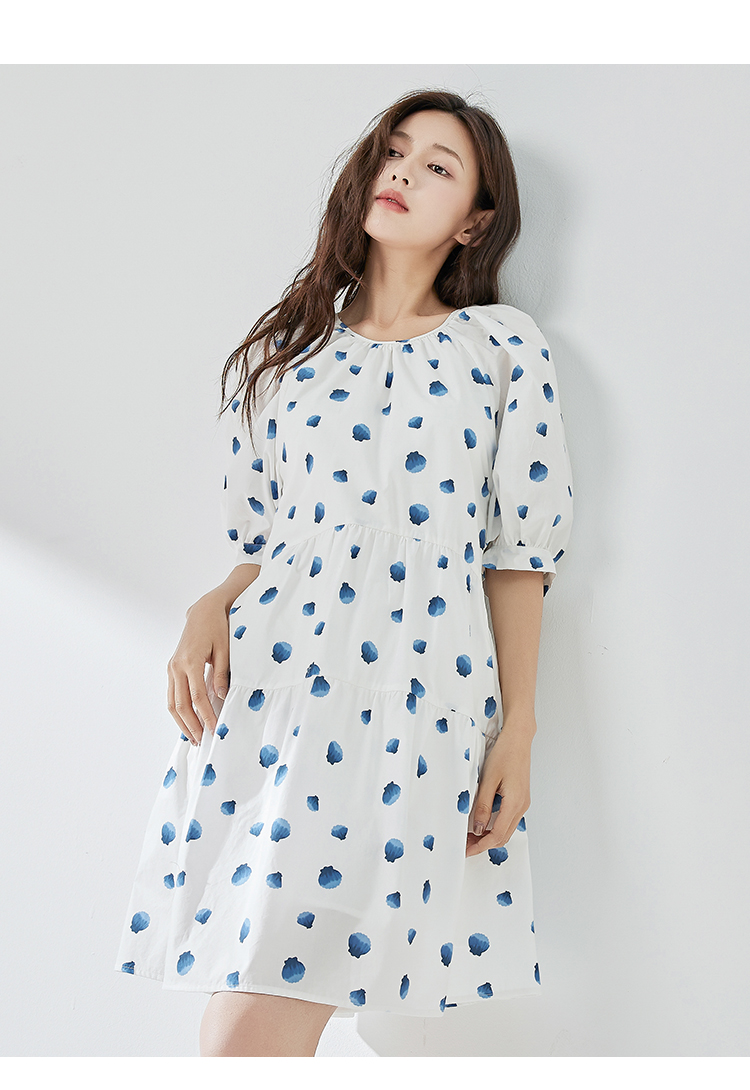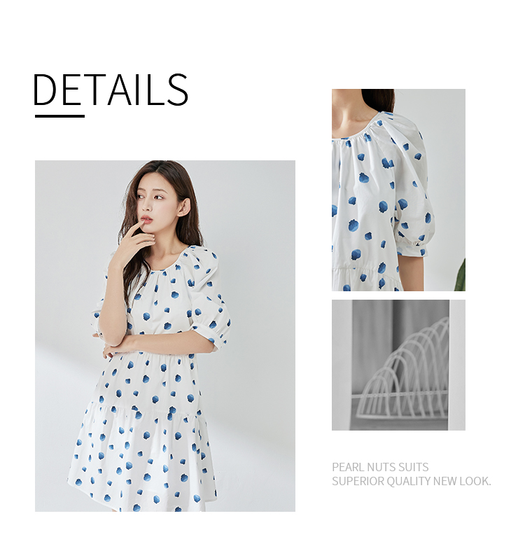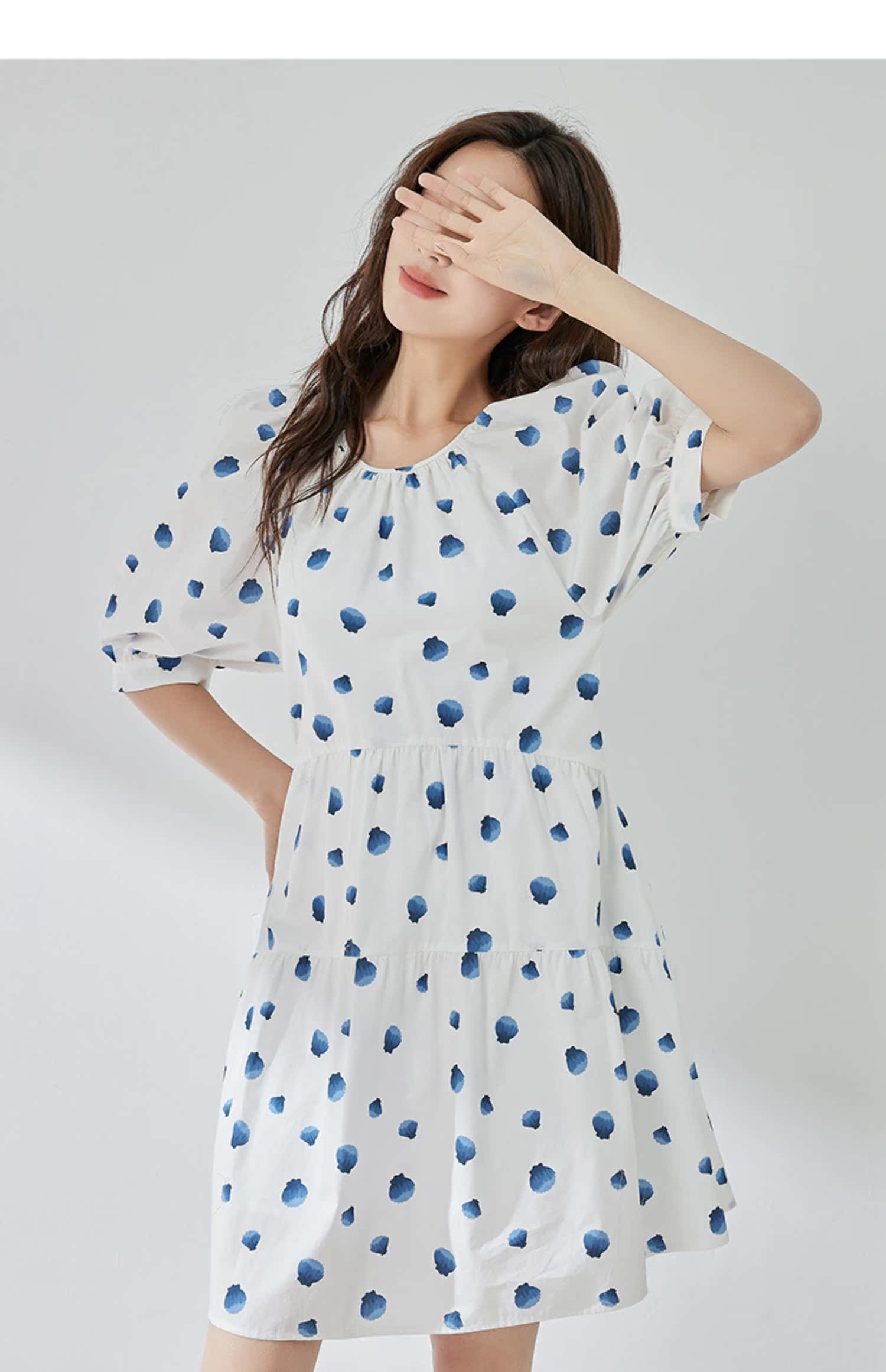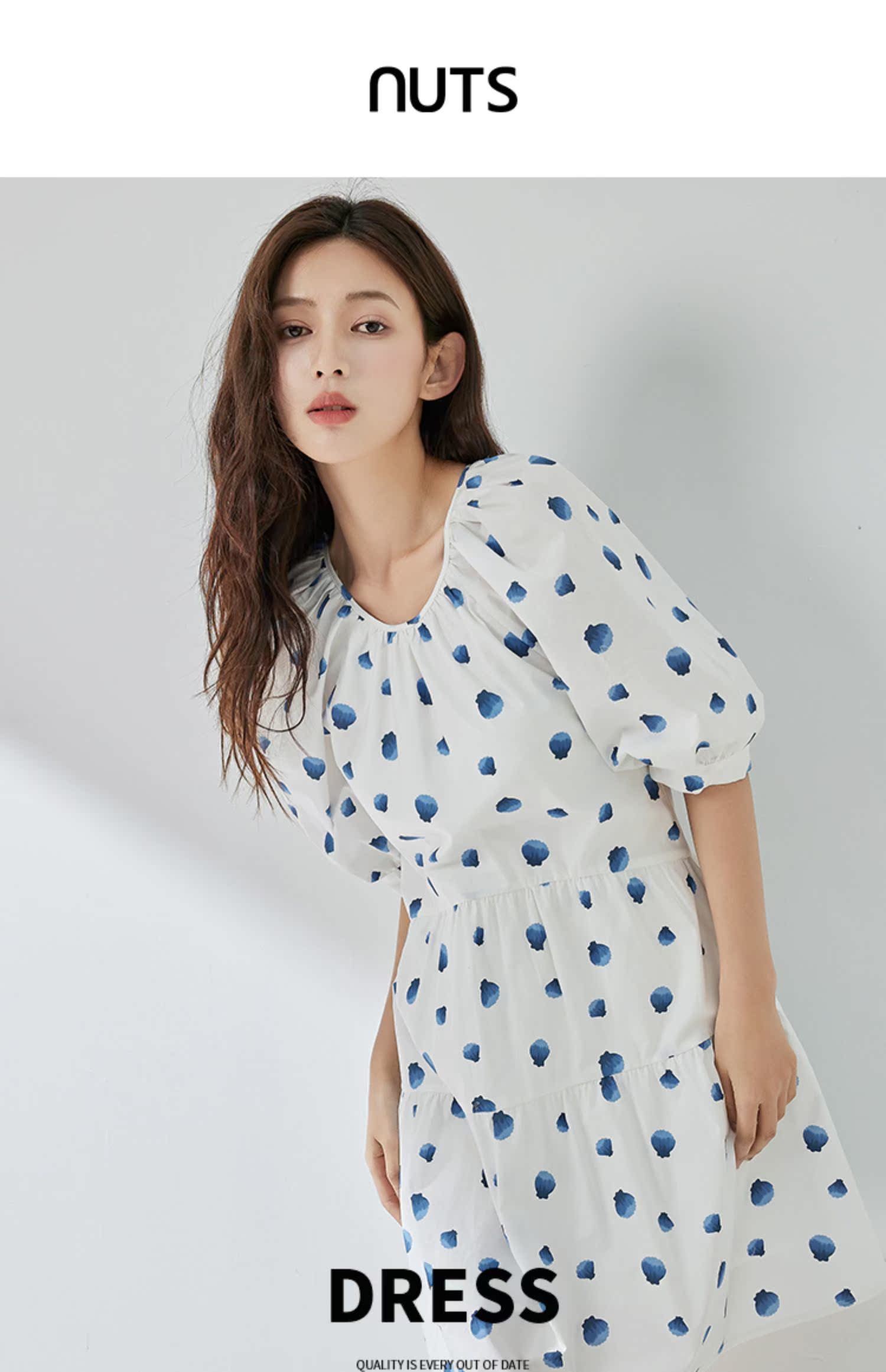 NUTS夏季新款气质圆领泡泡袖高腰显瘦圆点连衣裙324101175B