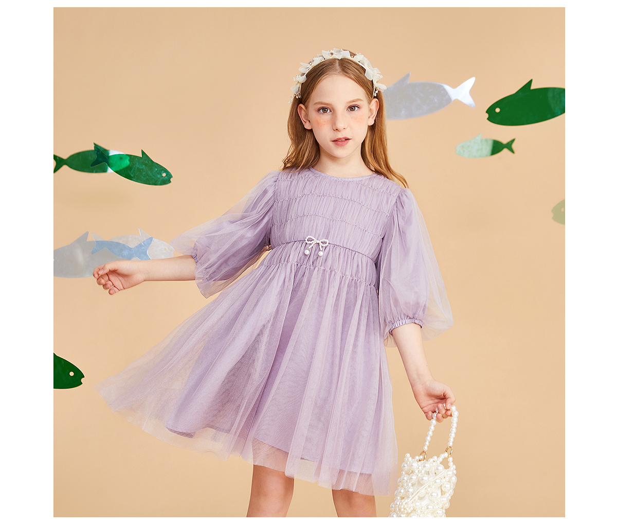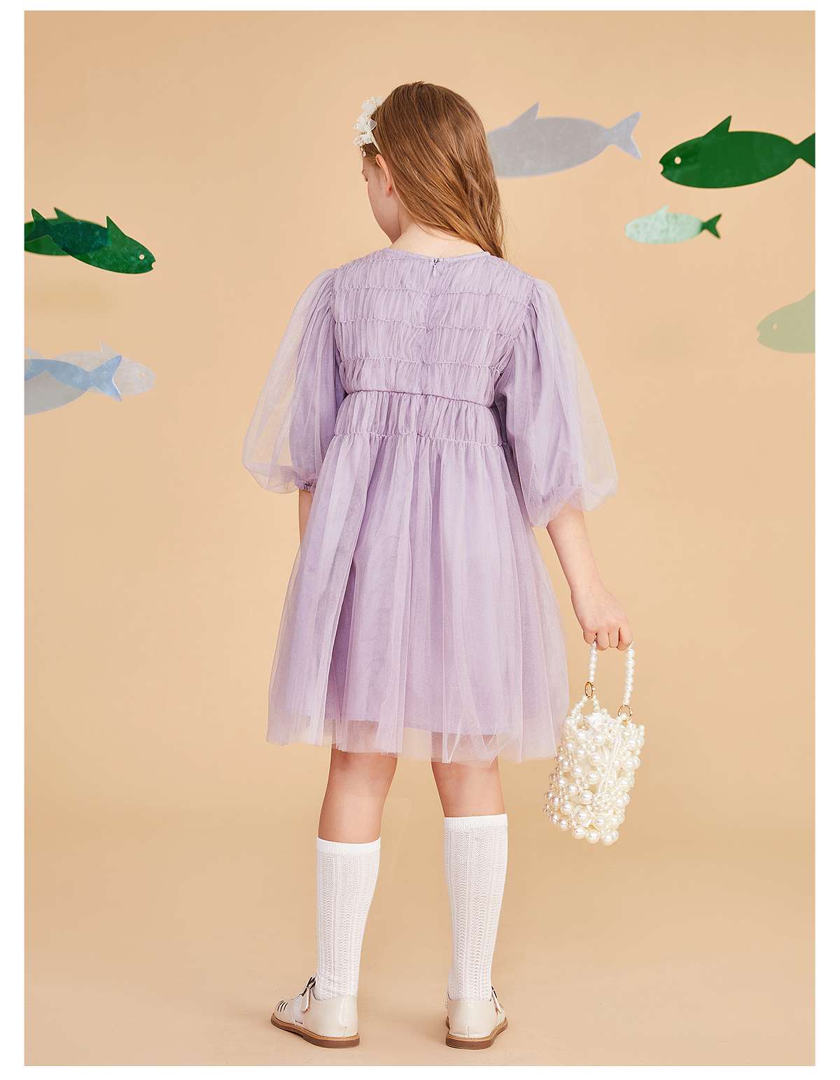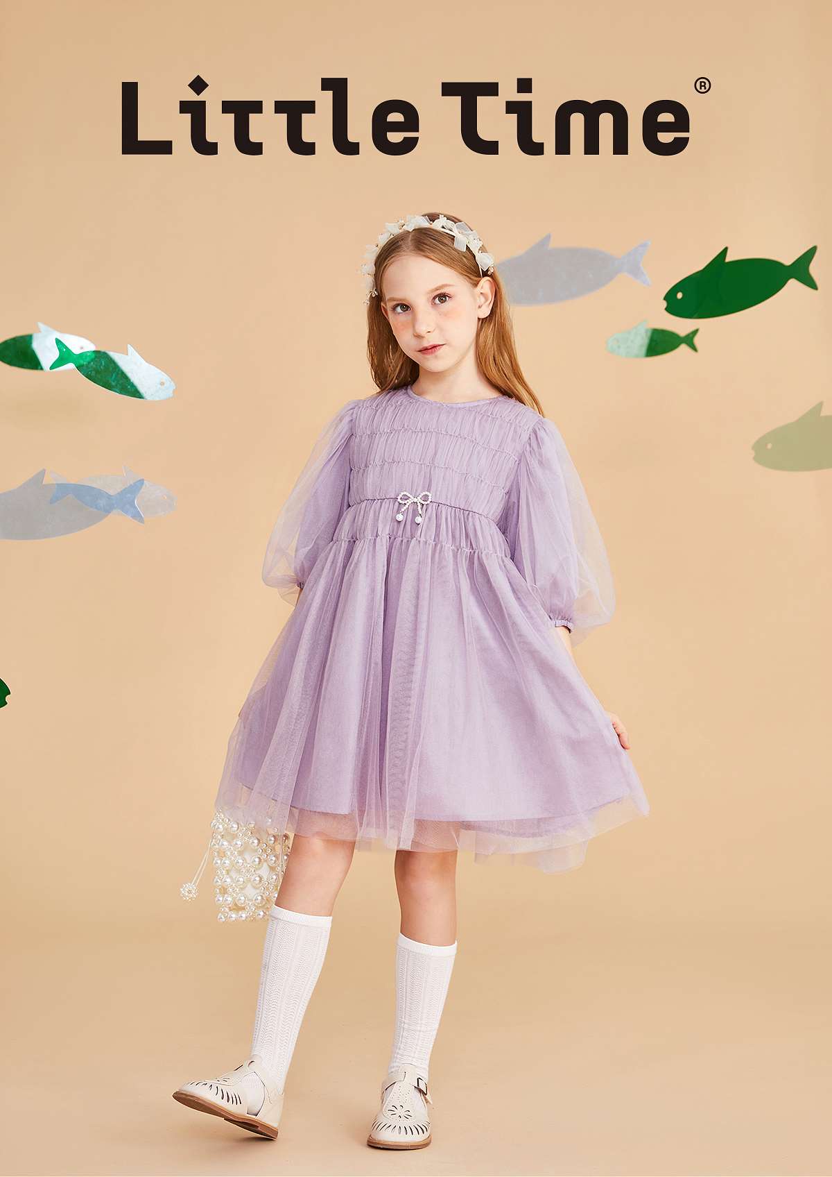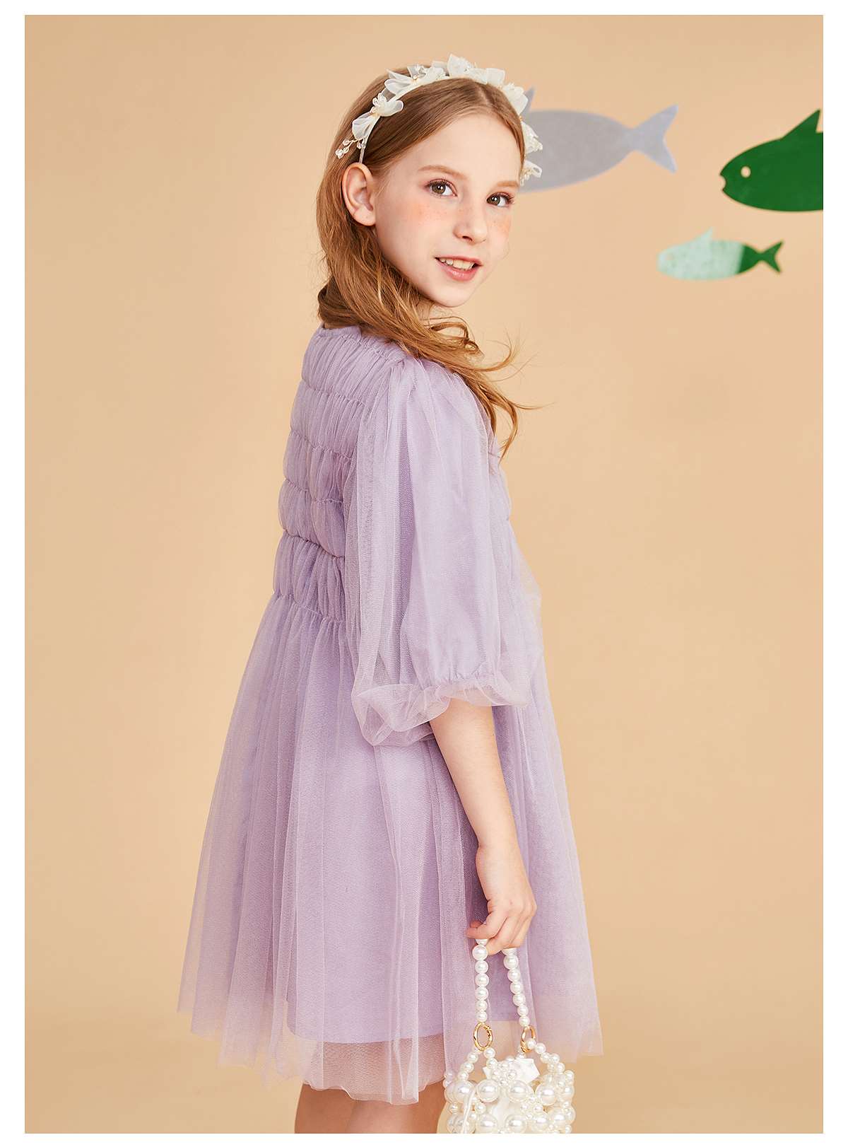 littletime儿童超仙紫色七分袖网纱公主裙春夏新款女童连衣裙