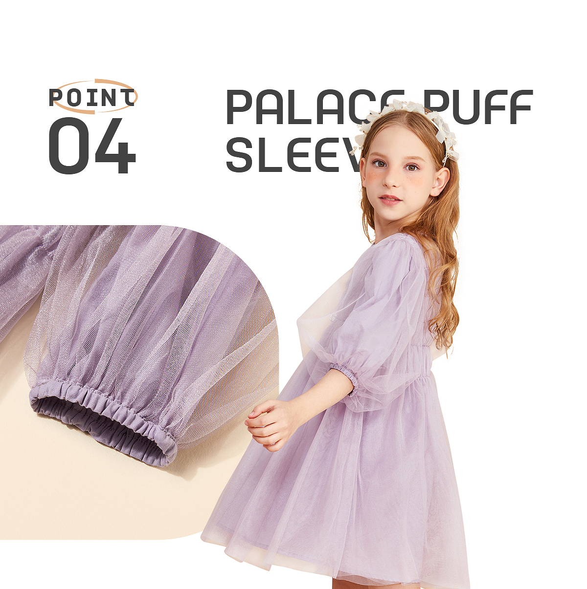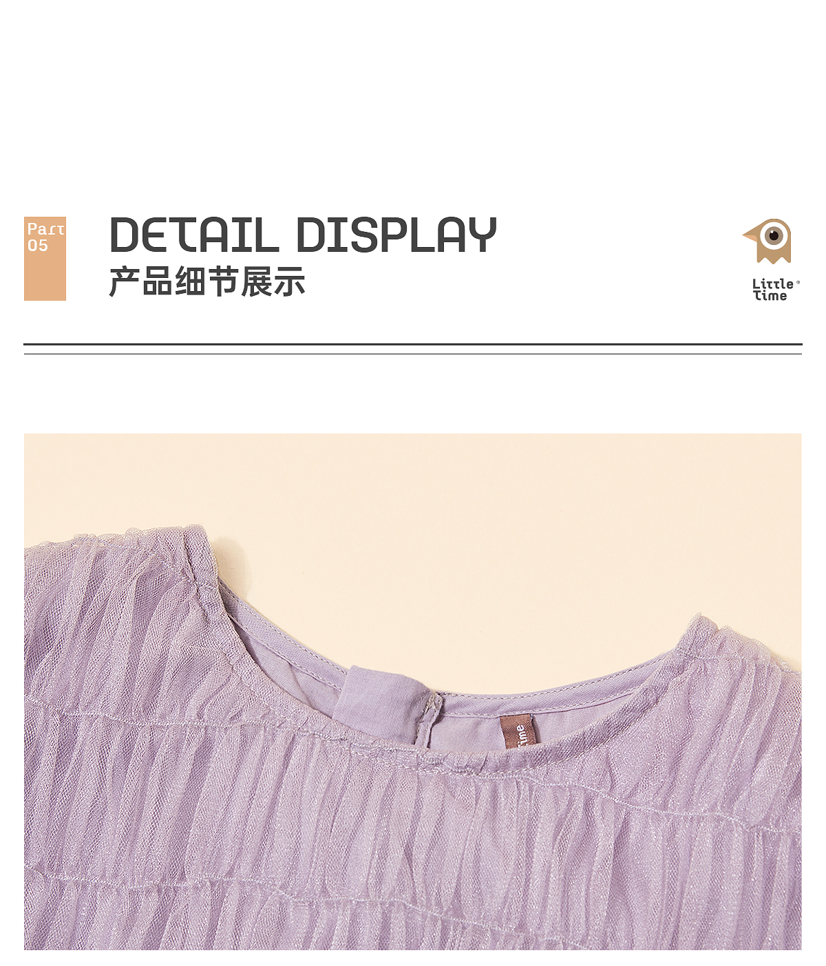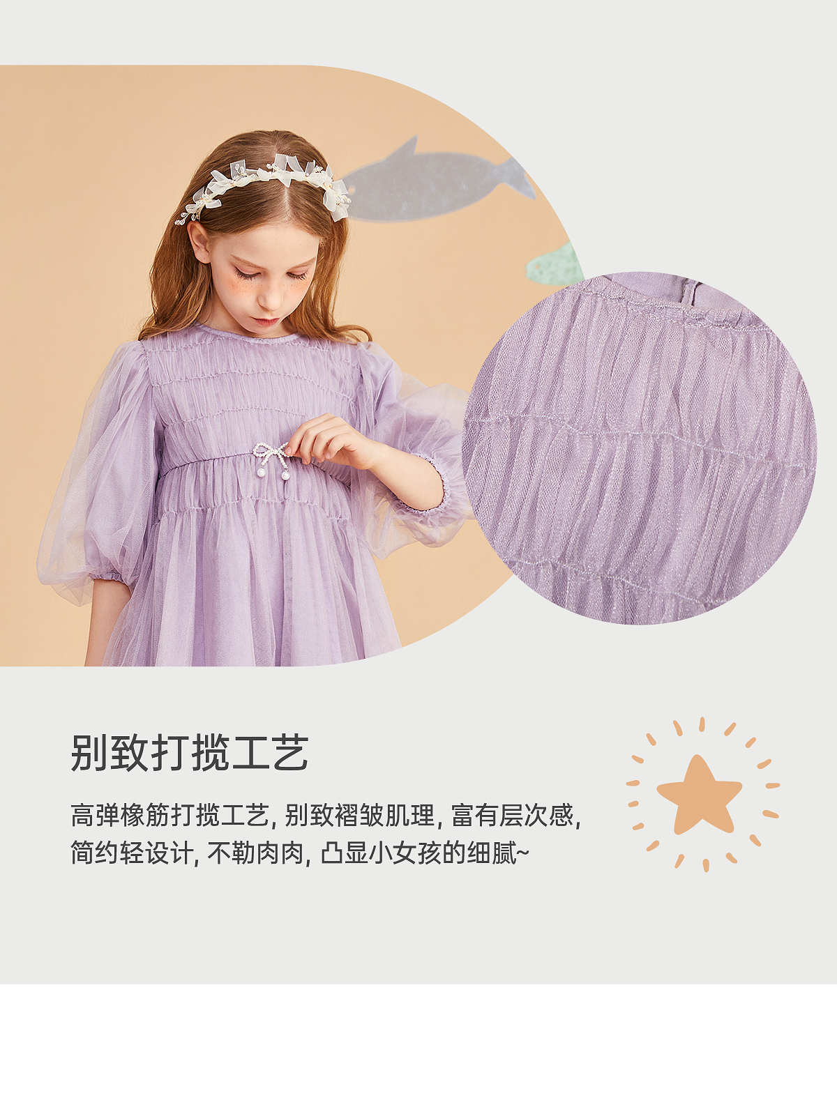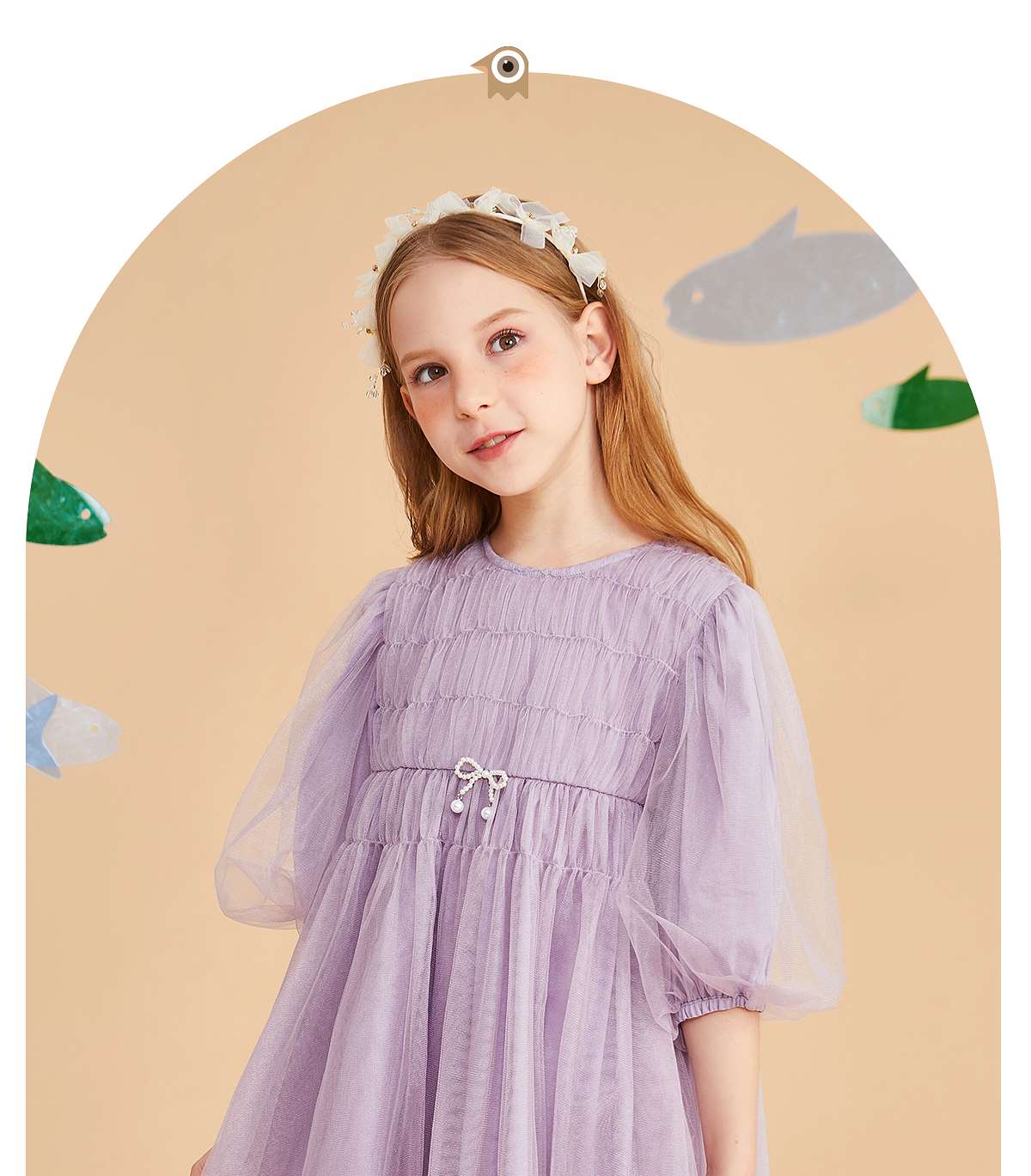littletime儿童超仙紫色七分袖网纱公主裙春夏新款女童连衣裙