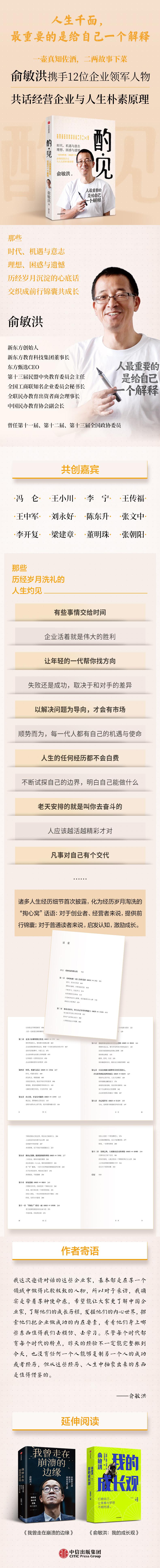 《酌见》是一本新东方创始人俞敏洪与国内十二位知名企业家人生经验沉淀集。著作围绕企业家与所属企业,探讨公司经营、团队管理、个人成长到人生智慧等各种话题,深度挖掘企业家内心深处的真实世界,将其人生、创业中的重要心得与体会以亲和有温度地方式呈现出来。所选取的企业以及企业家,如陈东升、董明珠、梁建章、张文中等,均为公众所熟智,经历过岁月淘洗的“掏心窝话语”,将企业家鲜为人知啦一些认知、智慧、教训拉家常式道出,尤其很多还是第一次坦诚吐露,内容宝贵,对于创业者、经营者来说提供前行者参考,对于普通读者来说,启发认智,激励成长。