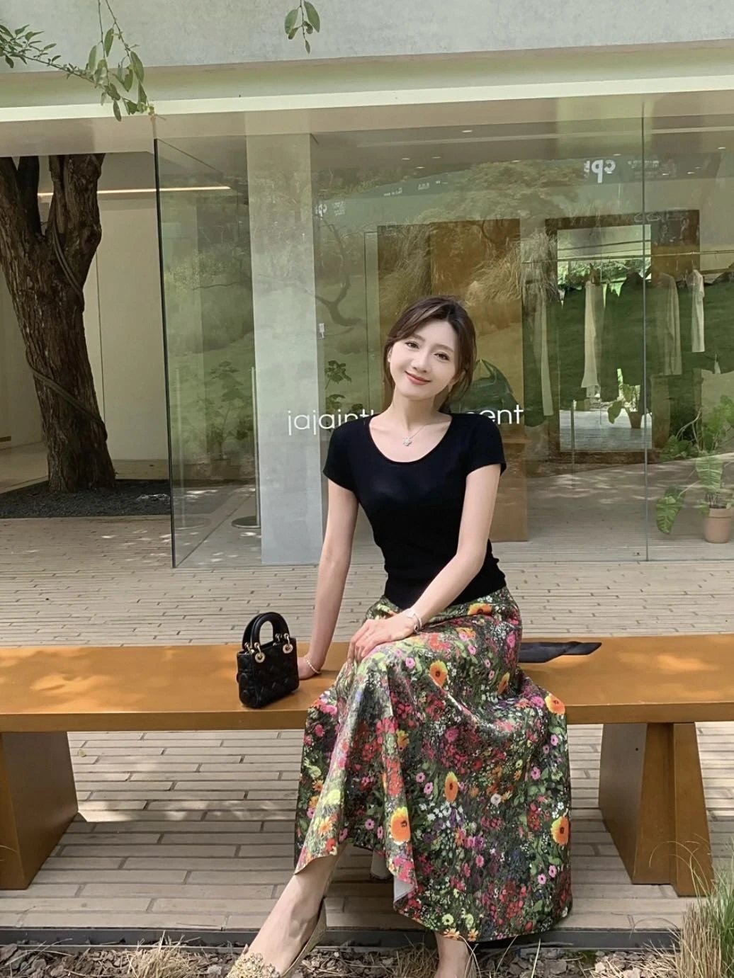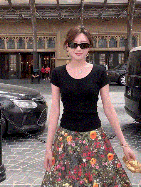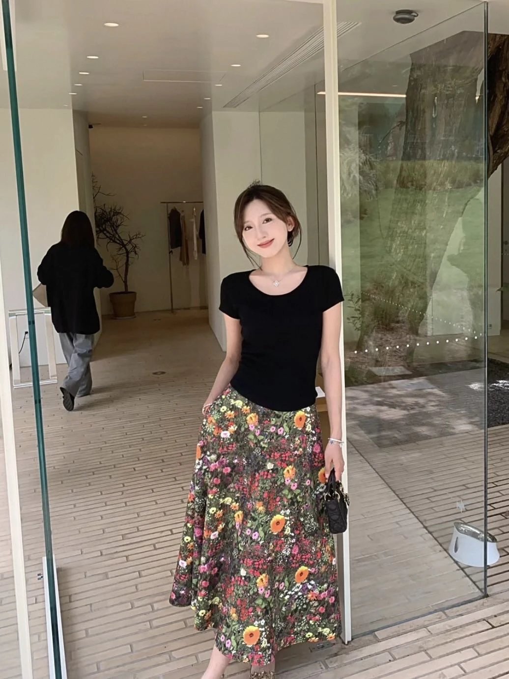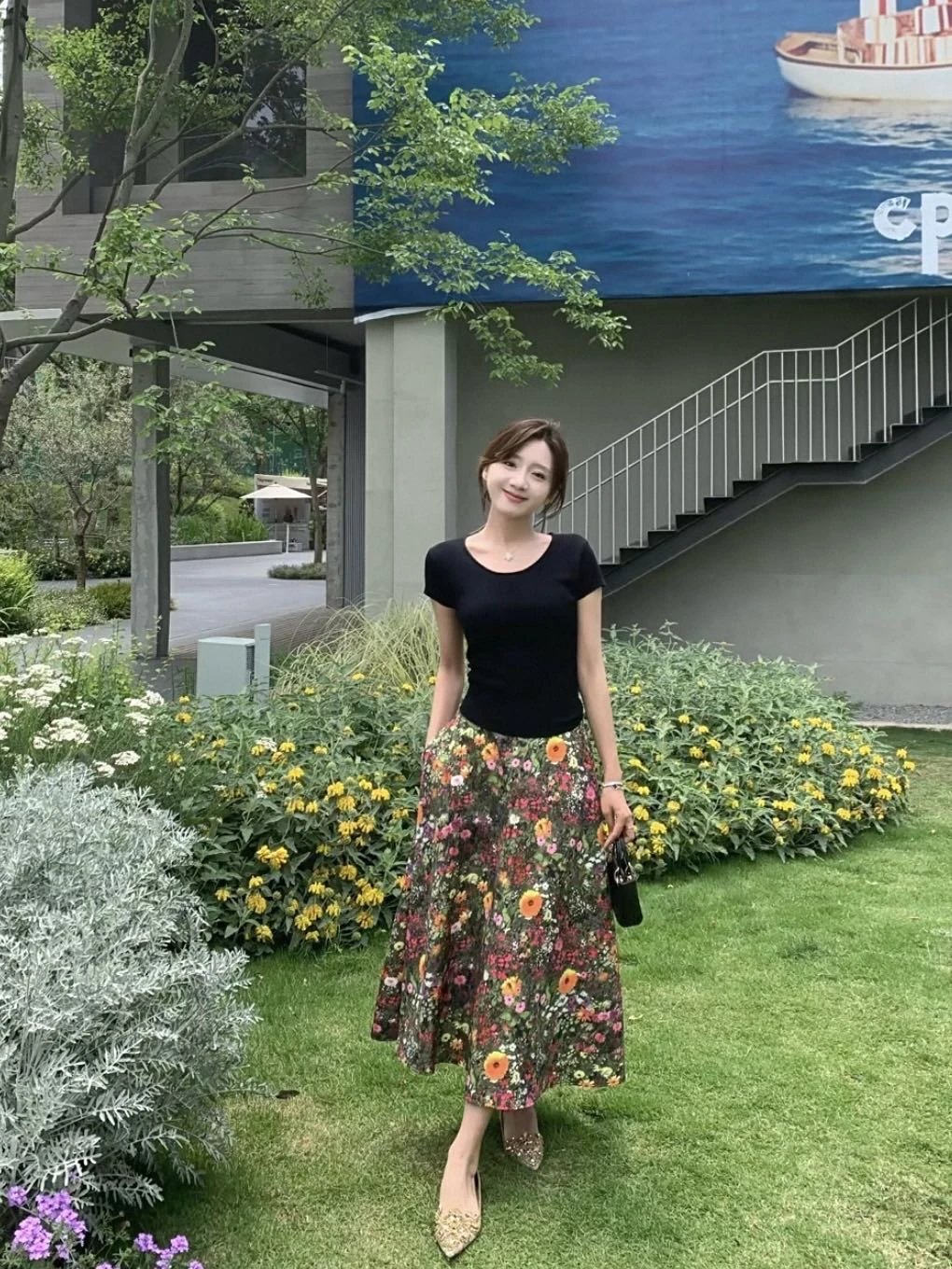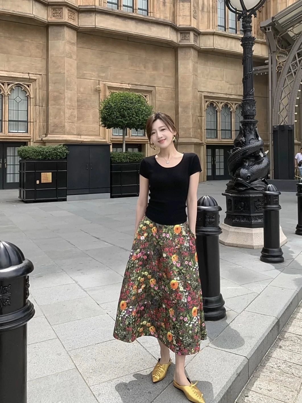 优雅摇曳的浪漫印花半身裙搭配黑色短袖