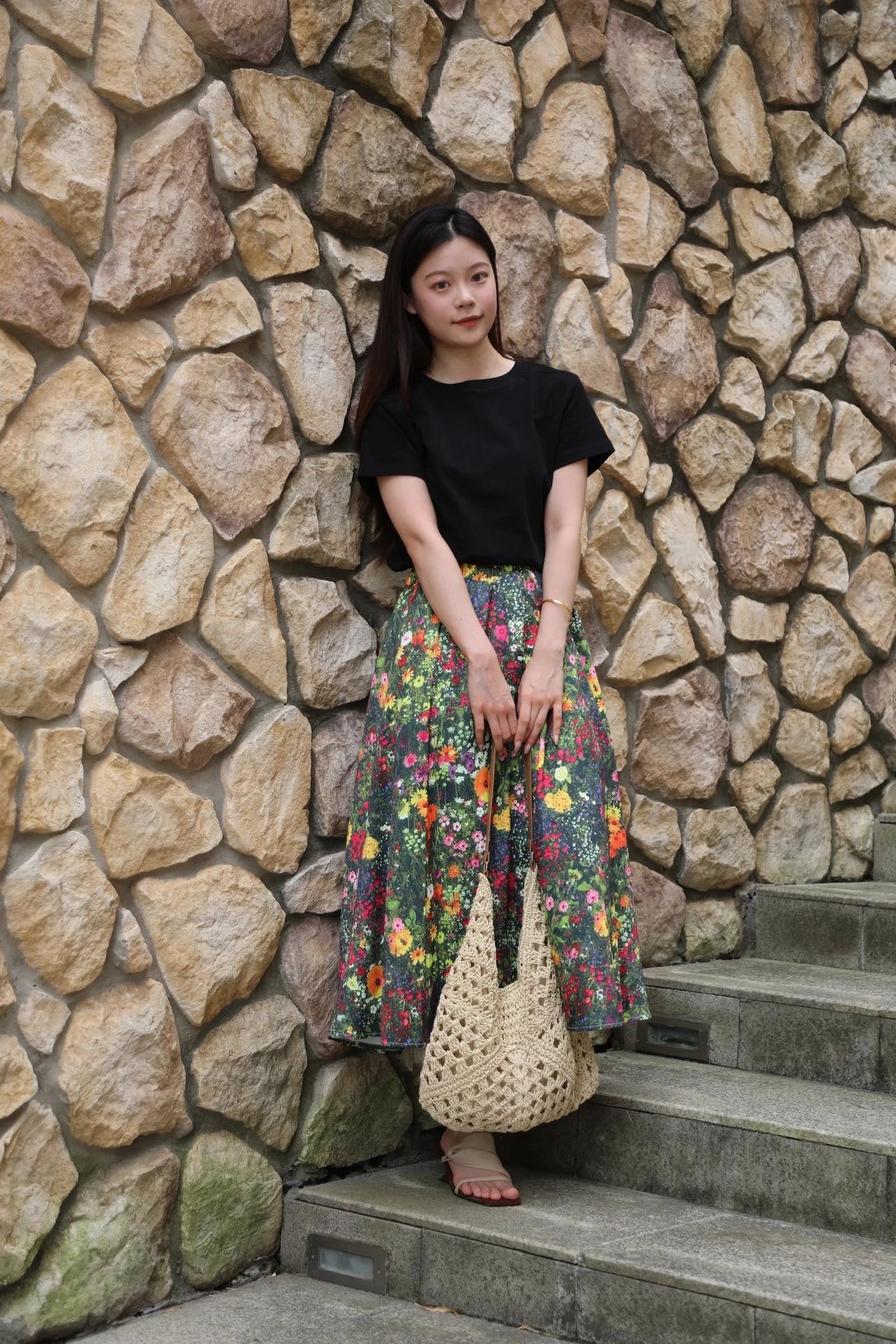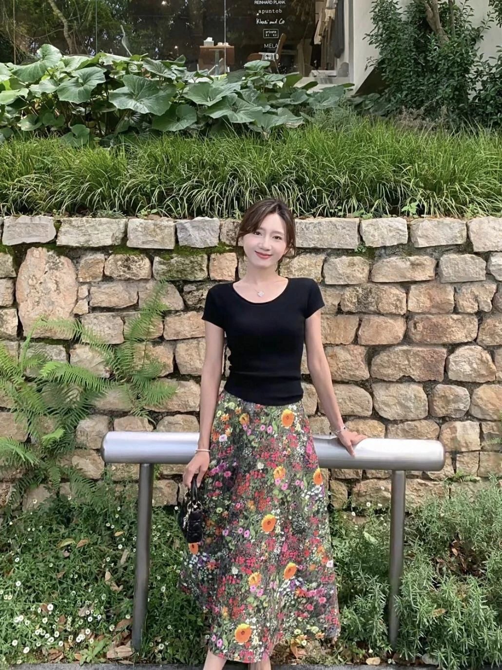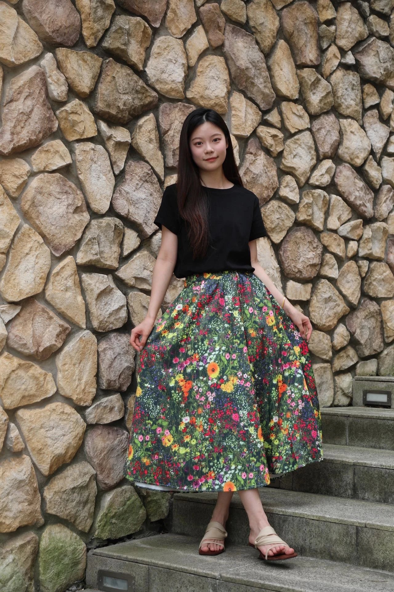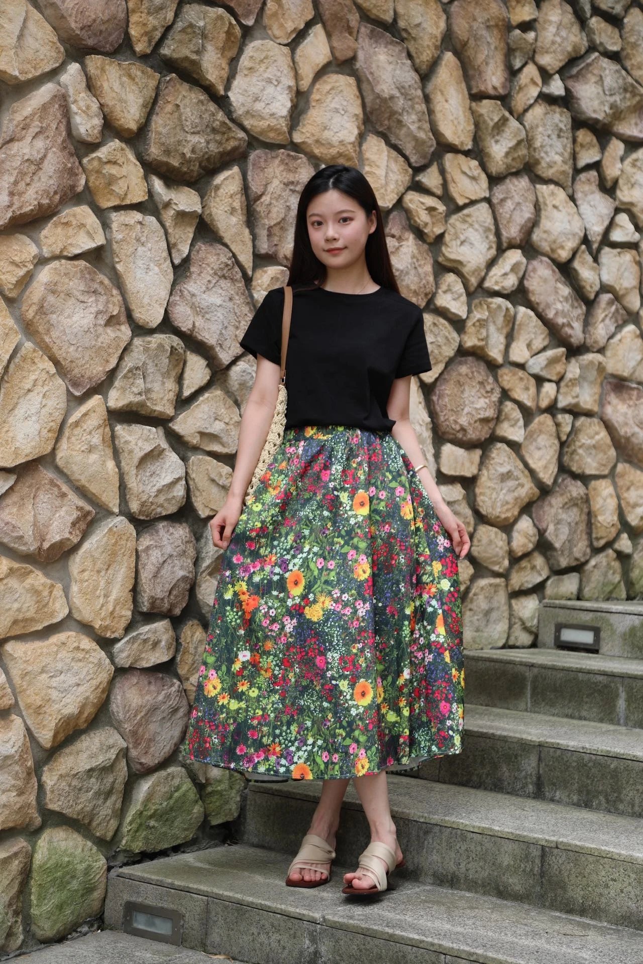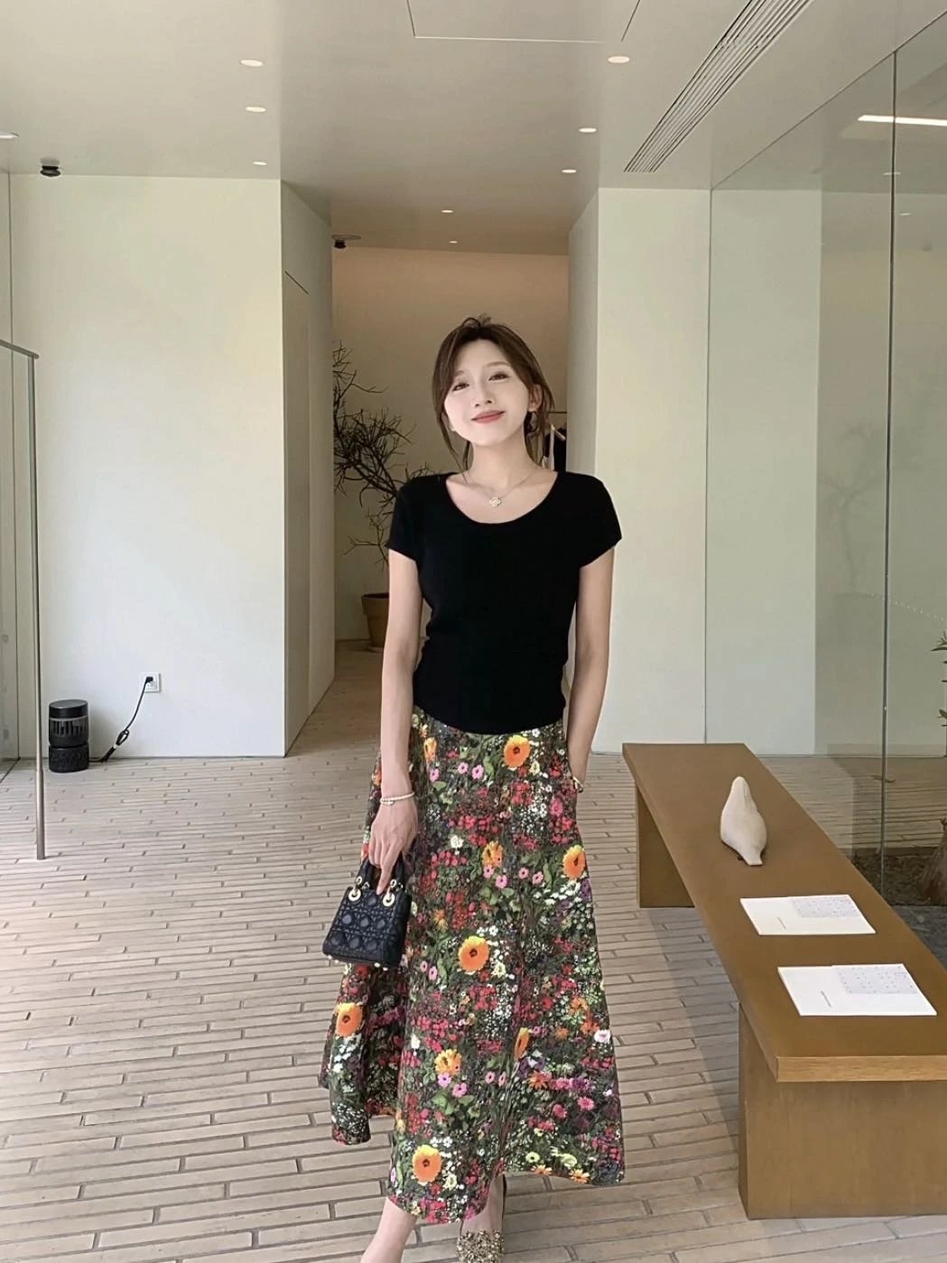 优雅摇曳的浪漫印花半身裙搭配黑色短袖