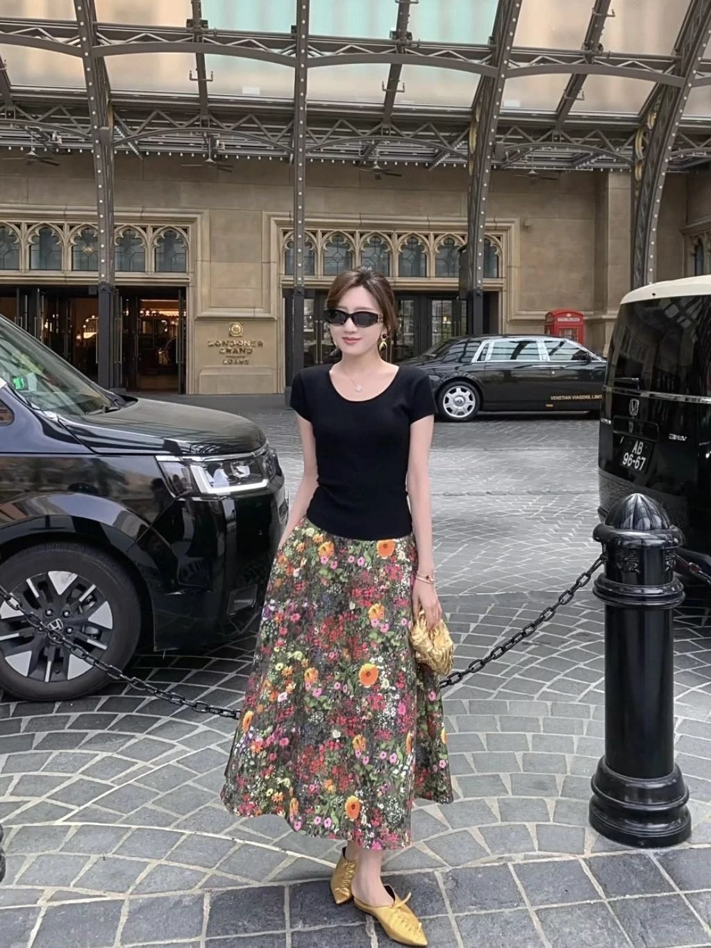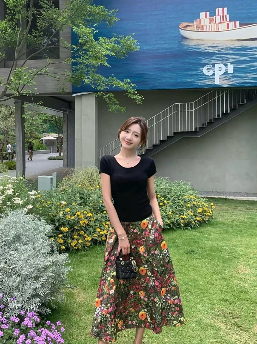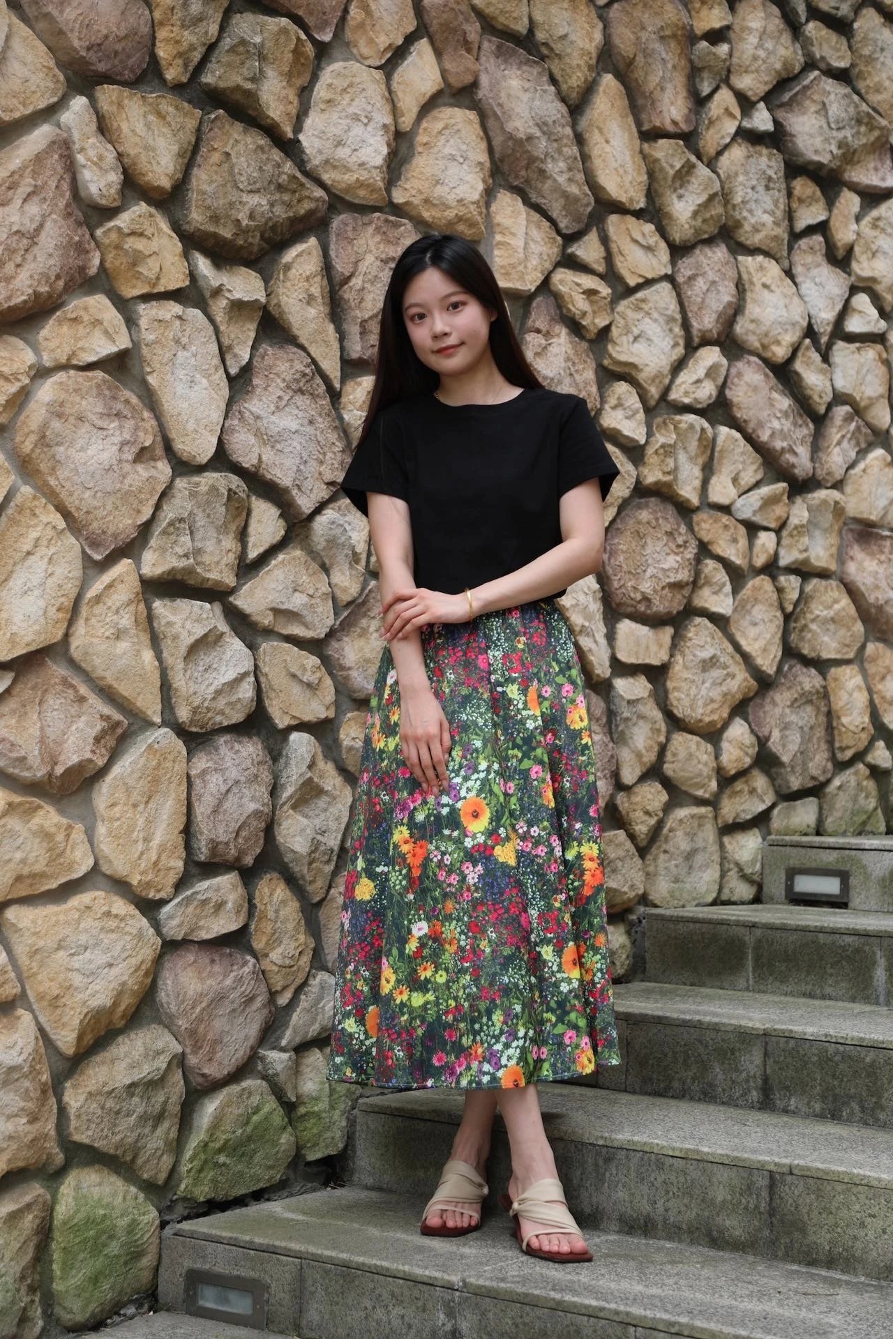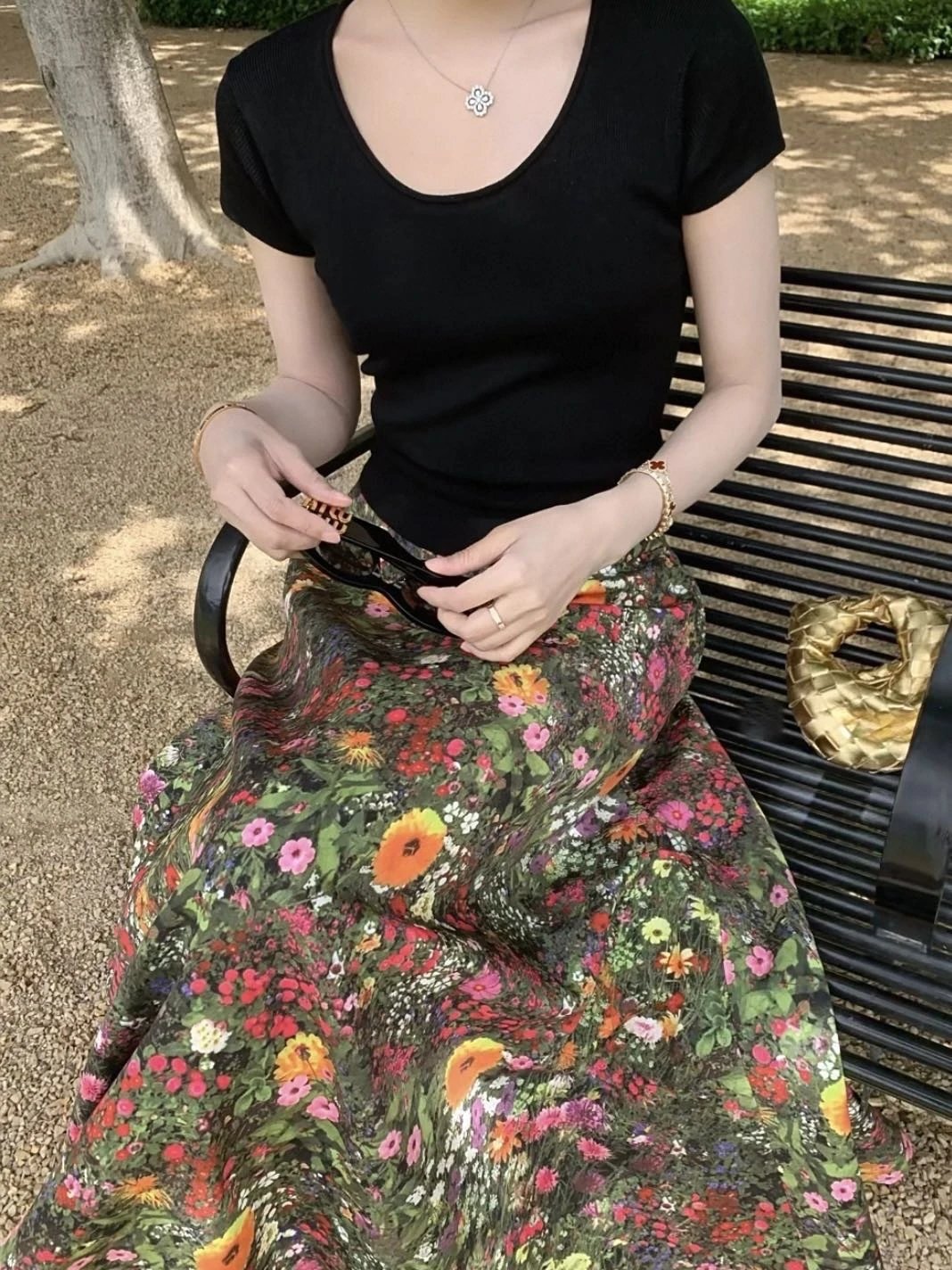 优雅摇曳的浪漫印花半身裙搭配黑色短袖