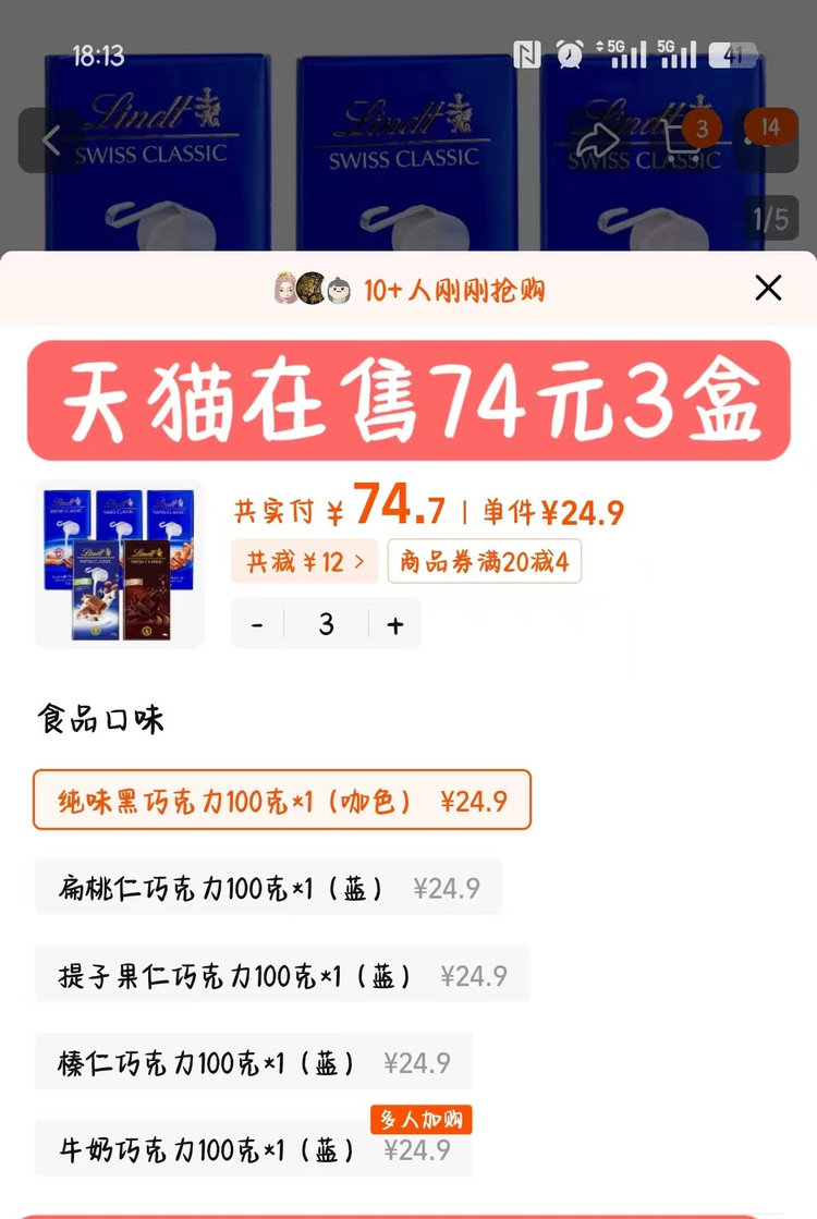 29.9💰2板,临期秒【Lindt瑞士莲经典排装巧克力】效期2026.8.6✅低糖低脂,抑制食欲 ✅入口即溶,口感细腻醇厚