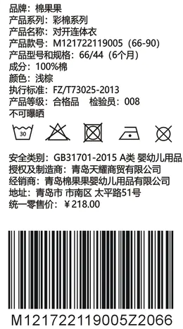 棉果果春秋款新疆彩棉男童女童 对开连体衣M121722119005