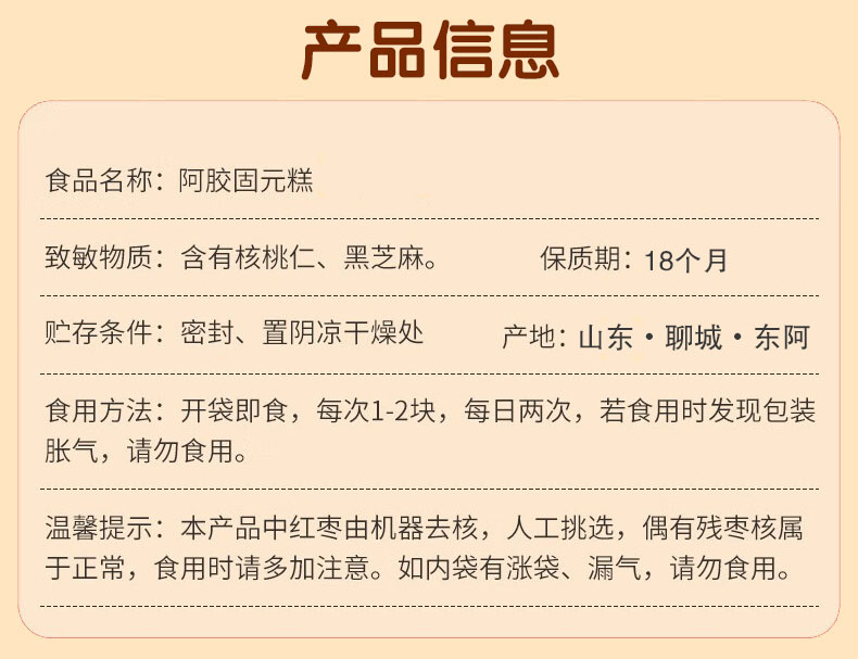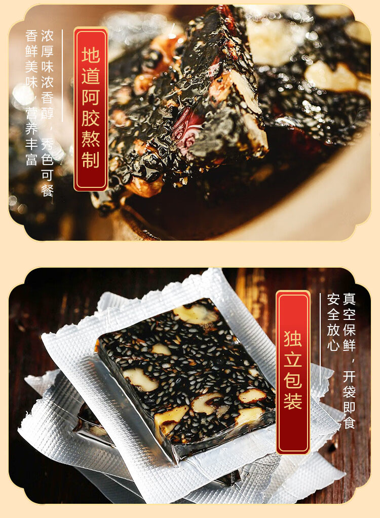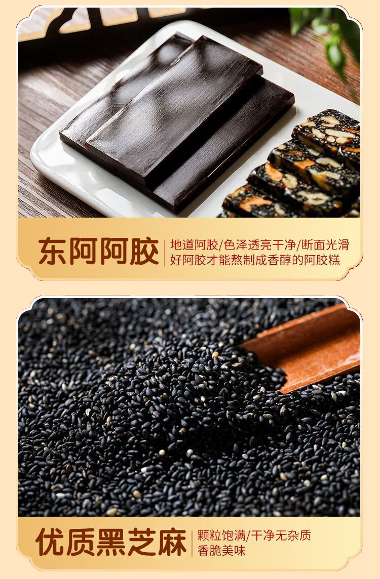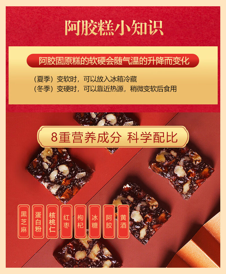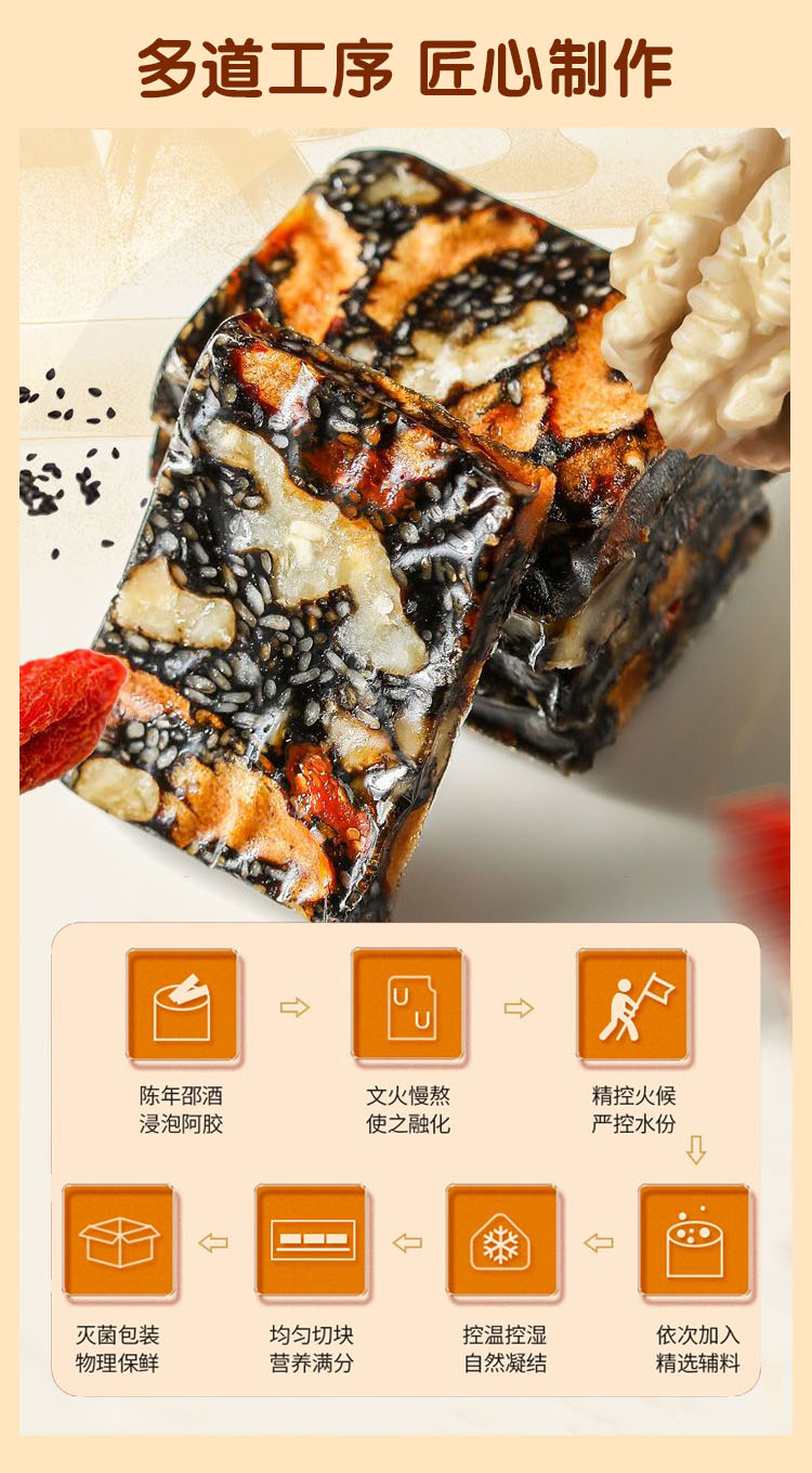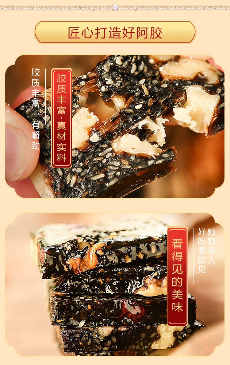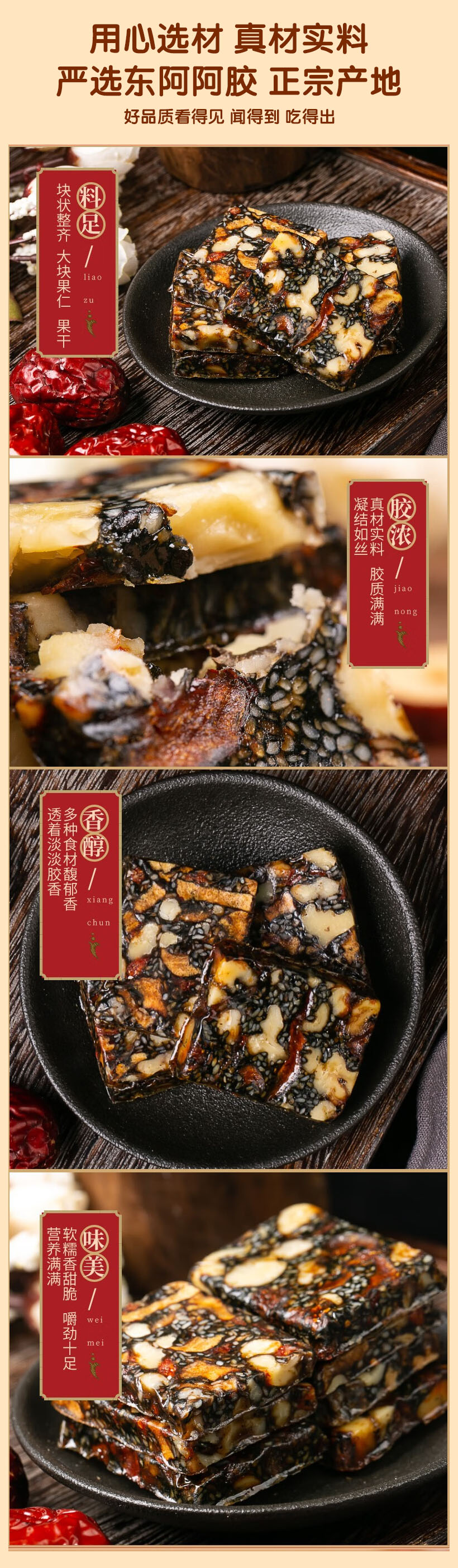 D阿胶固元糕,5盒组合,源自“阿胶之乡”山东东阿,正宗产地,添加多种其他营养食材,遵循古法熬制,匠心制作,多种营养加持,胶质丰富,口感浓厚香醇有嚼劲D