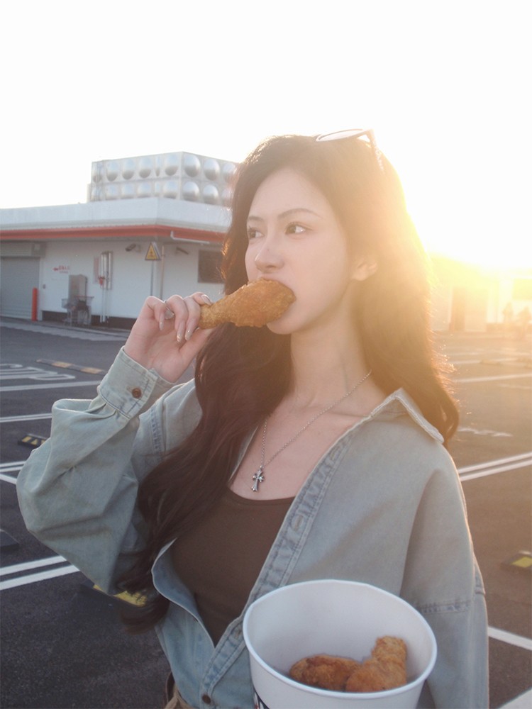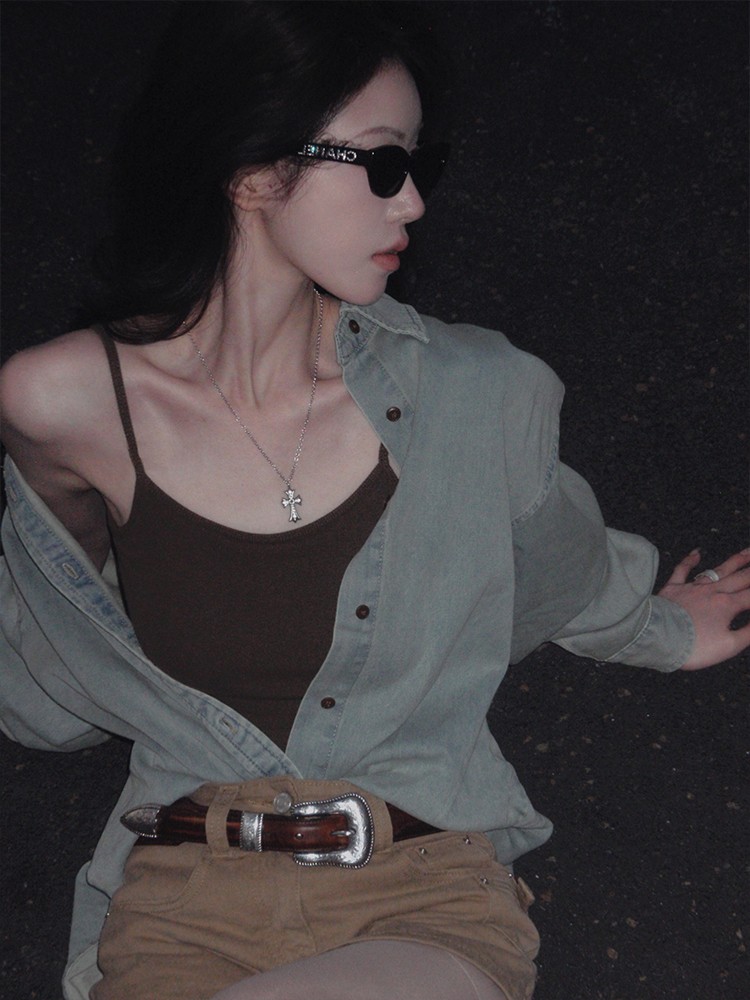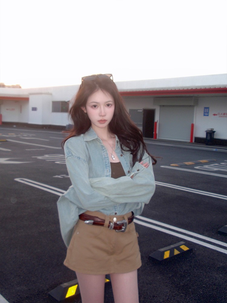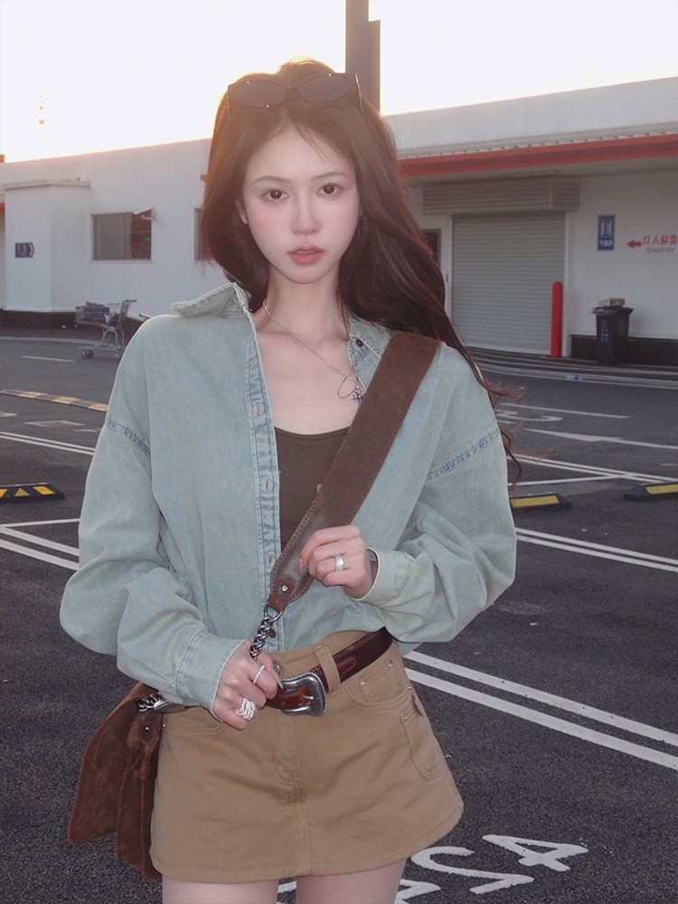 现货 薄荷丹宁 早春复古造型 水洗做旧牛仔衬衫+裙裤