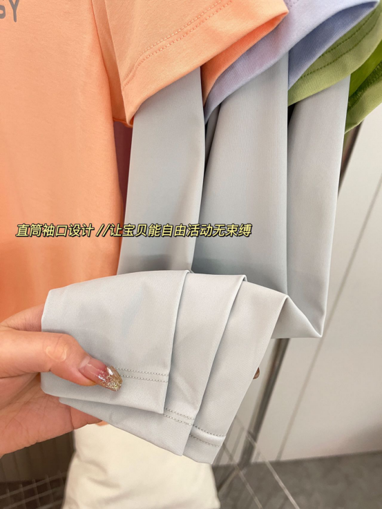 整体干净匀称的走线,经典圆领设计,不会变形,不磨脖子,不束缚的直筒袖口, 宝贝们穿起来也更加舒适~