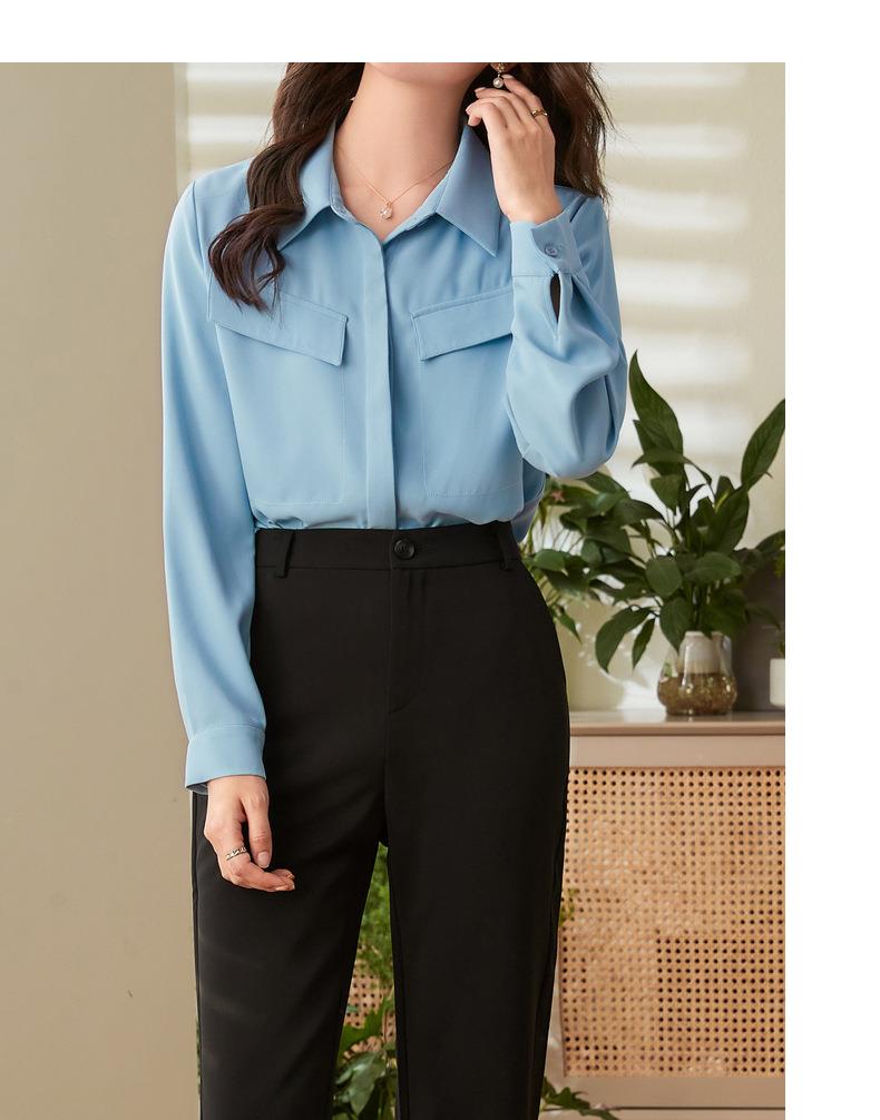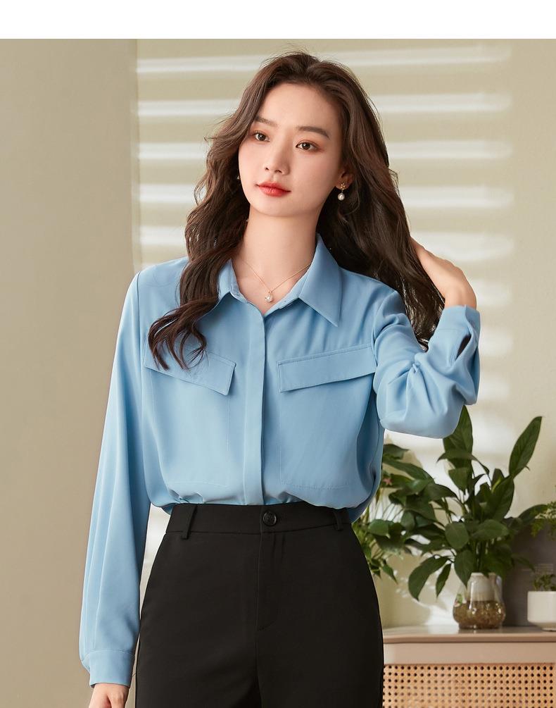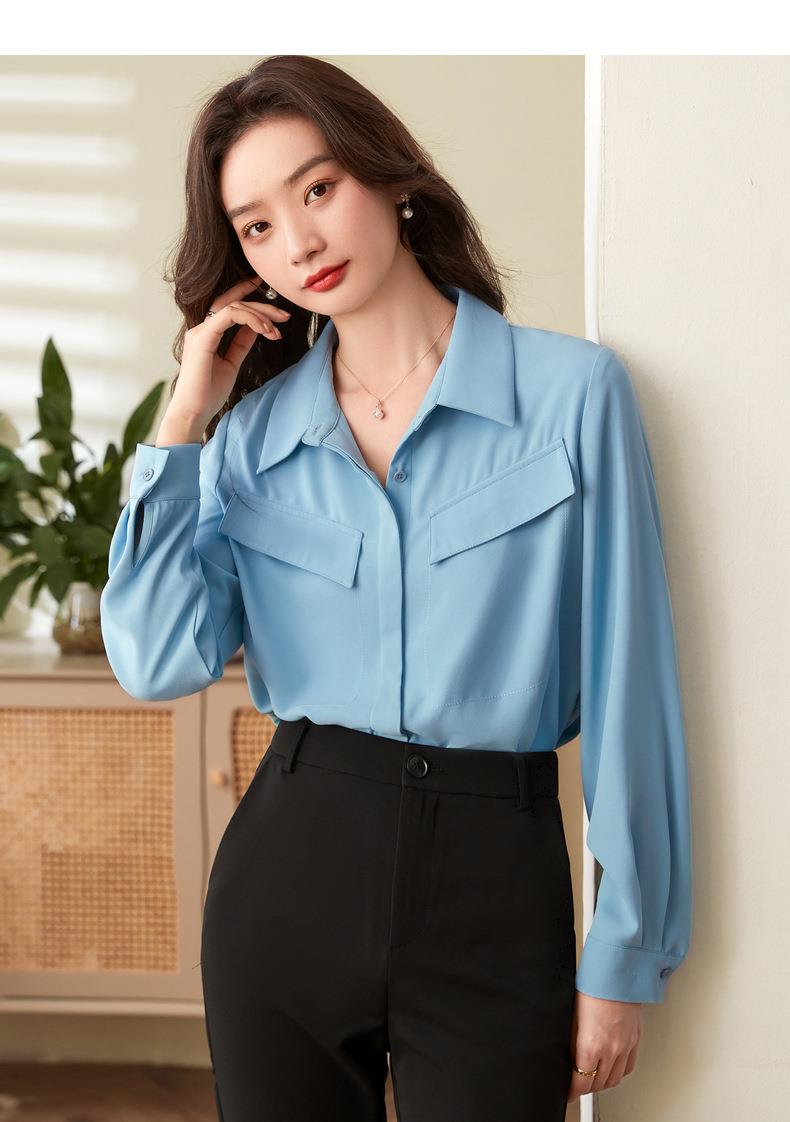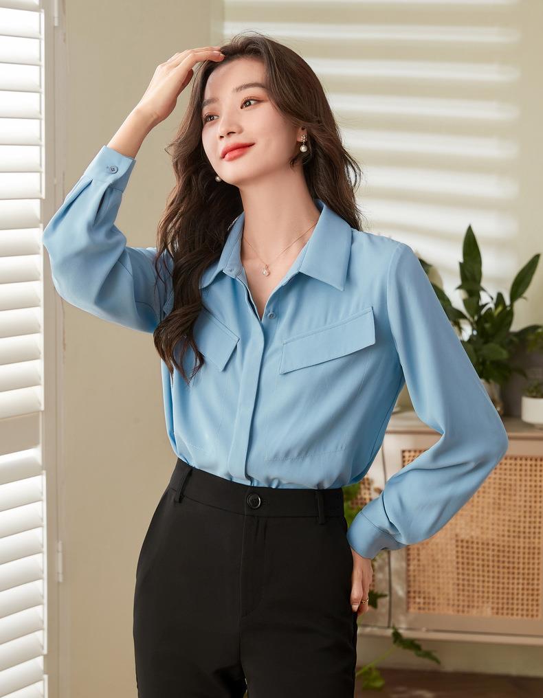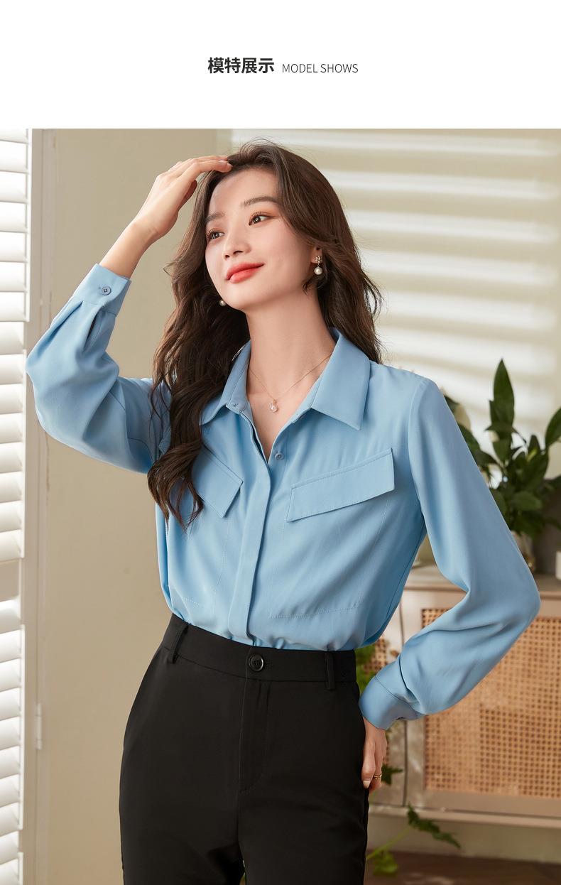 百姿 口袋长袖衬衫2023秋季新款韩版纯色翻领通勤百搭OL直筒衬衣