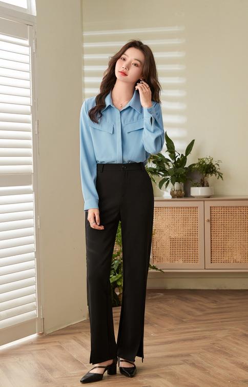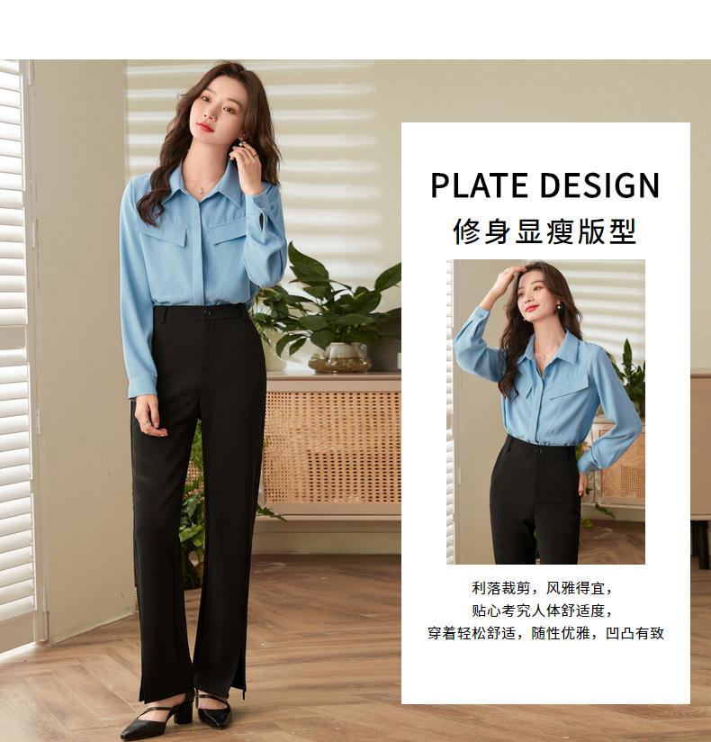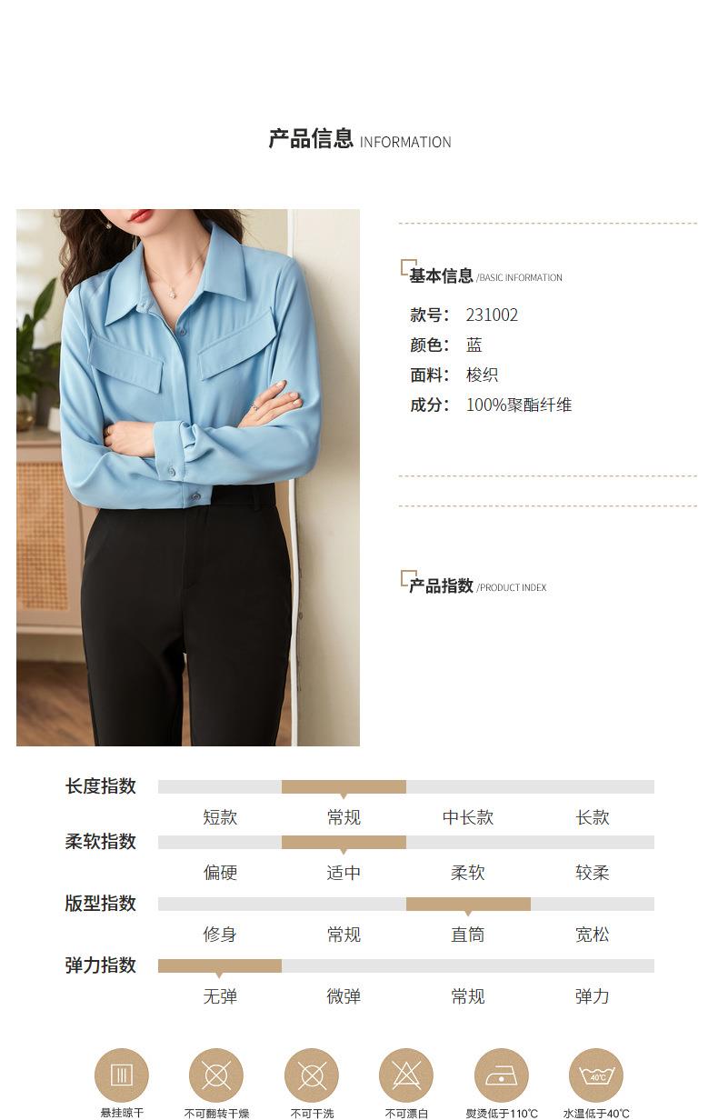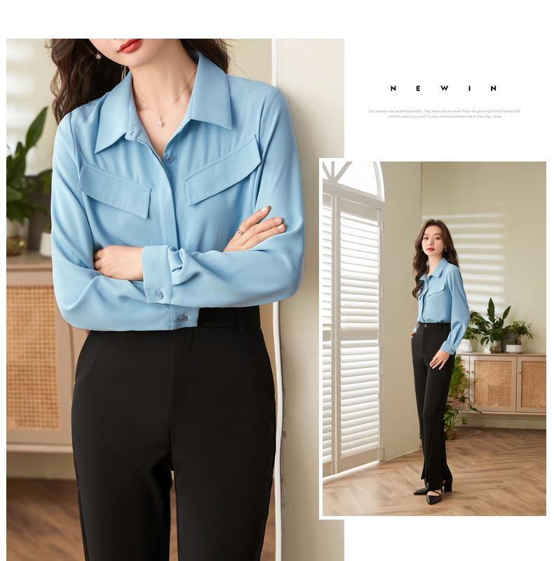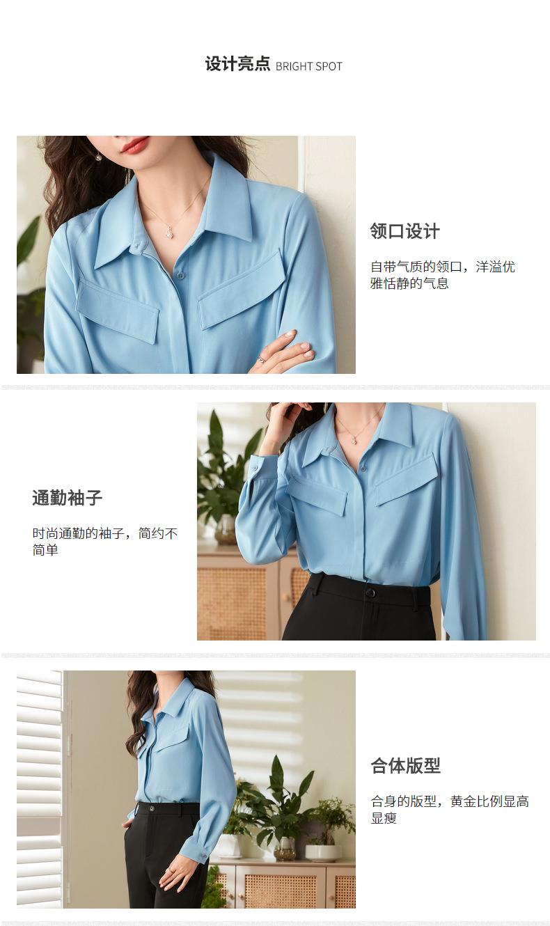 百姿 口袋长袖衬衫2023秋季新款韩版纯色翻领通勤百搭OL直筒衬衣