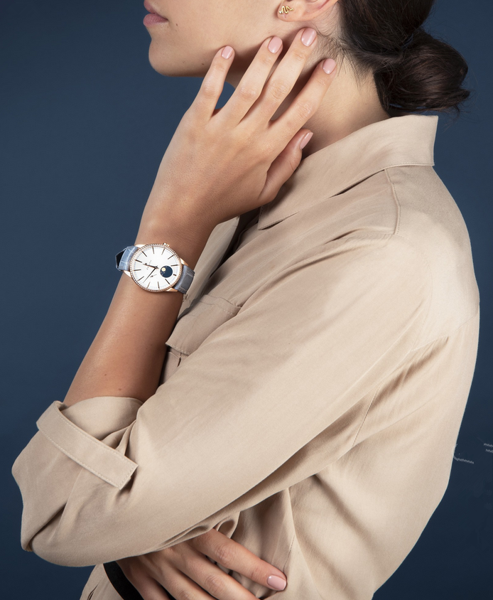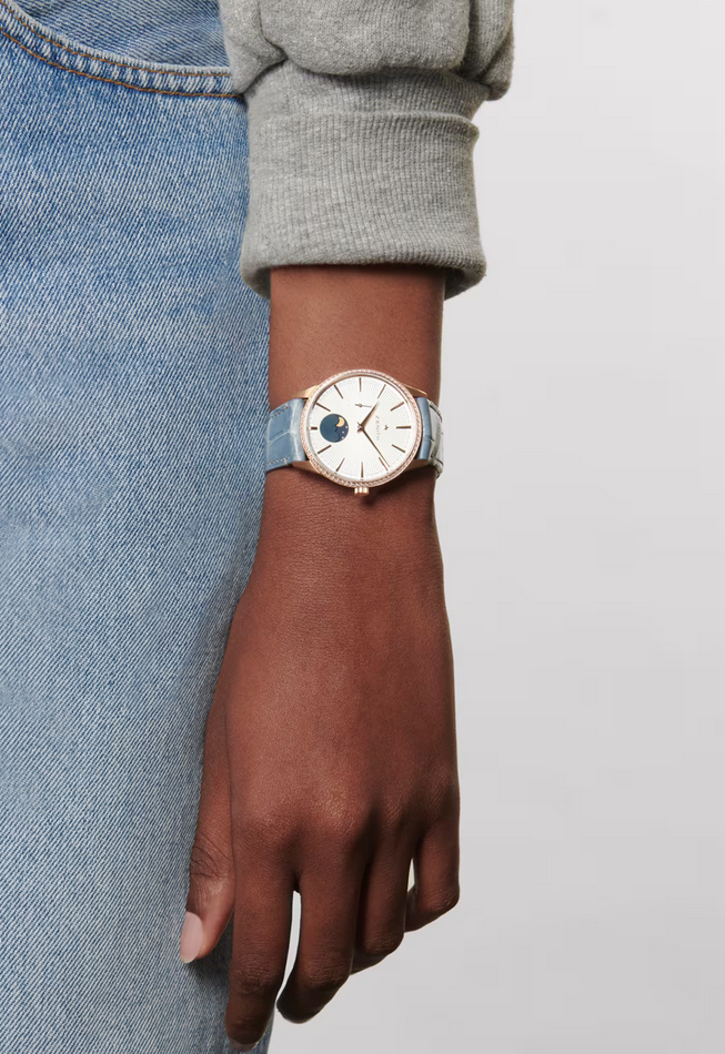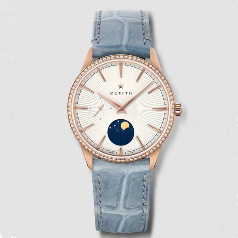 镜面 材质 | 蓝宝石水晶玻璃 | 表盘 | 18K玫瑰金表壳,镶钻表圈 银色太阳纹表盘,条形刻度,小秒针、月相显示 背透 |