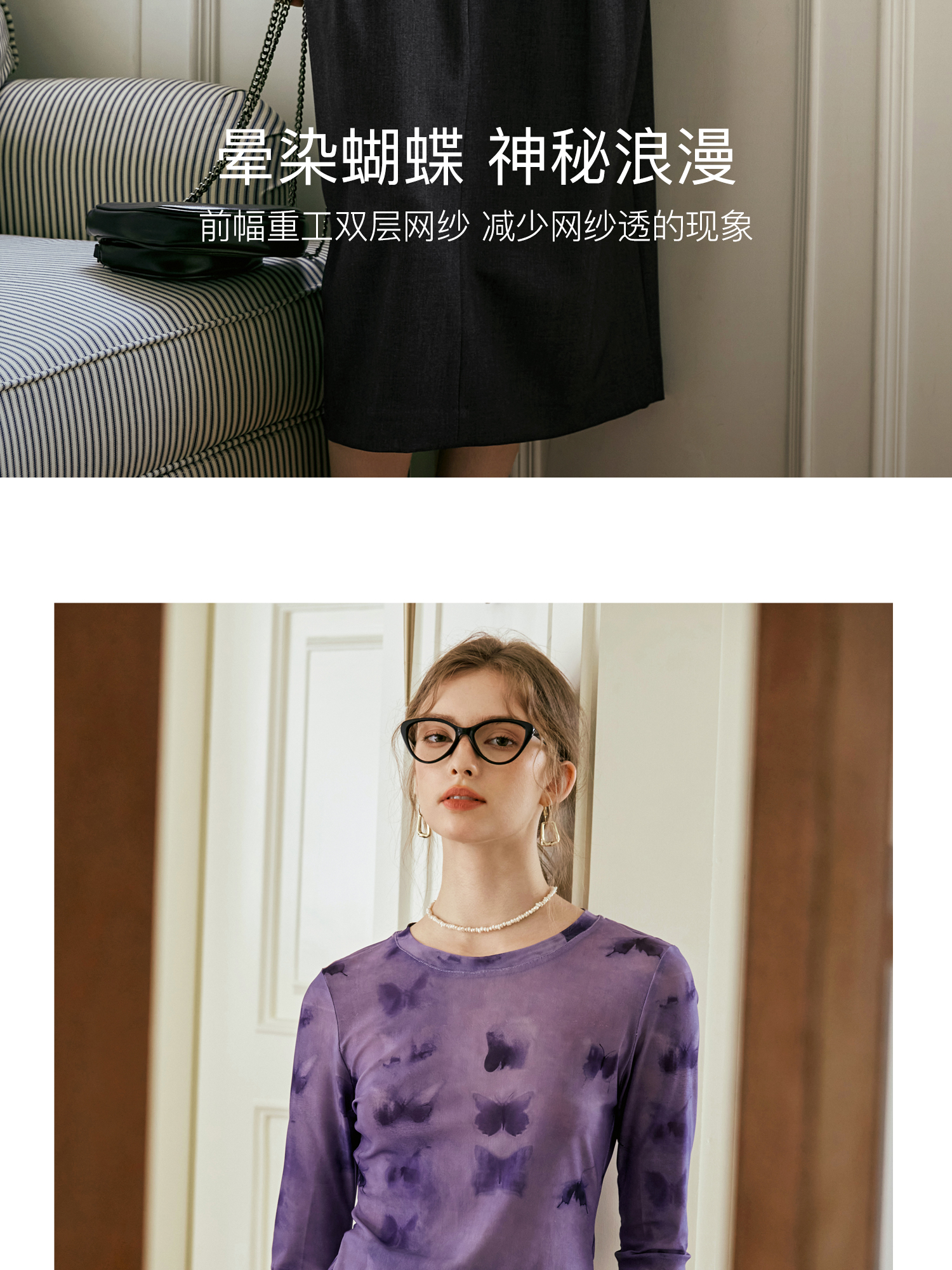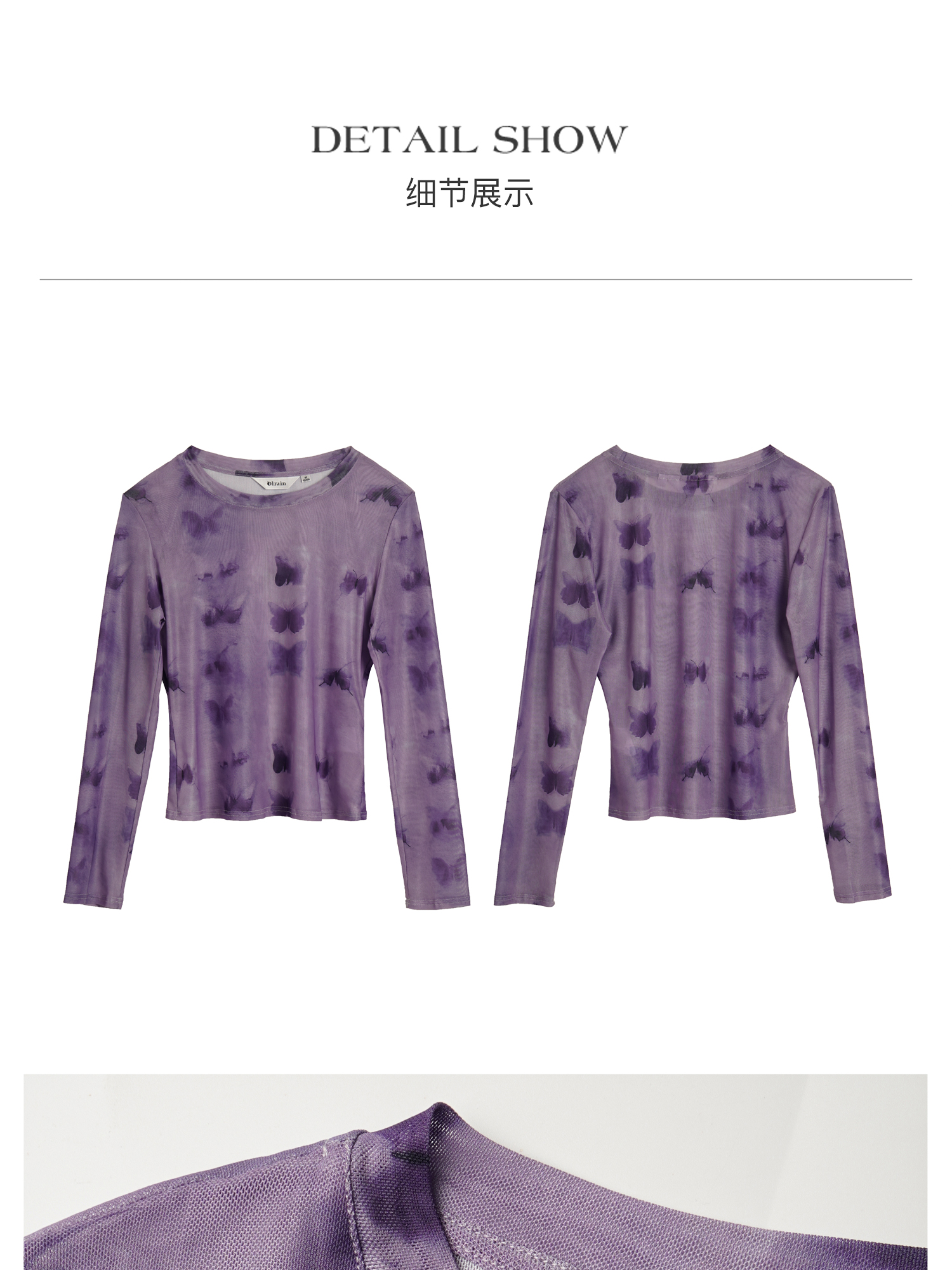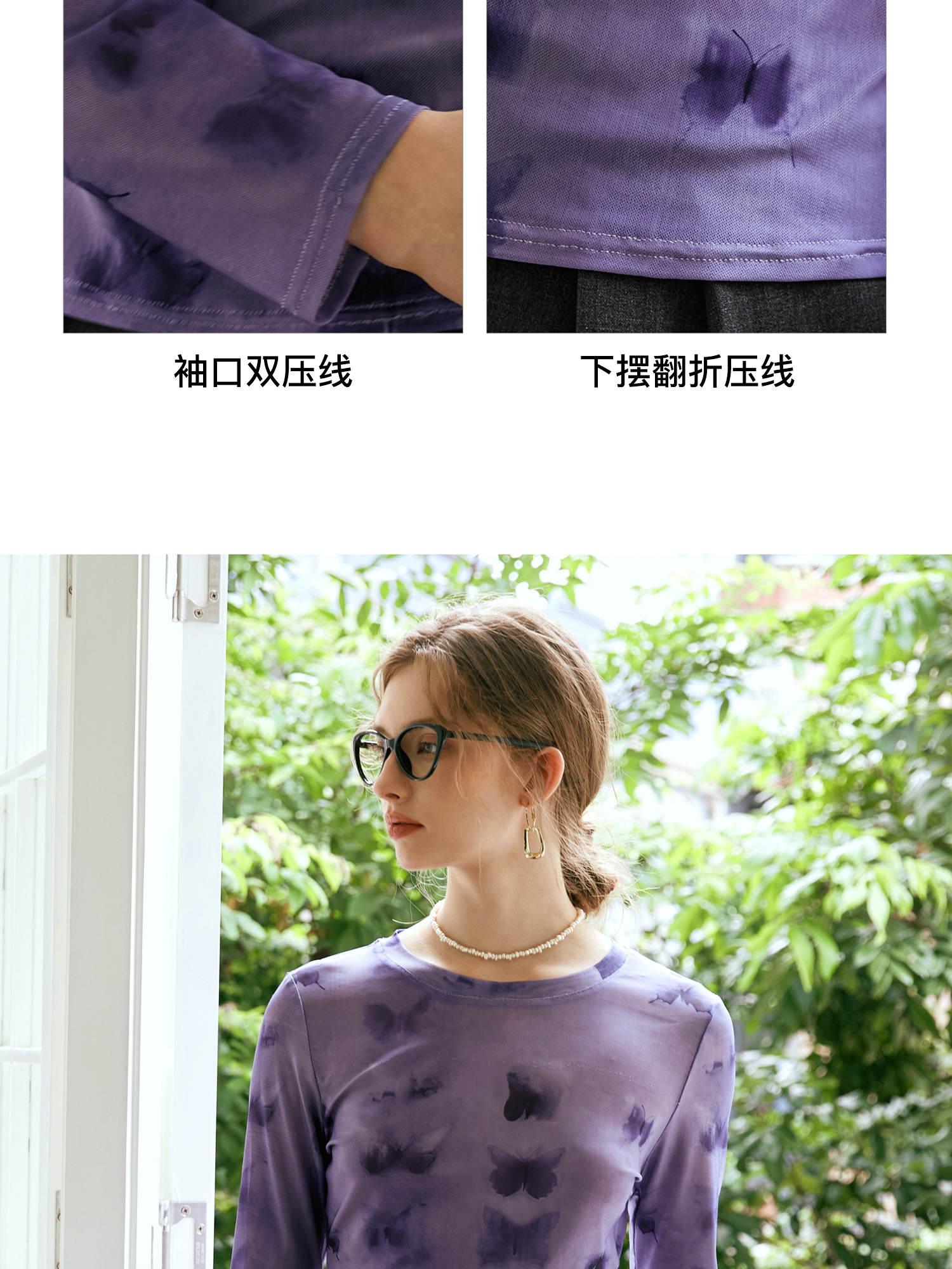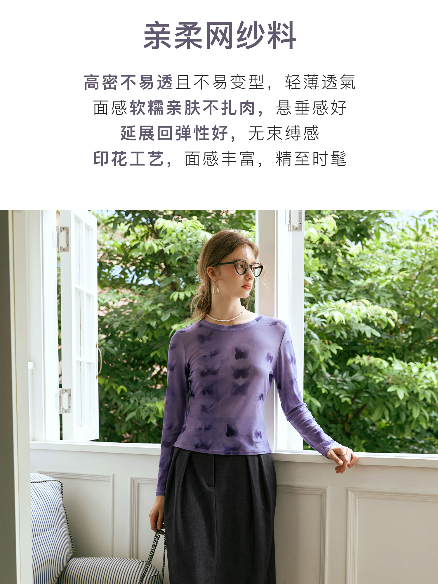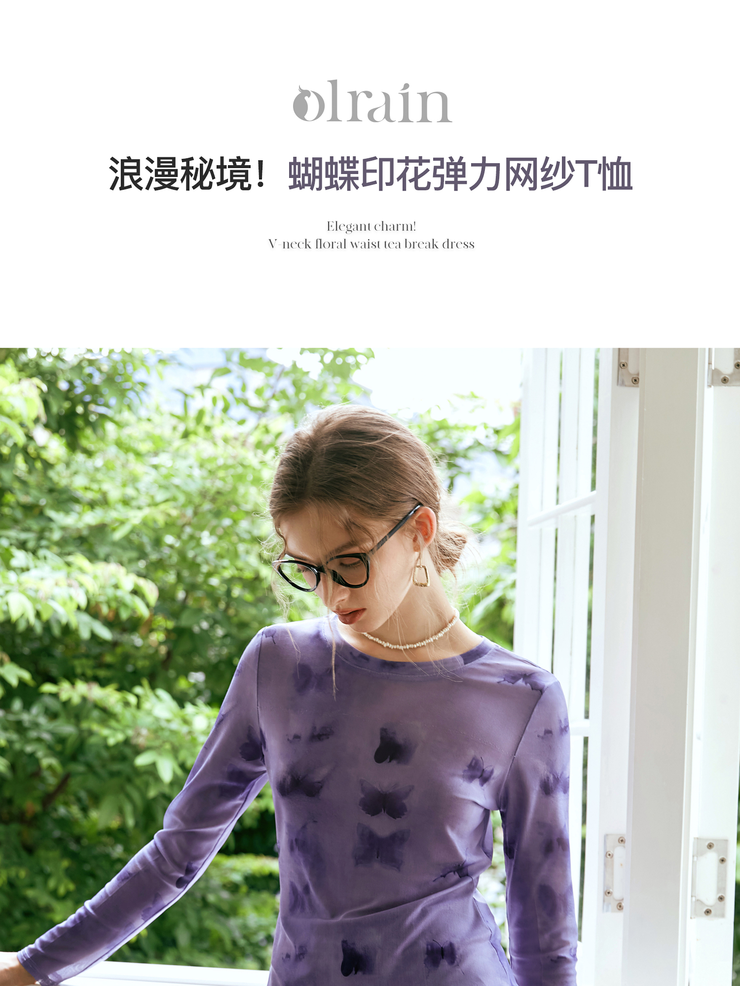 OLrain欧芮儿法式印花T恤女秋季设计感扎染网纱显瘦上衣打底衫
