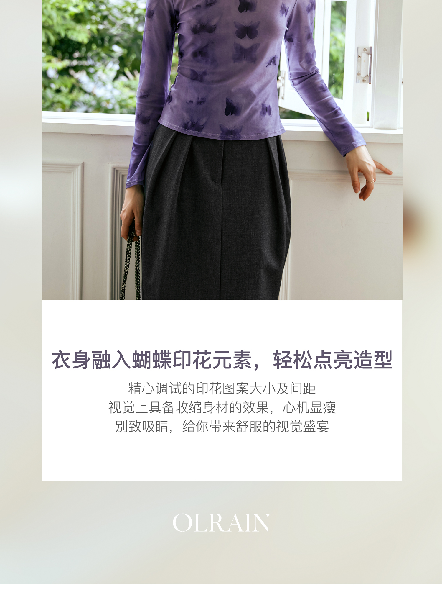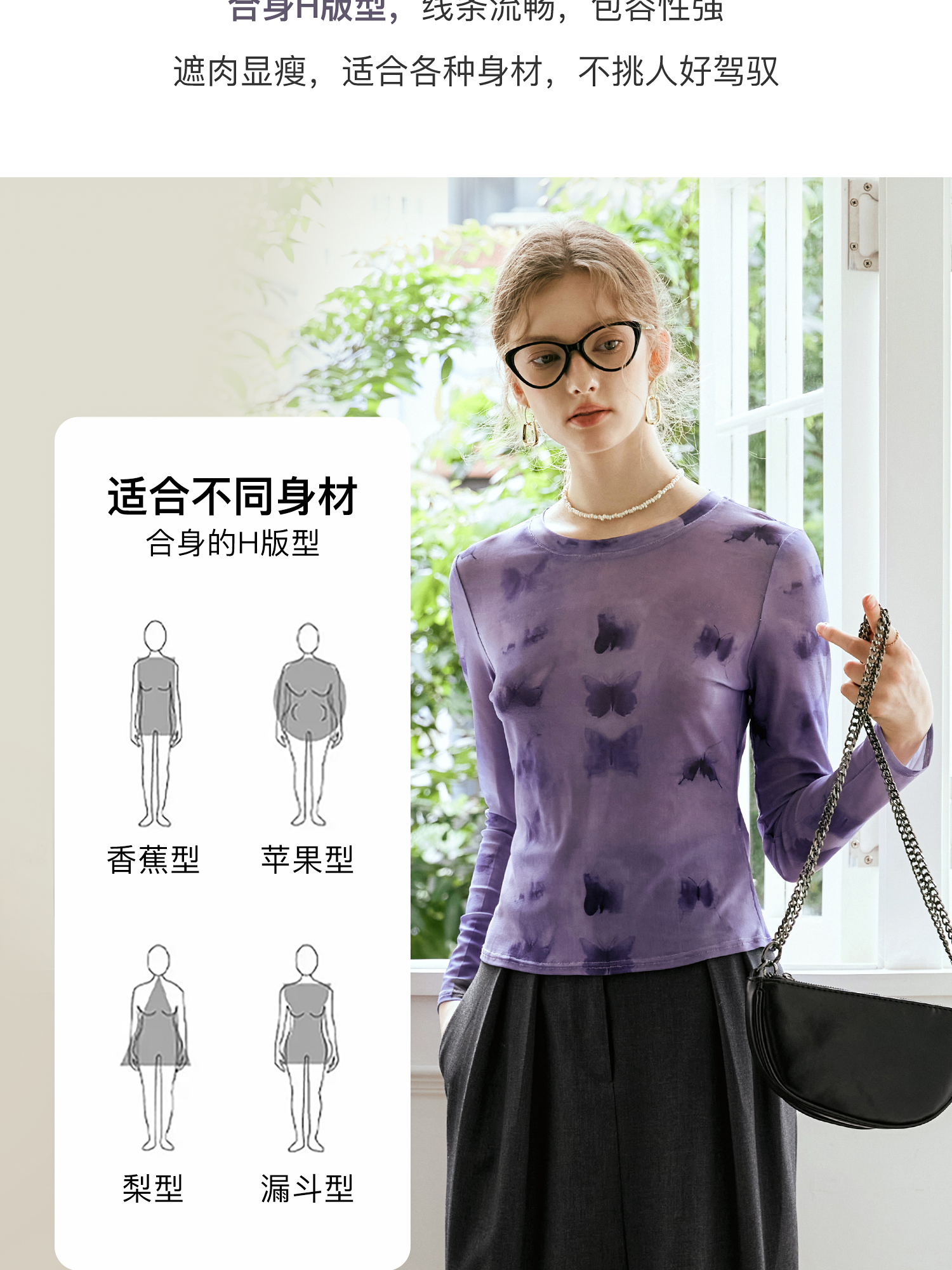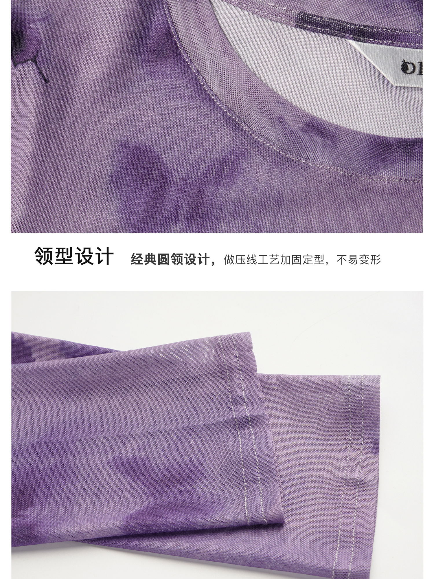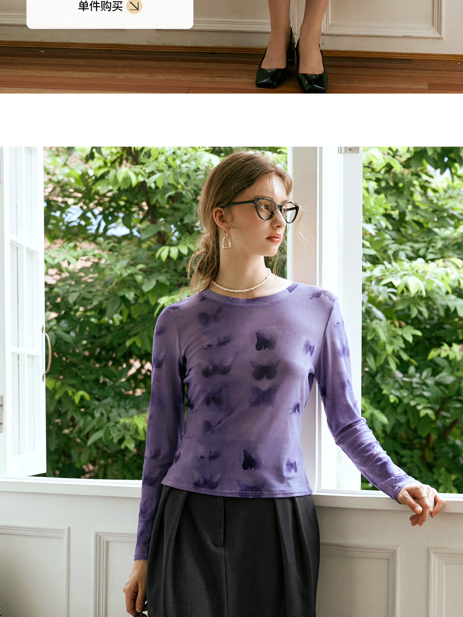 OLrain欧芮儿法式印花T恤女秋季设计感扎染网纱显瘦上衣打底衫