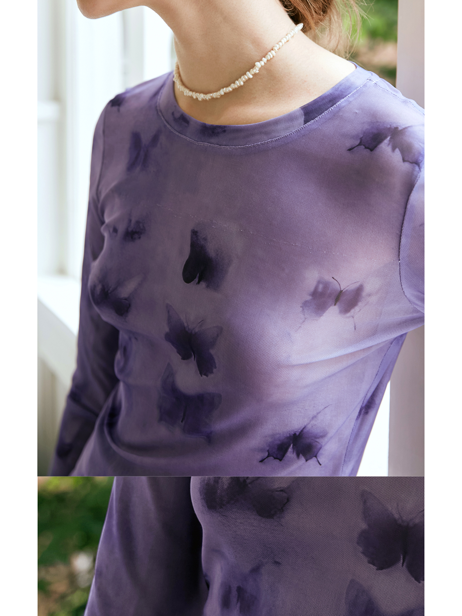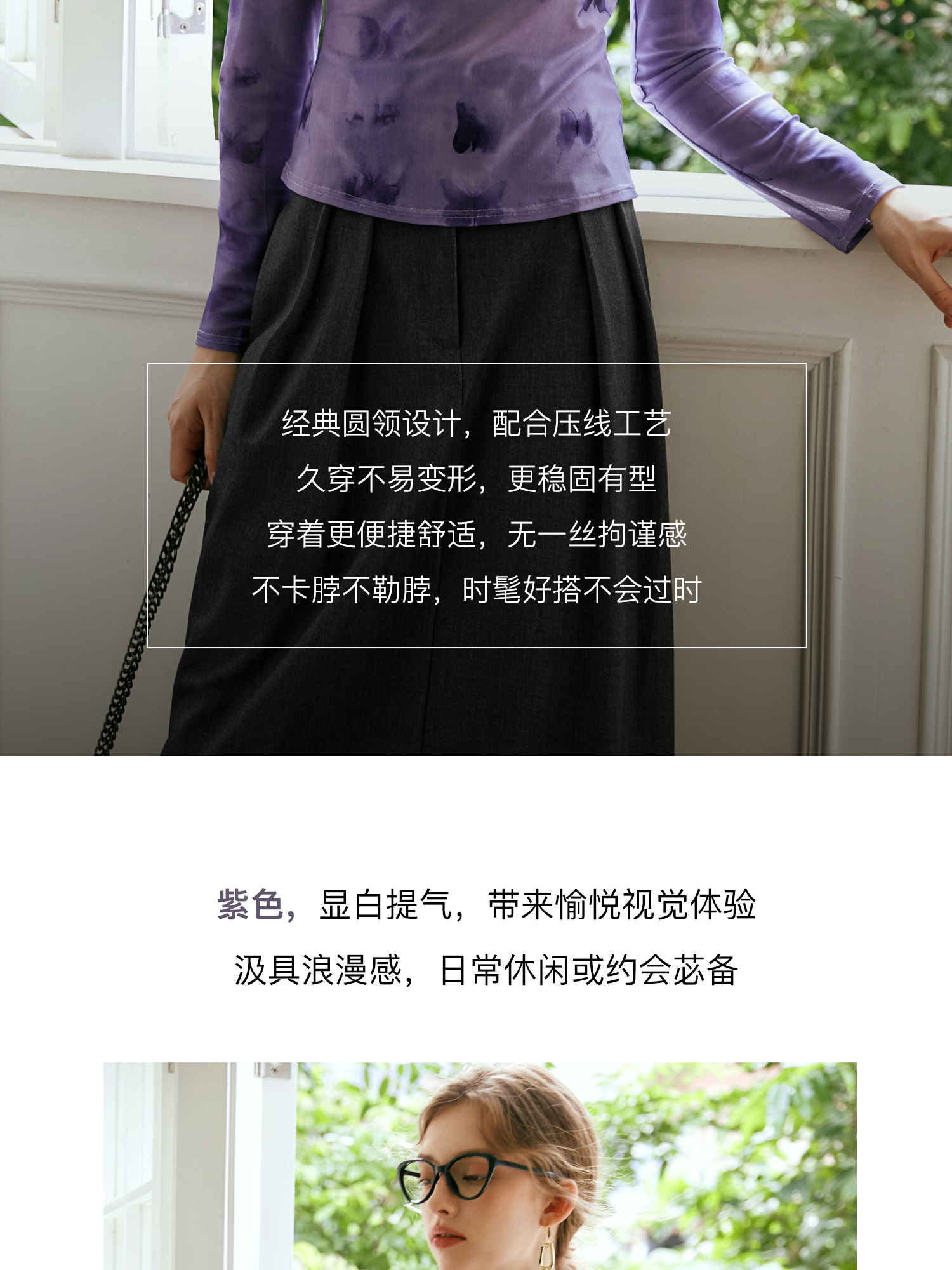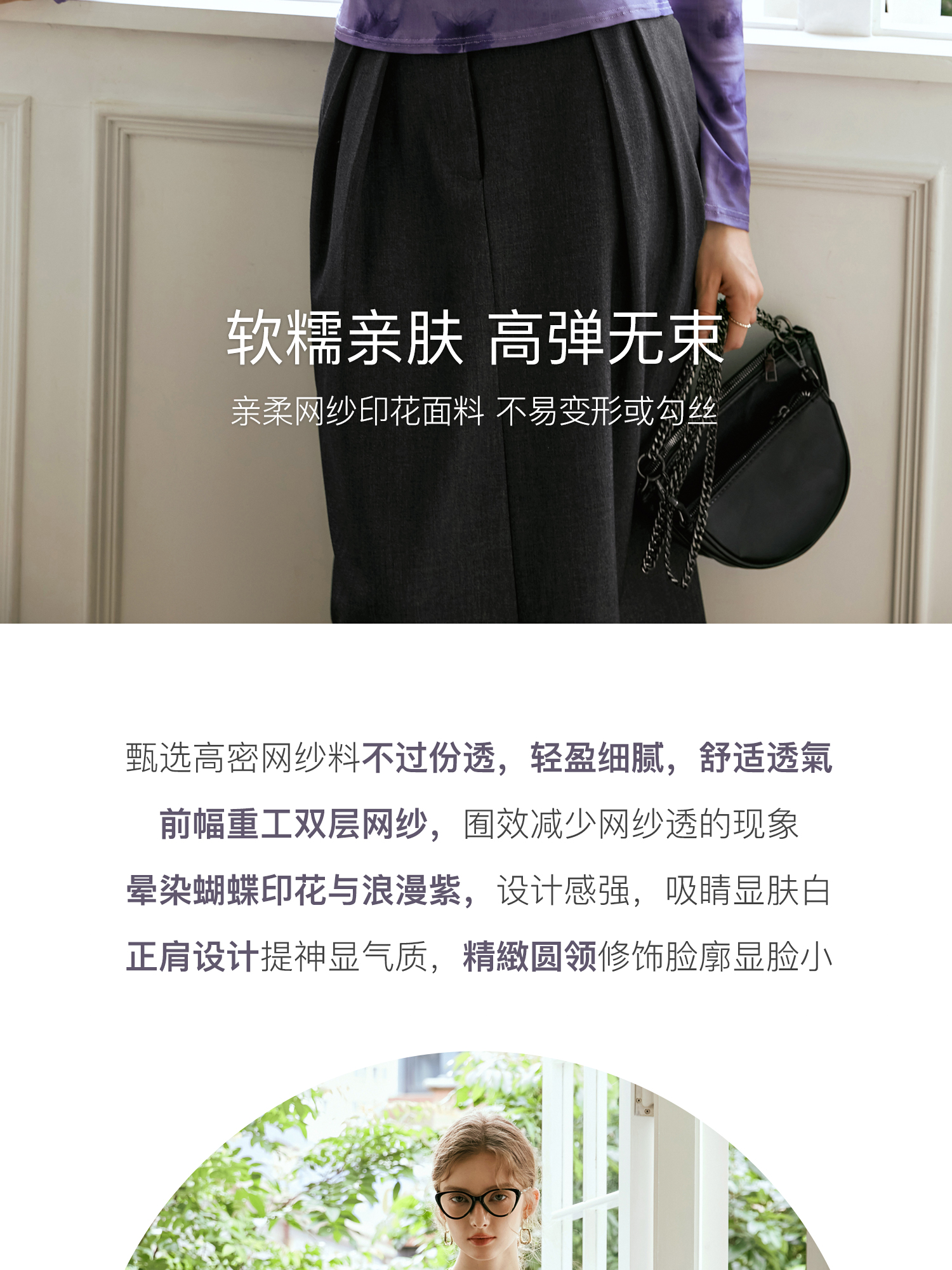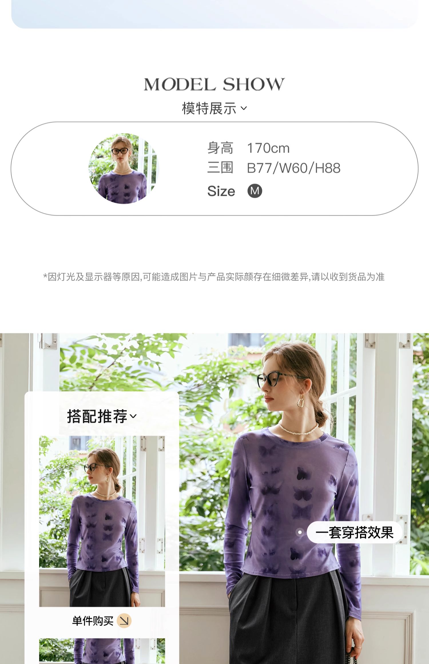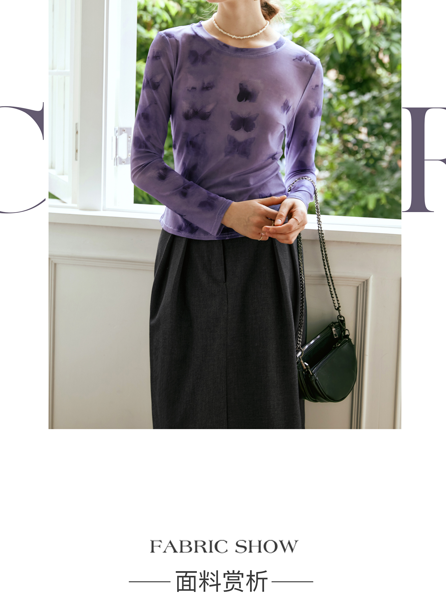 OLrain欧芮儿法式印花T恤女秋季设计感扎染网纱显瘦上衣打底衫