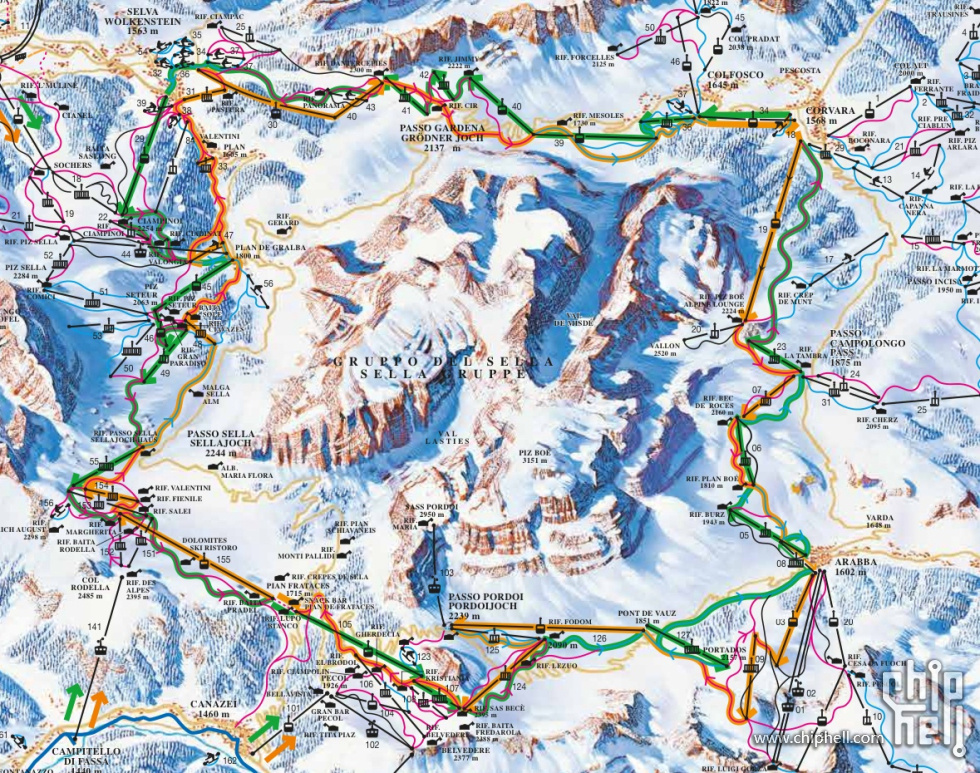 最最最特别的SellaRonda滑雪环线全长约30公里,环绕塞拉山群,山景壮丽,官方很厉害地做了正反两条环线(顺时针橙线,逆时针绿线)可以滑,标识清晰,橙线坐的缆车少单程滑的长,绿线坐的缆车多单程滑的短,雪道地形丰富非常有意思。当地人把这条环线叫做“旋转木马”。
