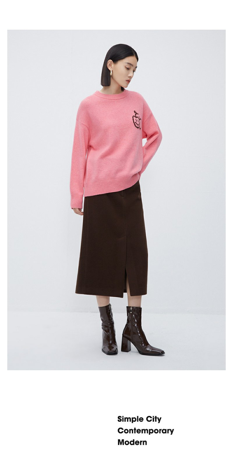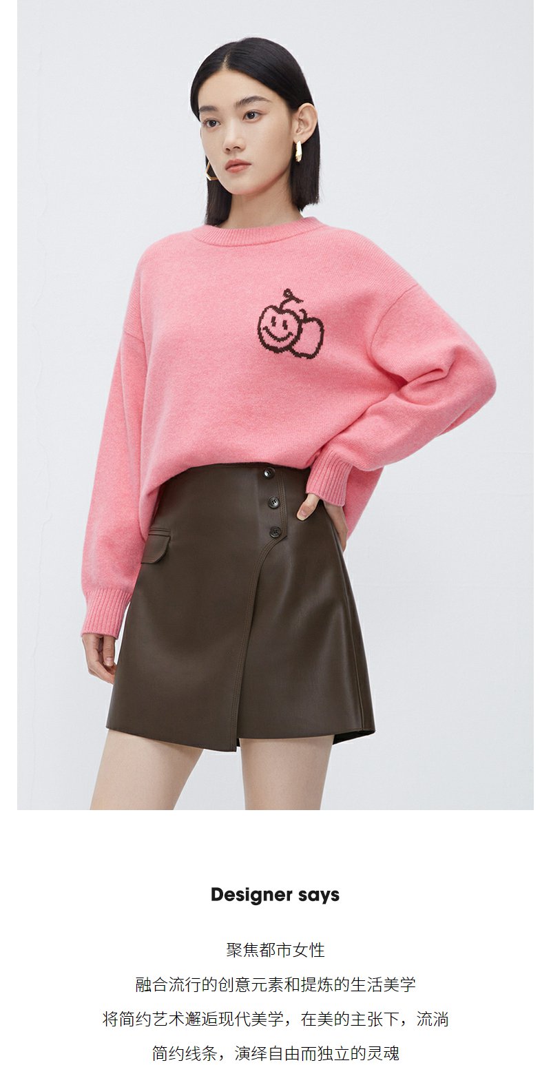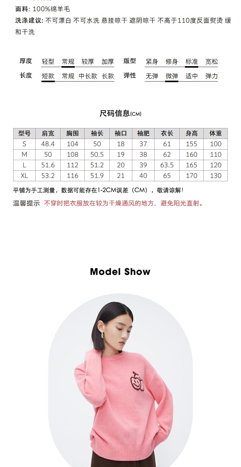 NEELLY纳俪商场同款100%绵羊毛针织衫女粉色甜美苹果笑脸设计毛衣N23112A01153