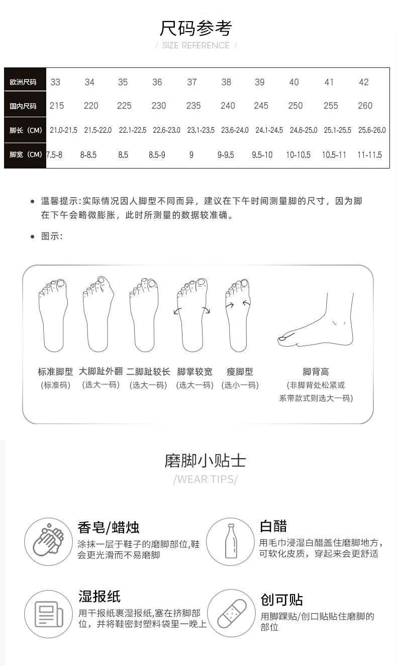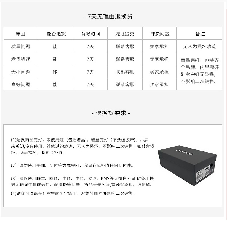 【注意事项】换货需要扣除-10元/件及偏远加收运费,鞋底磨损及其他影响二次销售情况,无法退换货。