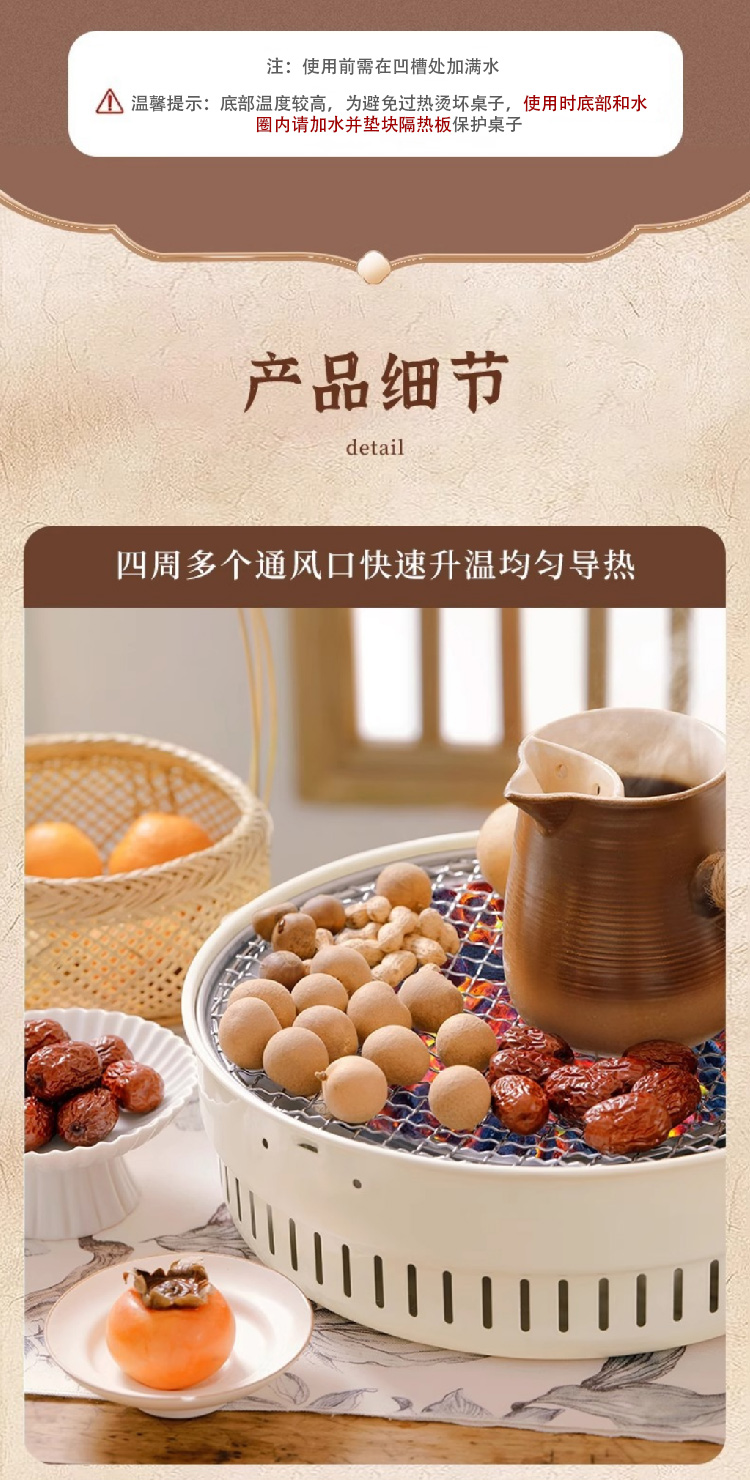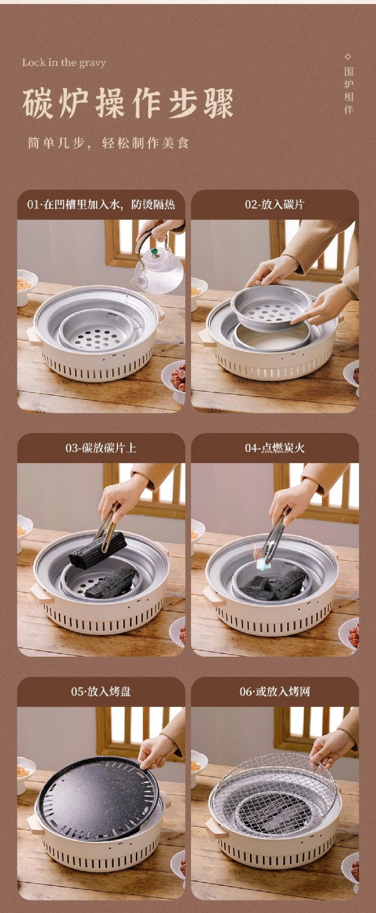 注意事项:炉体底部加水,碳槽加水,接灰盘加水使用,使用前请在炉子的底部放置可隔热的物品