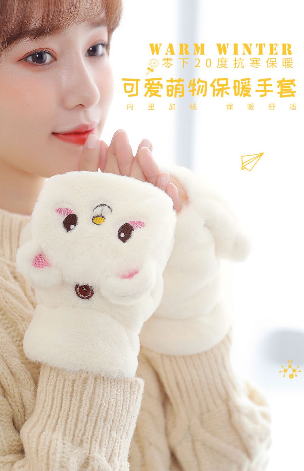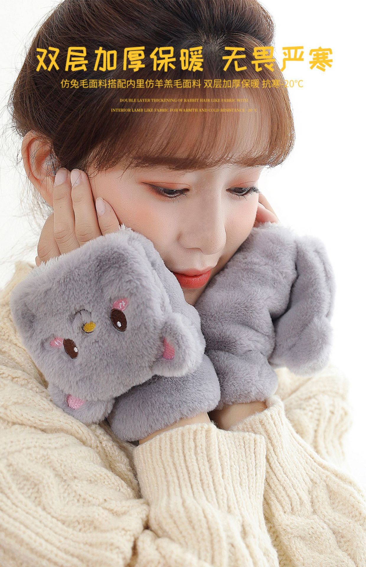 【可爱萌物保暖手套】女秋冬季可爱骑行韩版卡通加绒加厚学生写字翻盖手套挂脖保暖,双层加厚保暖,无畏严寒。ry