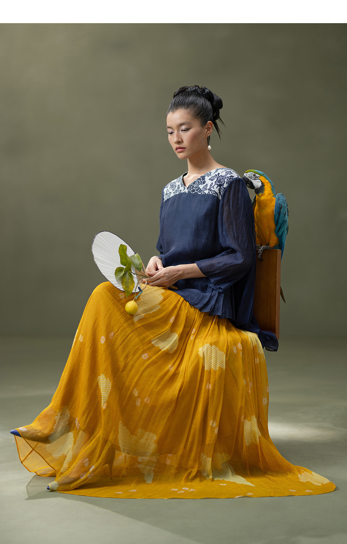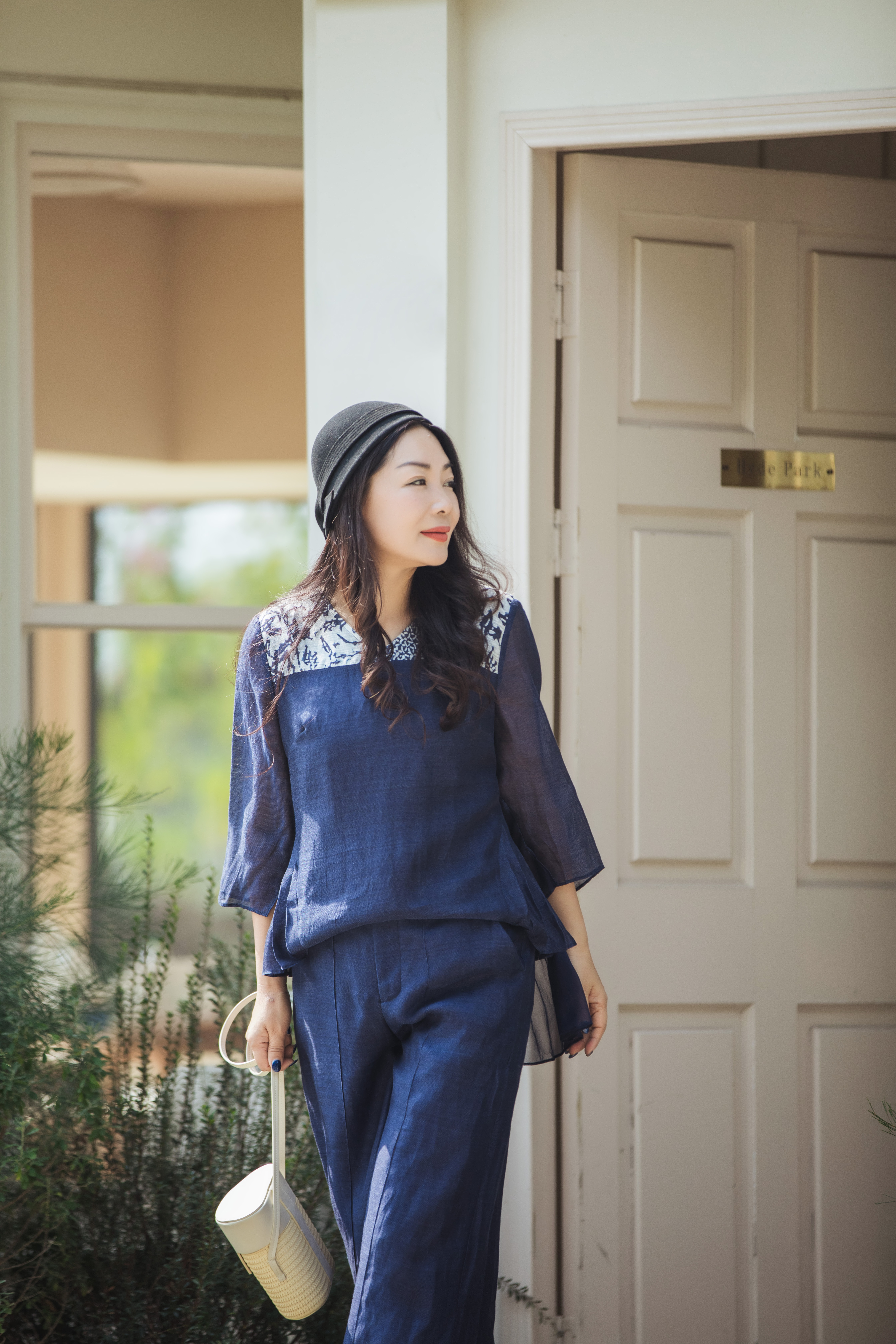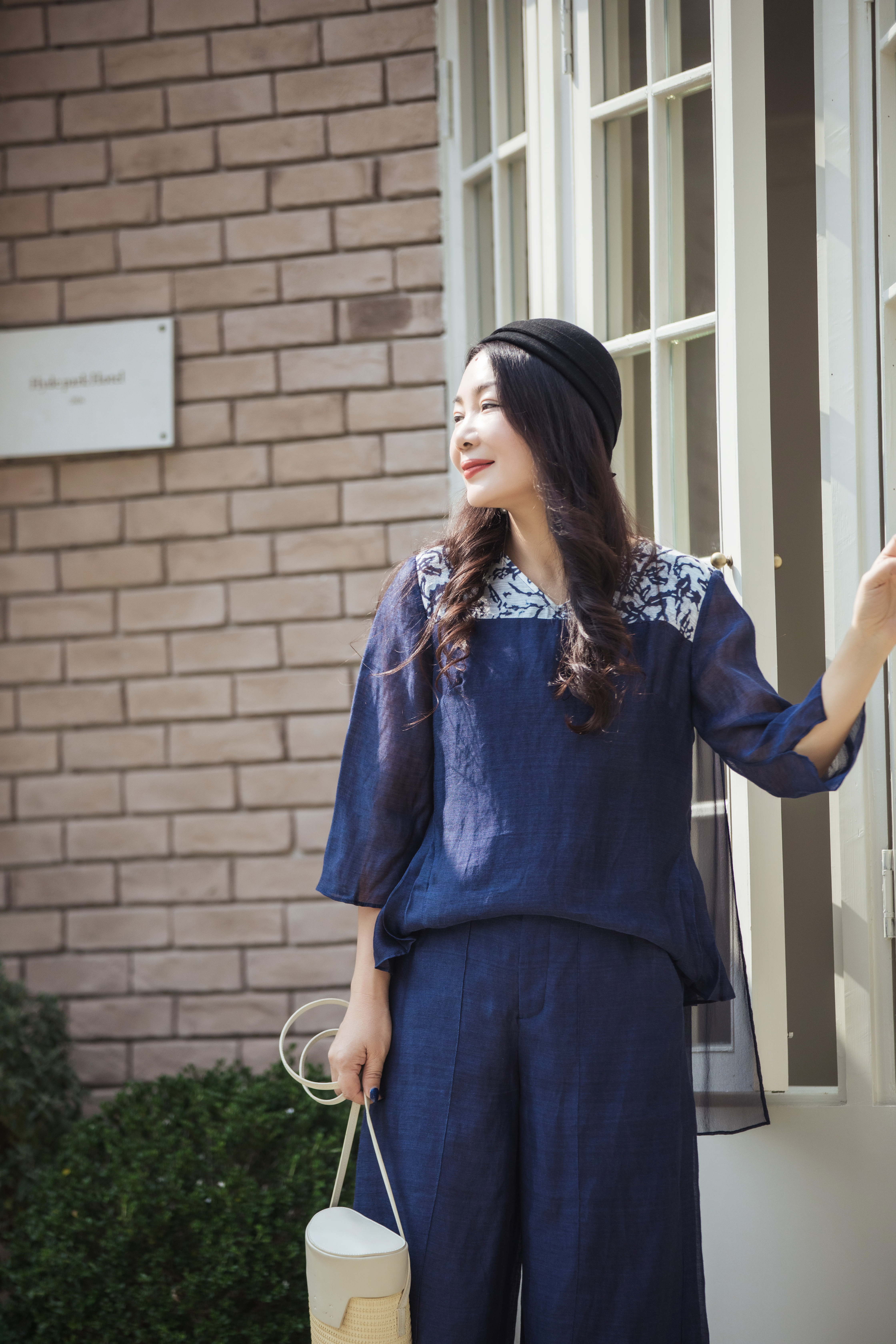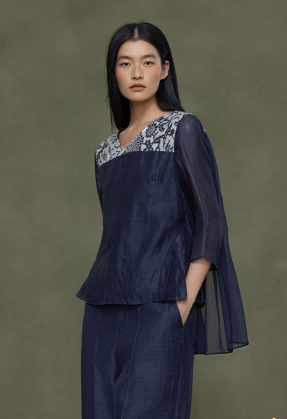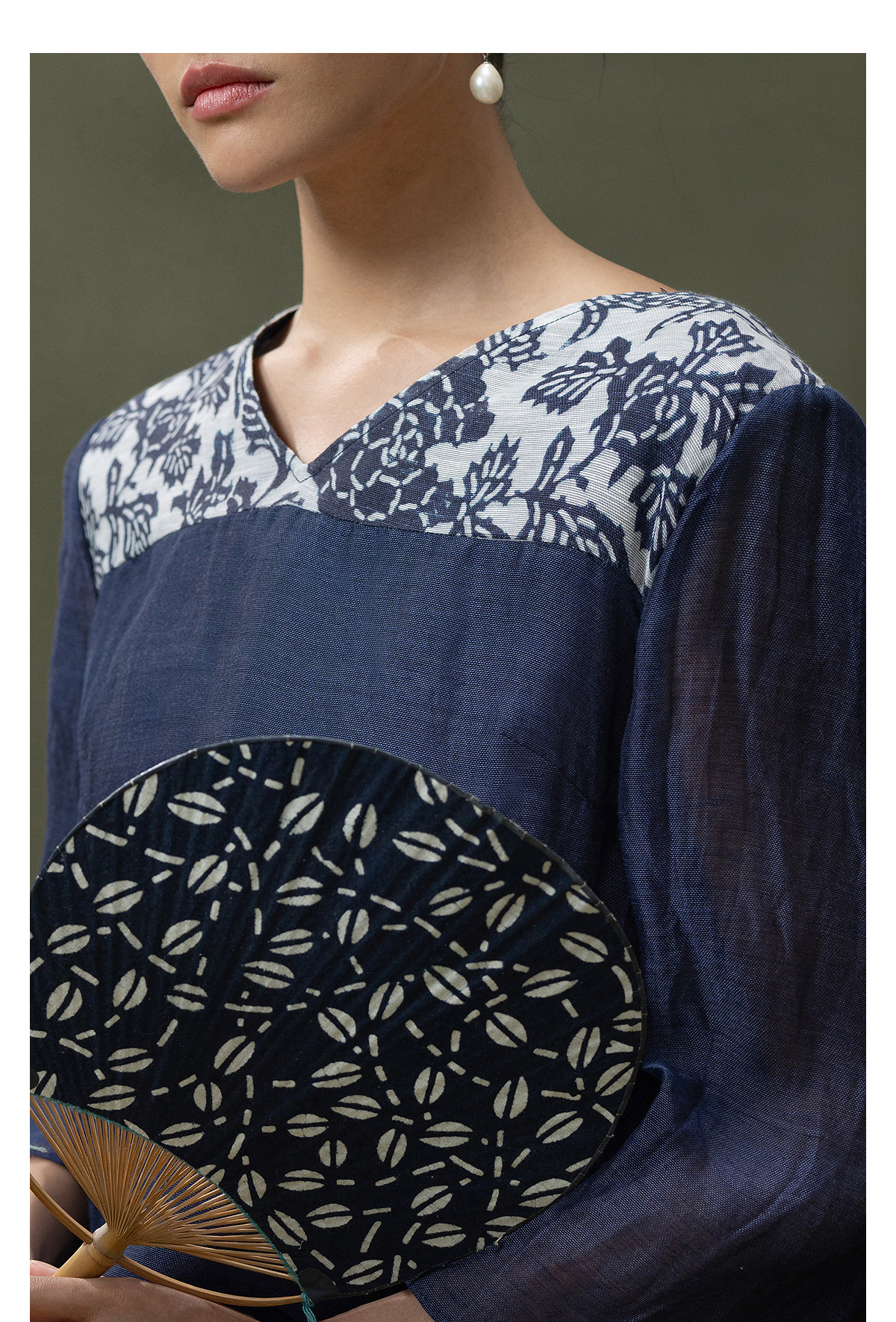 【林栖设计小店】缠枝牡丹|藏青色丝麻拼桑蚕丝飞片2026春新款优雅衬衣1961142