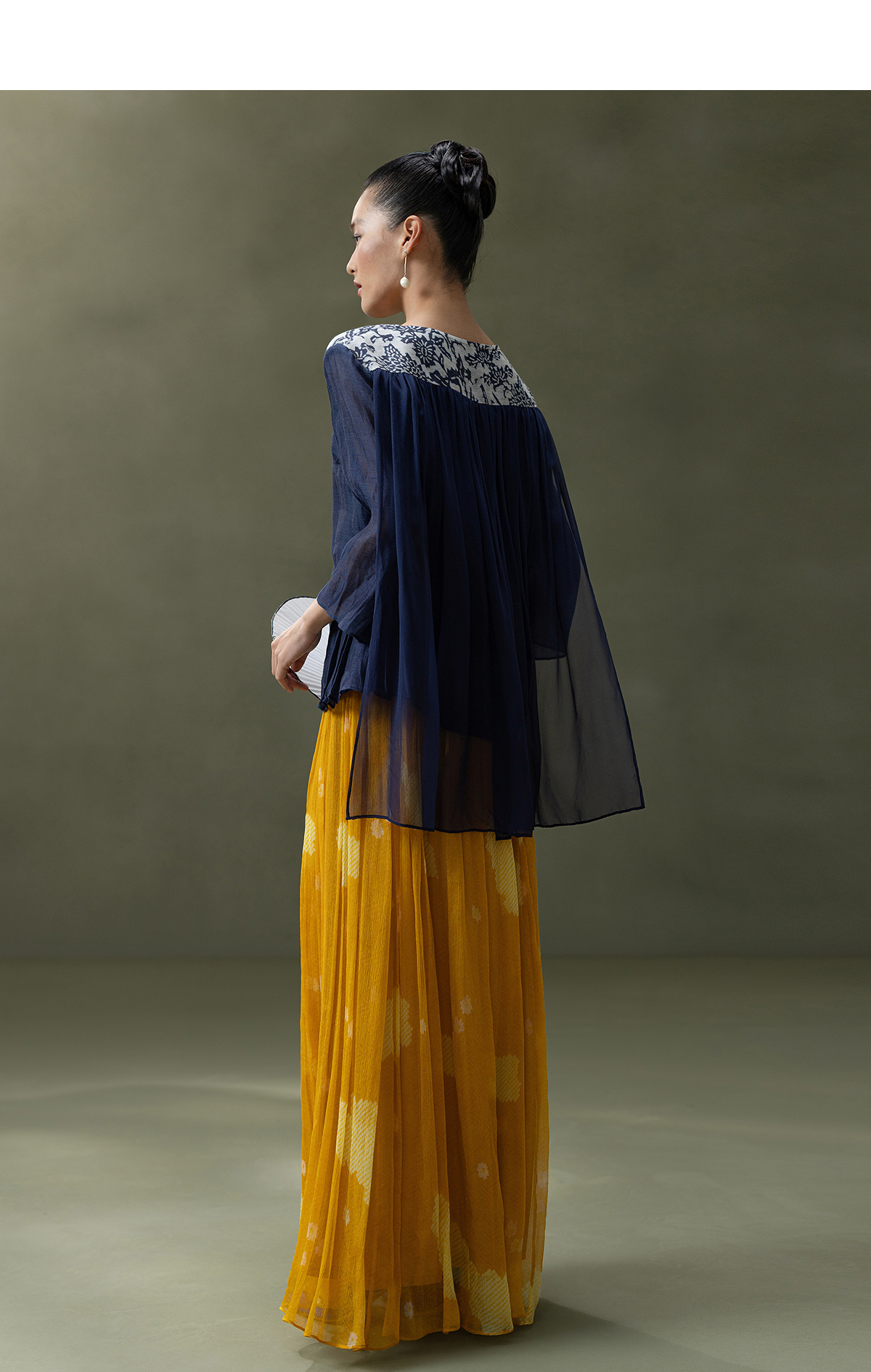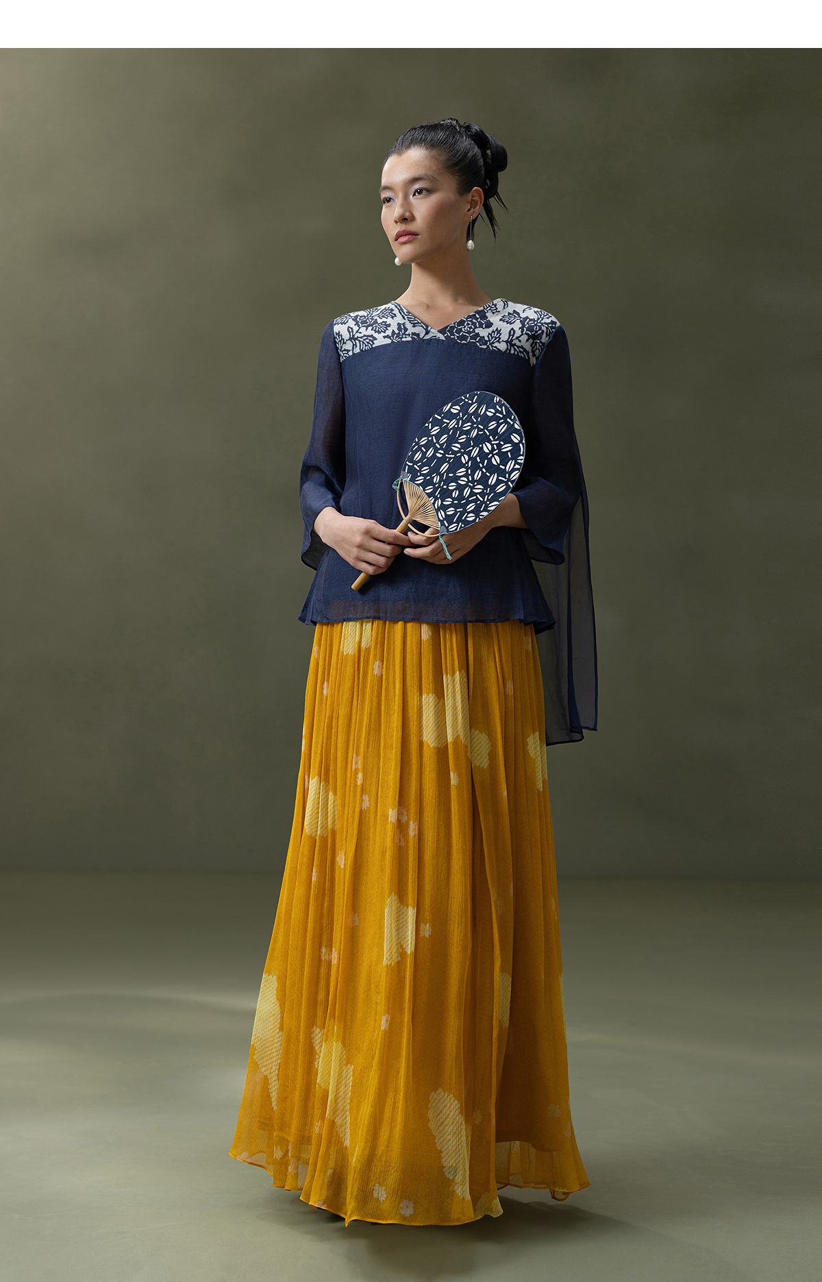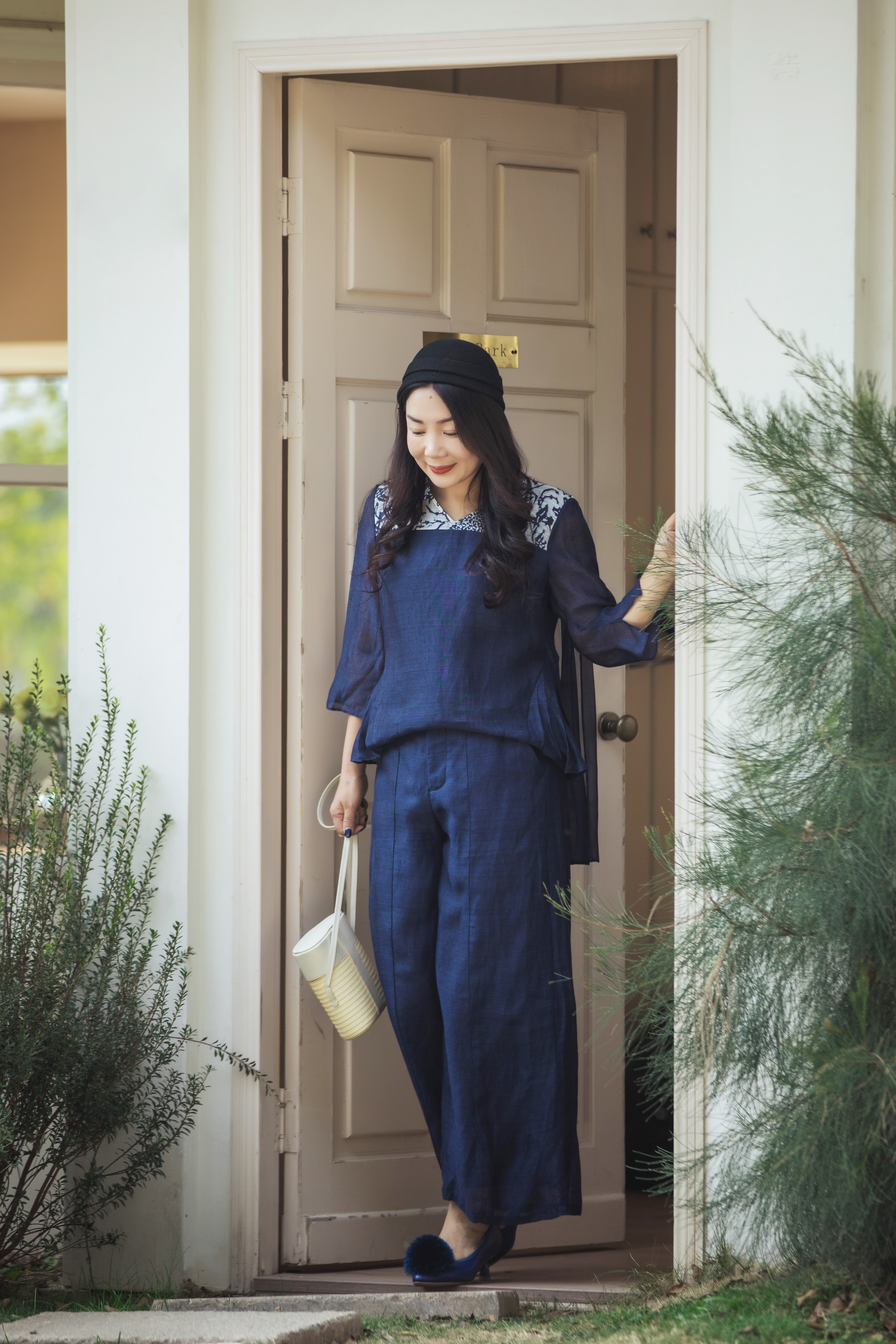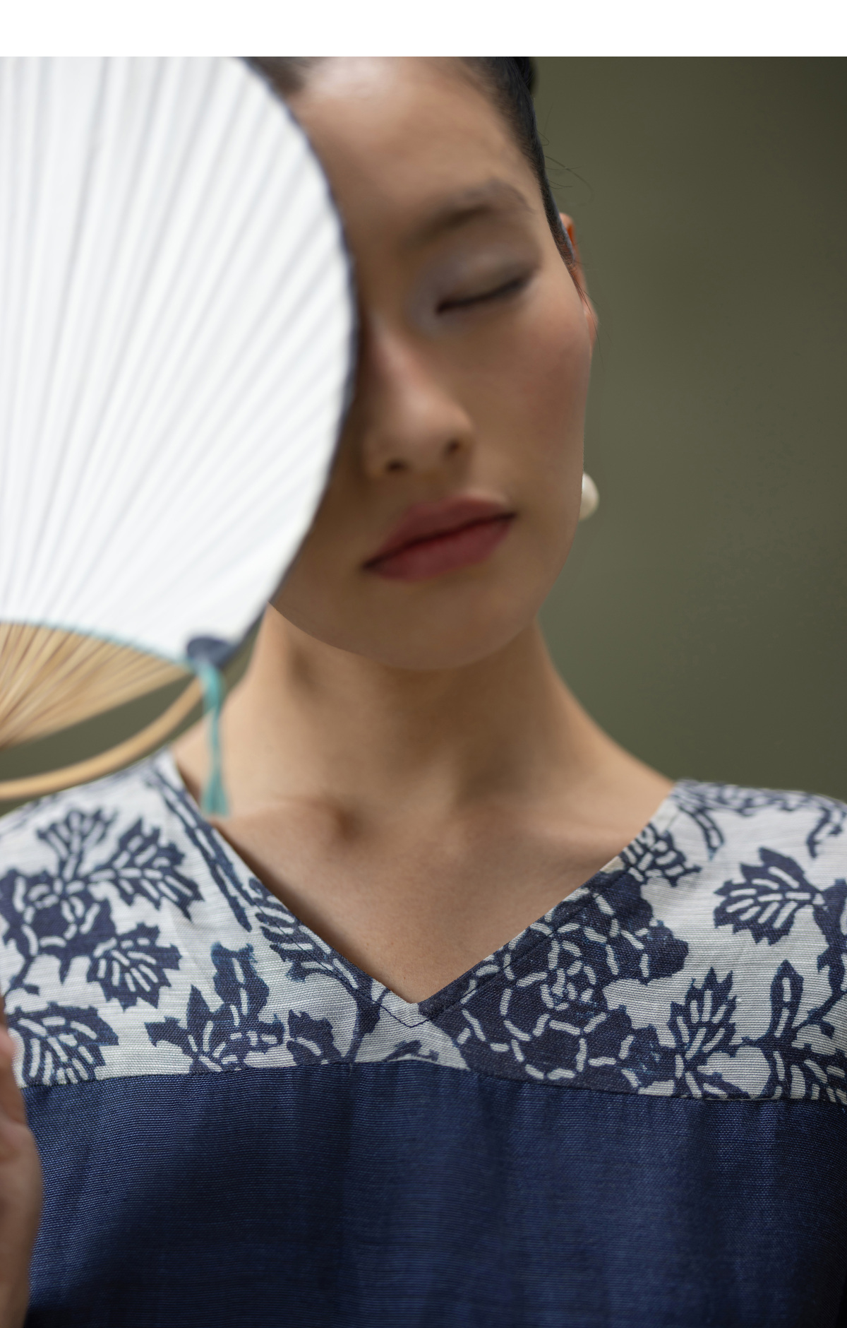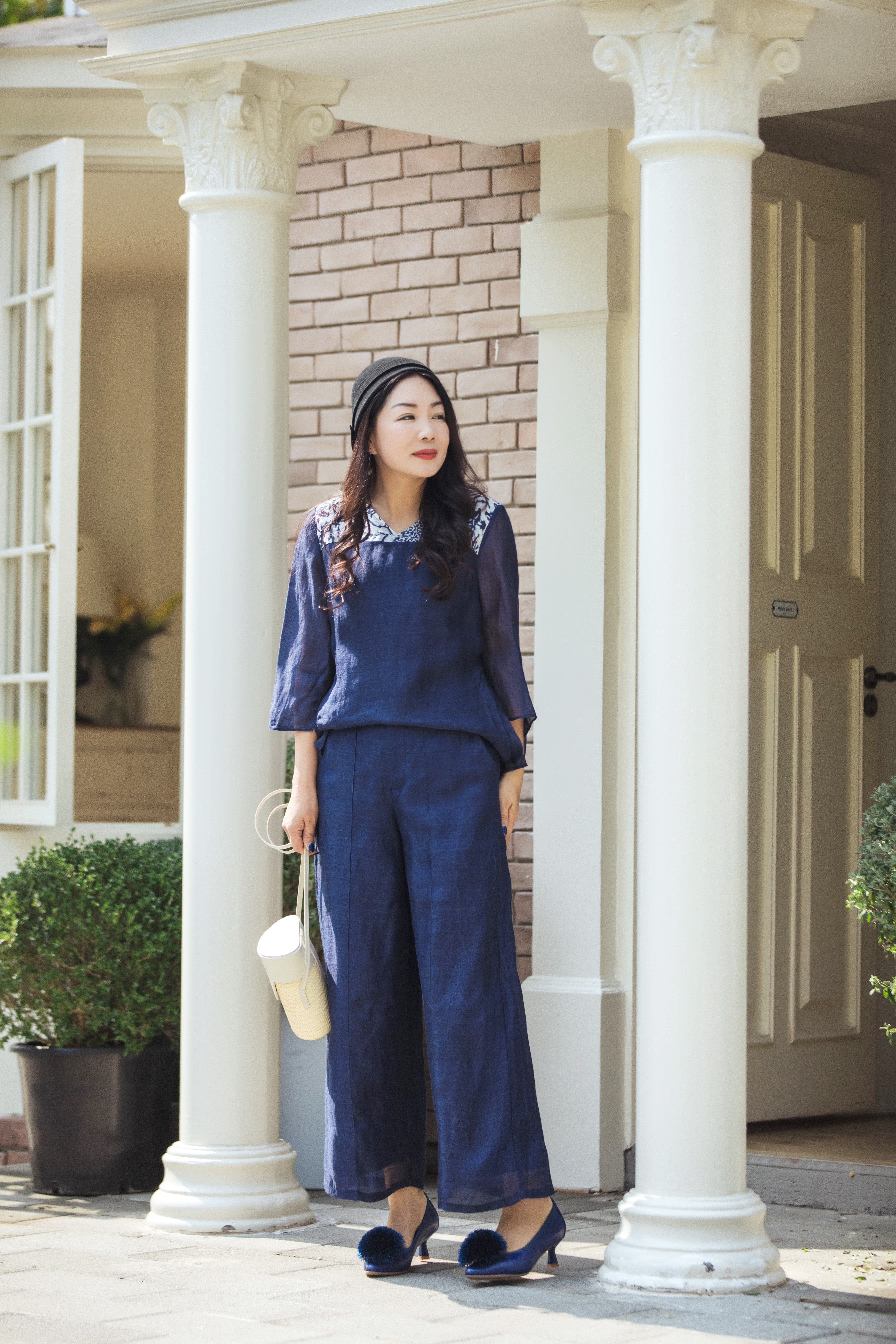 【林栖设计小店】缠枝牡丹|藏青色丝麻拼桑蚕丝飞片2026春新款优雅衬衣1961142