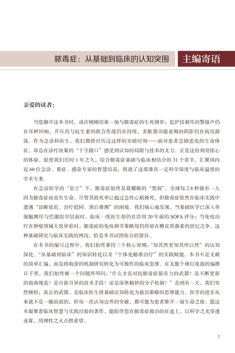 本书编写结合主编团队大量的研究成果及数十年的临床工作经验,从客观且实用的角度切入,系统且全面的阐述脓毒症这一疾病,主要从脓毒症的历史演变、定义、发病机制、相关微生物学、临床表现和分型、早期识别和诊断、鉴别诊断、严重程度的评估、液体管理、治疗原则、药物治疗、器官支持以及并发症的处理等方面进行编写,将对临床争议较多的降阶梯治疗方案和激素应用原则进行特色的总结分析,并引入具有中国特色的中西医结合治疗的观点,兼顾患者的医疗护理策略,注重理论与实践相结合,内容丰富、新颖且全面,帮助急诊和重症医学科的医护人员系统并深入了解该疾病的基础与临床管理,提高临床实践水平。