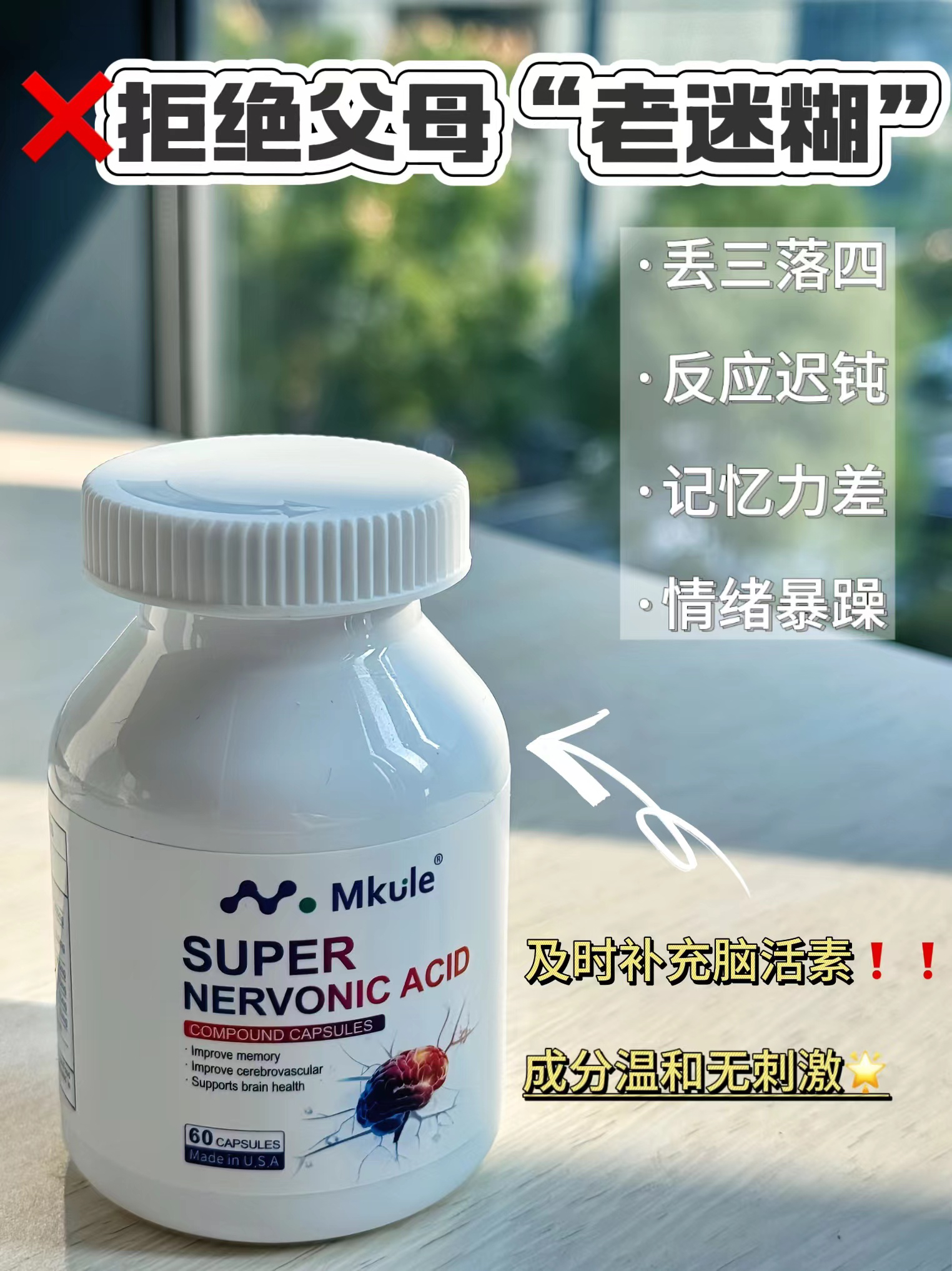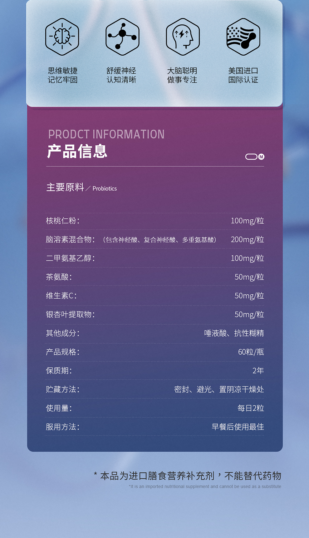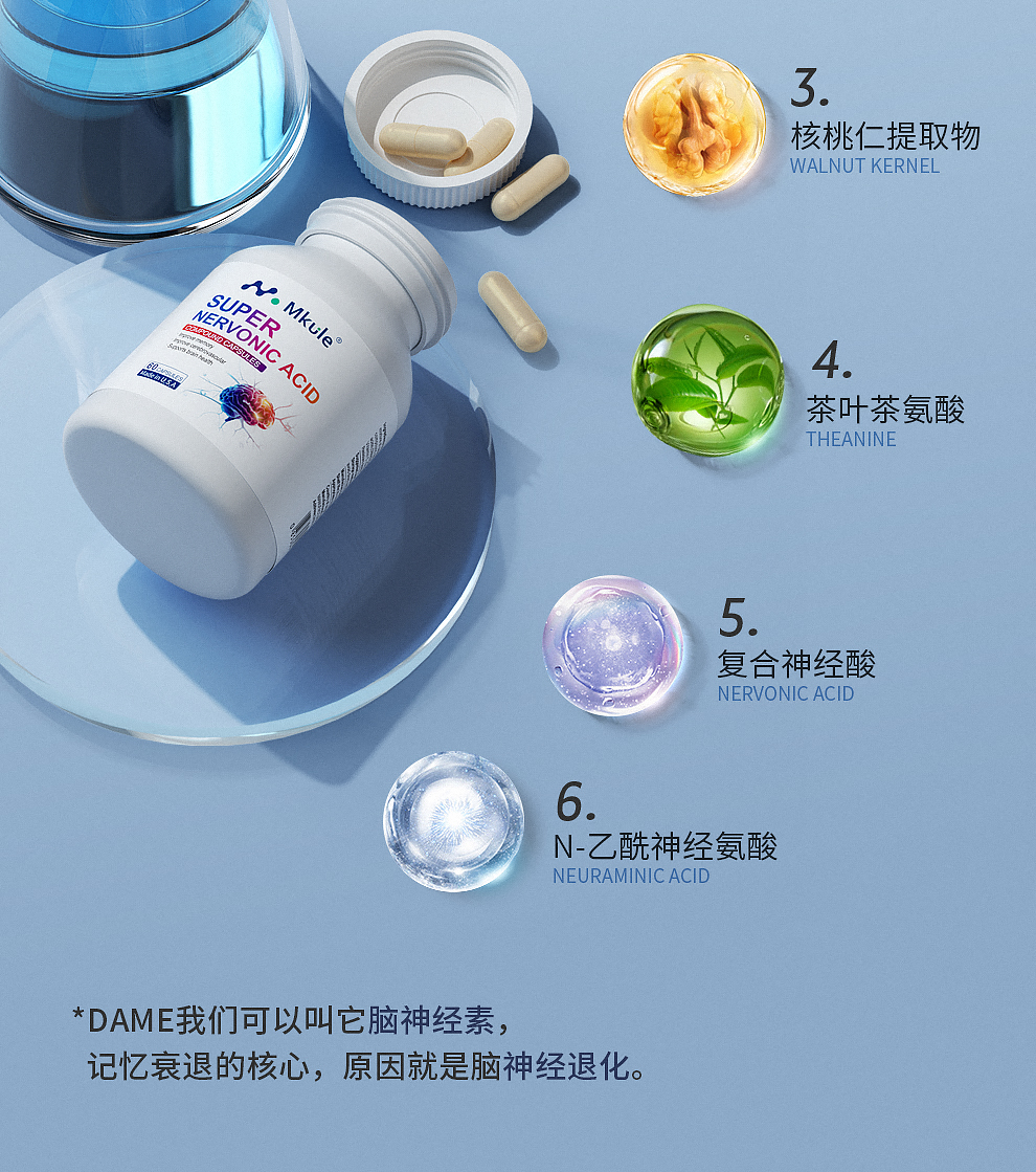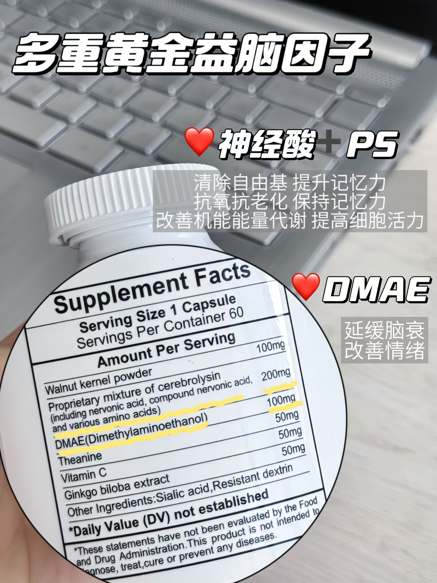 ⁵近效清仓美国进口【专研脑配方胶囊】 脑神经素+ 复合脑活素+茶叶茶氨酸+ N-乙酰神经氨酸 有效期到26.10 6岁及以上 60粒/瓶 YY05-QTT-SA