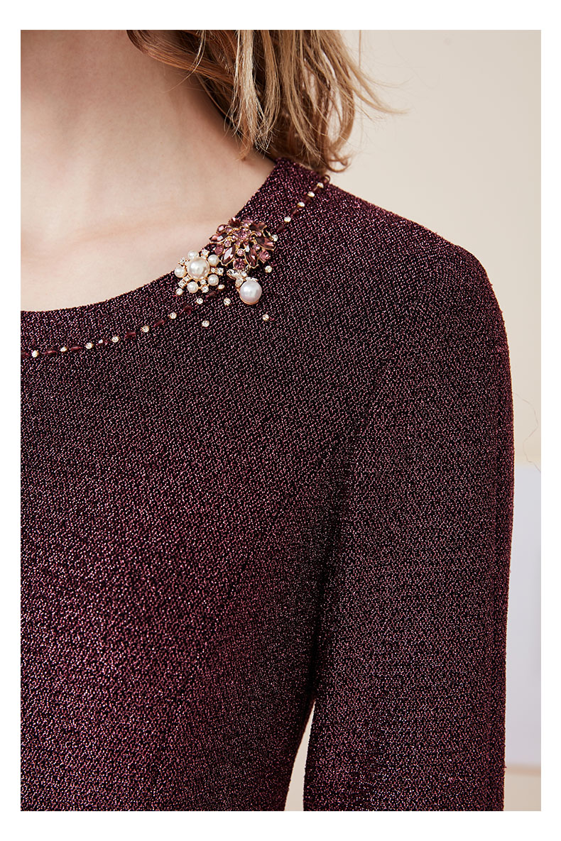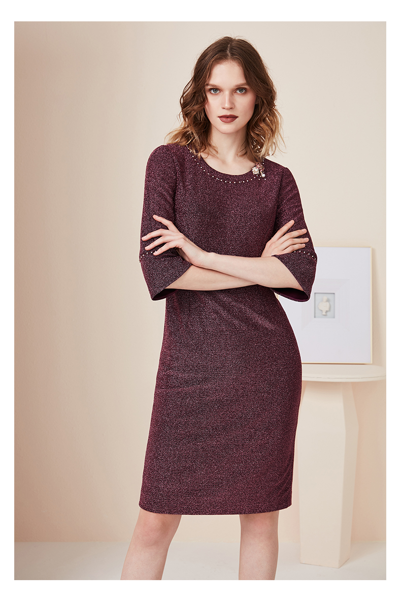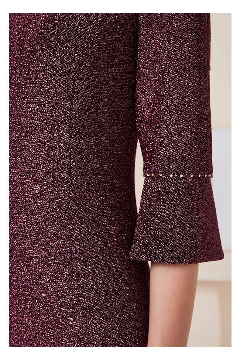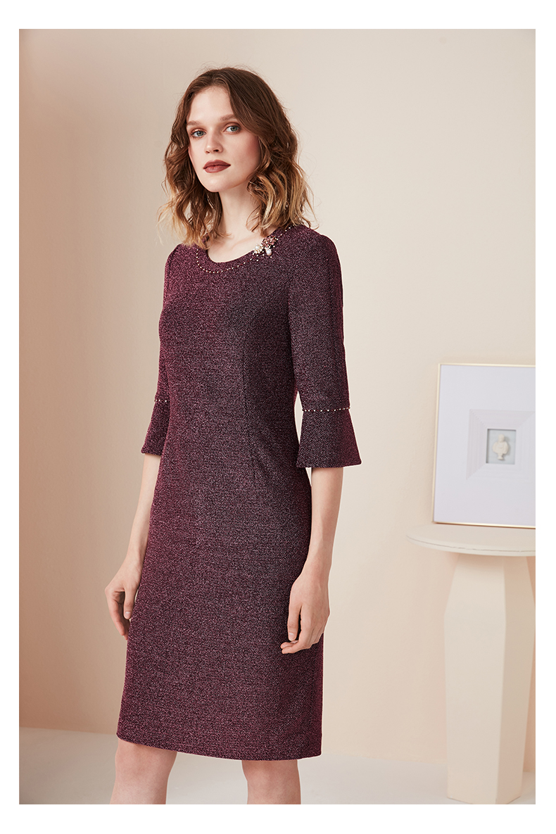 皮尔卡丹女装秋季新款一步裙紫色九分袖圆领连衣裙P93DL20Z0