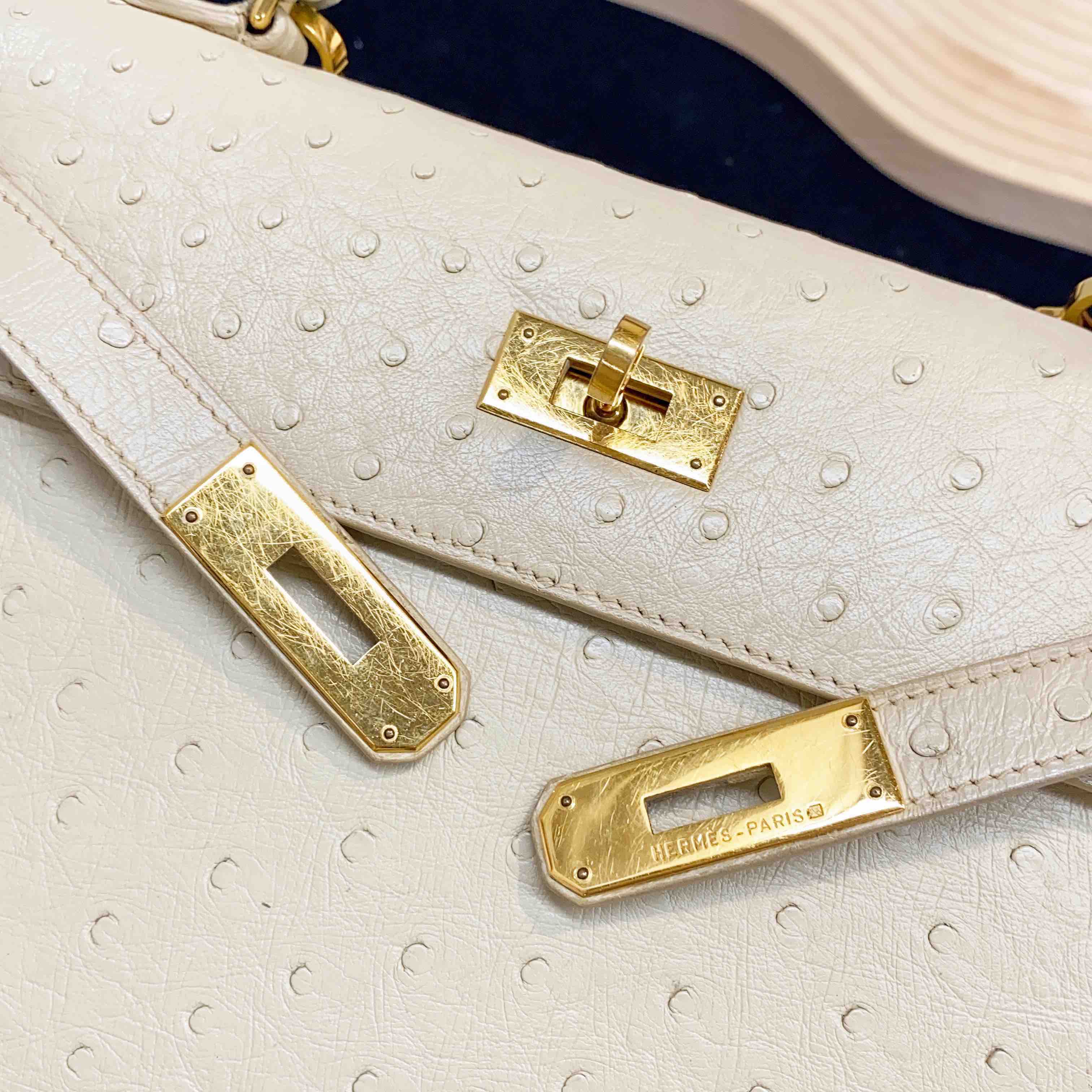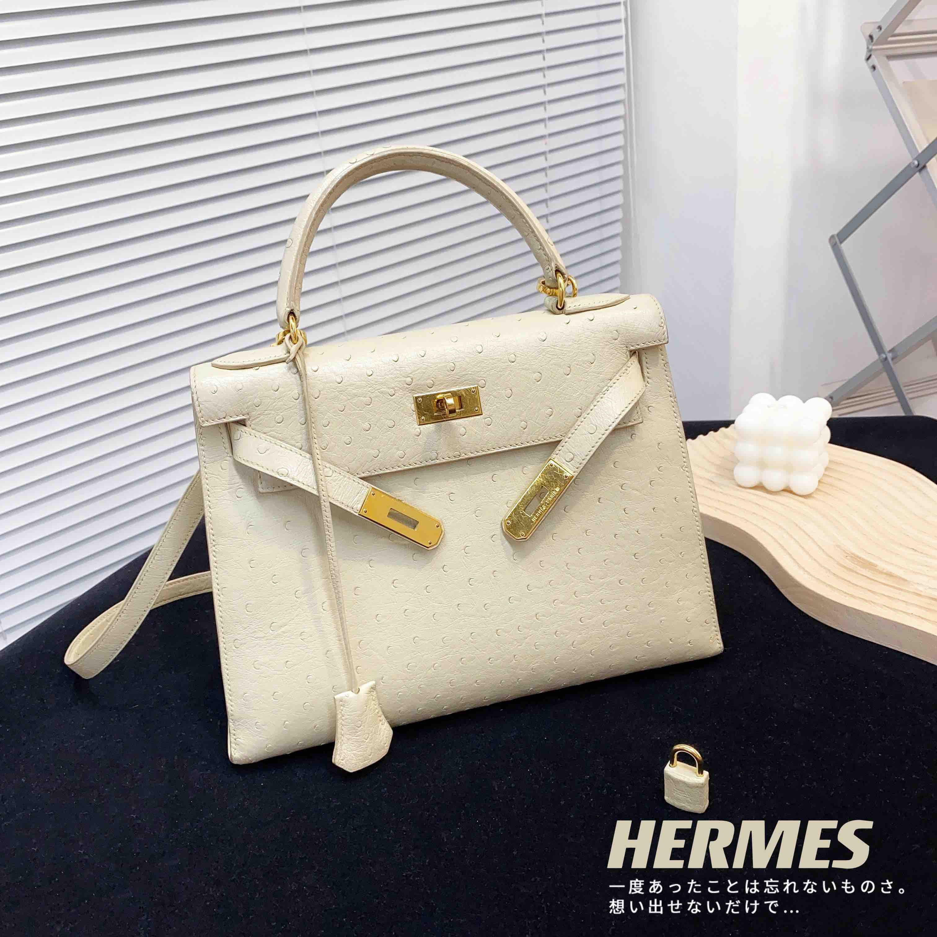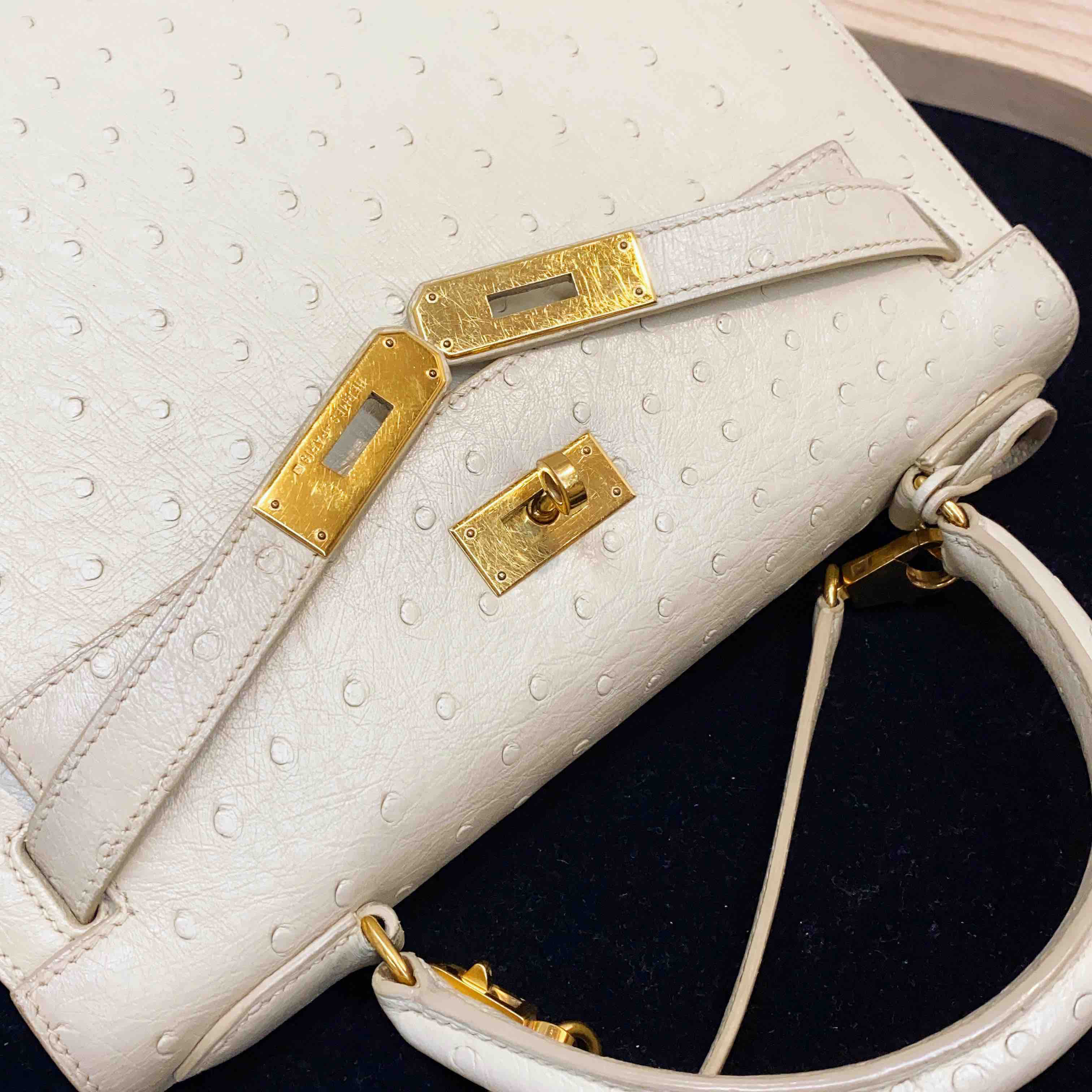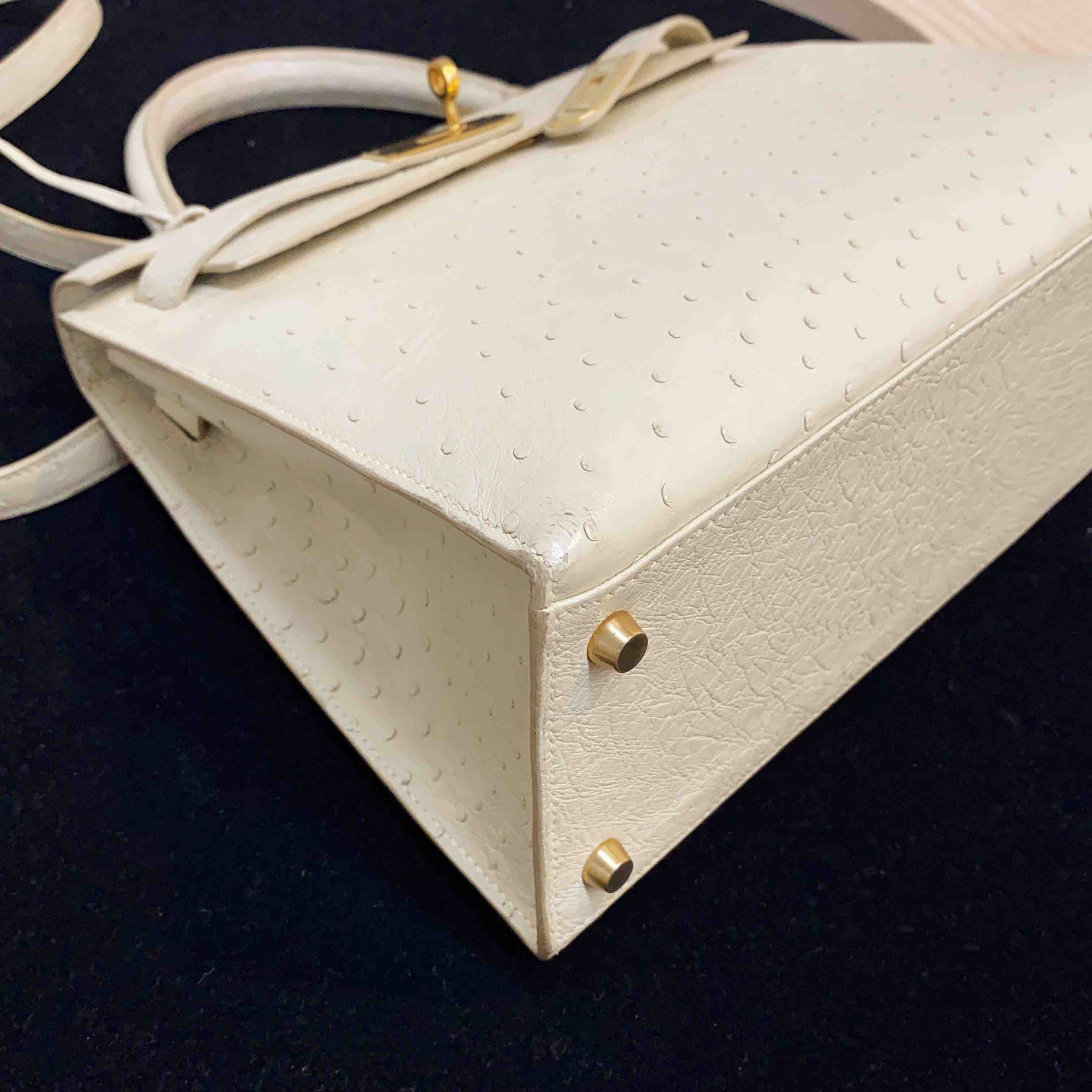 【商品描述】正品二手 Hermes Kelly28 鸵鸟皮冰川白手提包🕊95新 28×20 圆形X刻配件:锁、钥匙挂件、肩带。边角和五金有使用感。