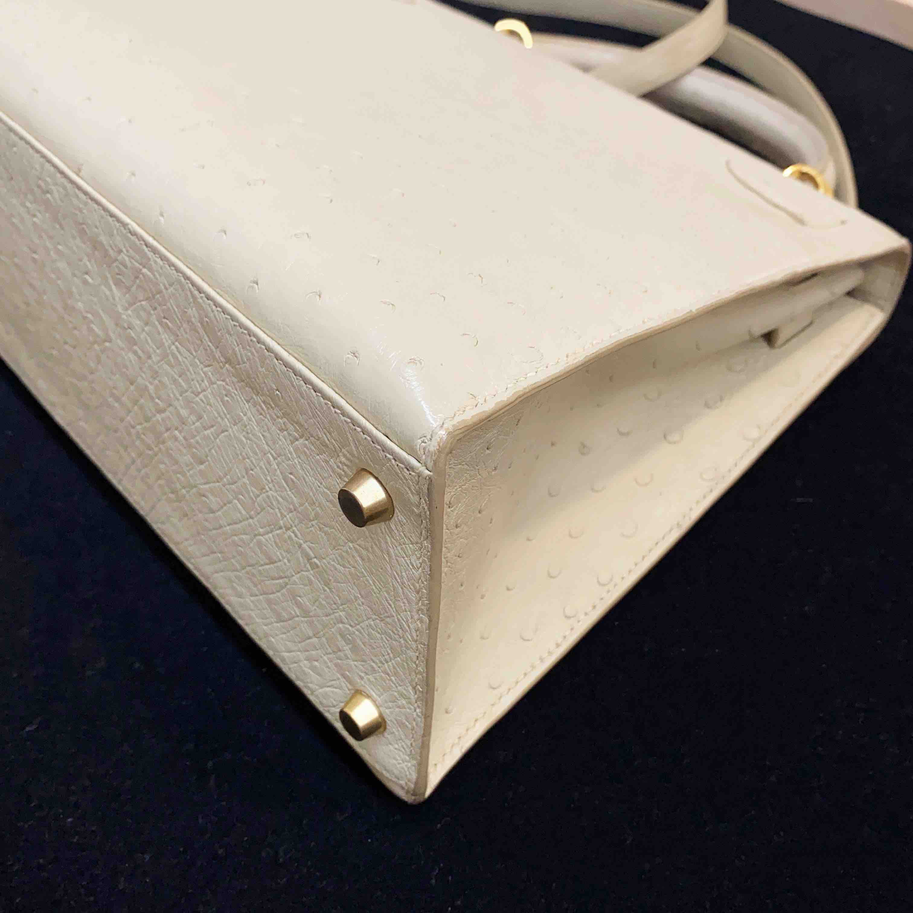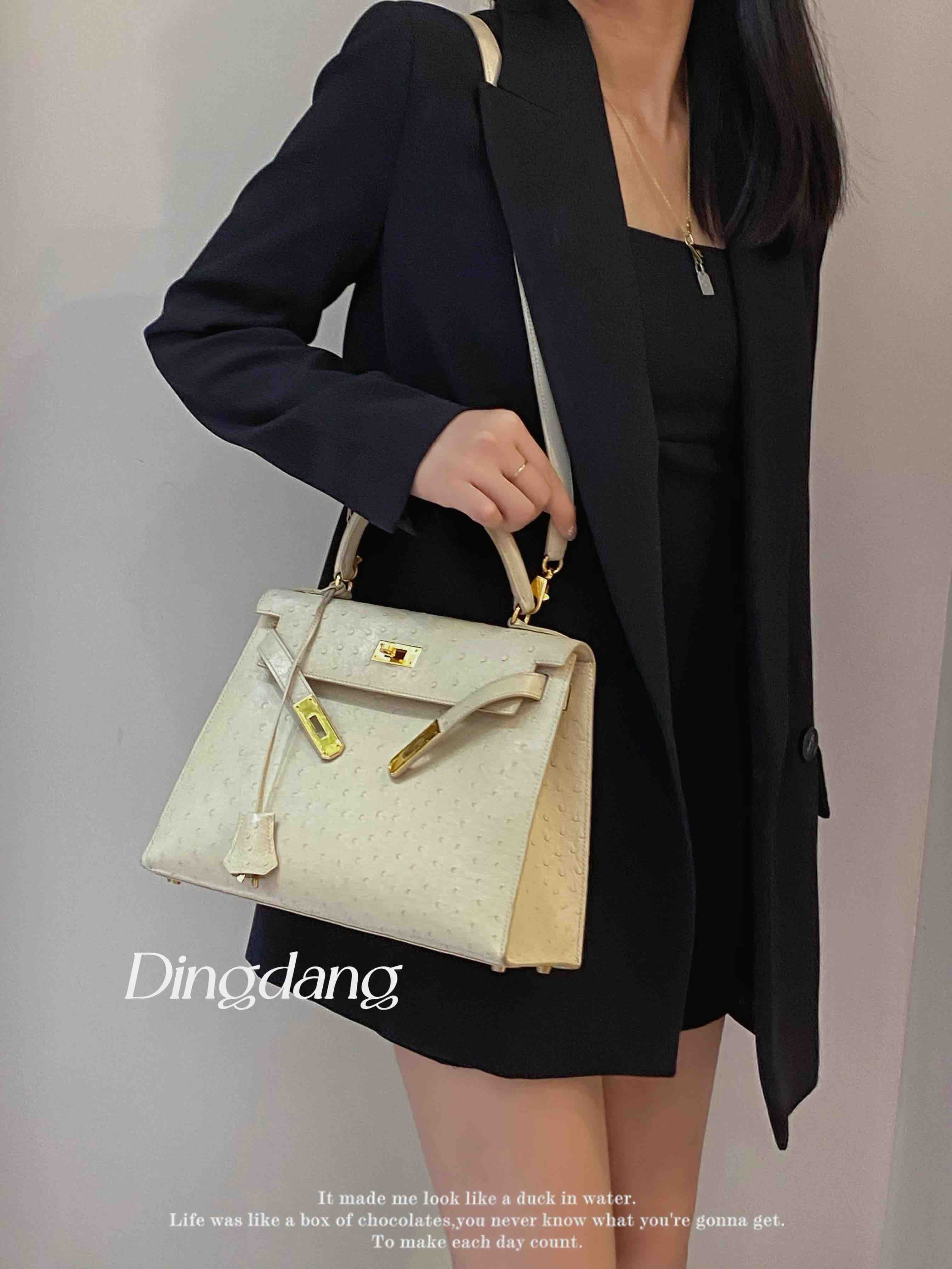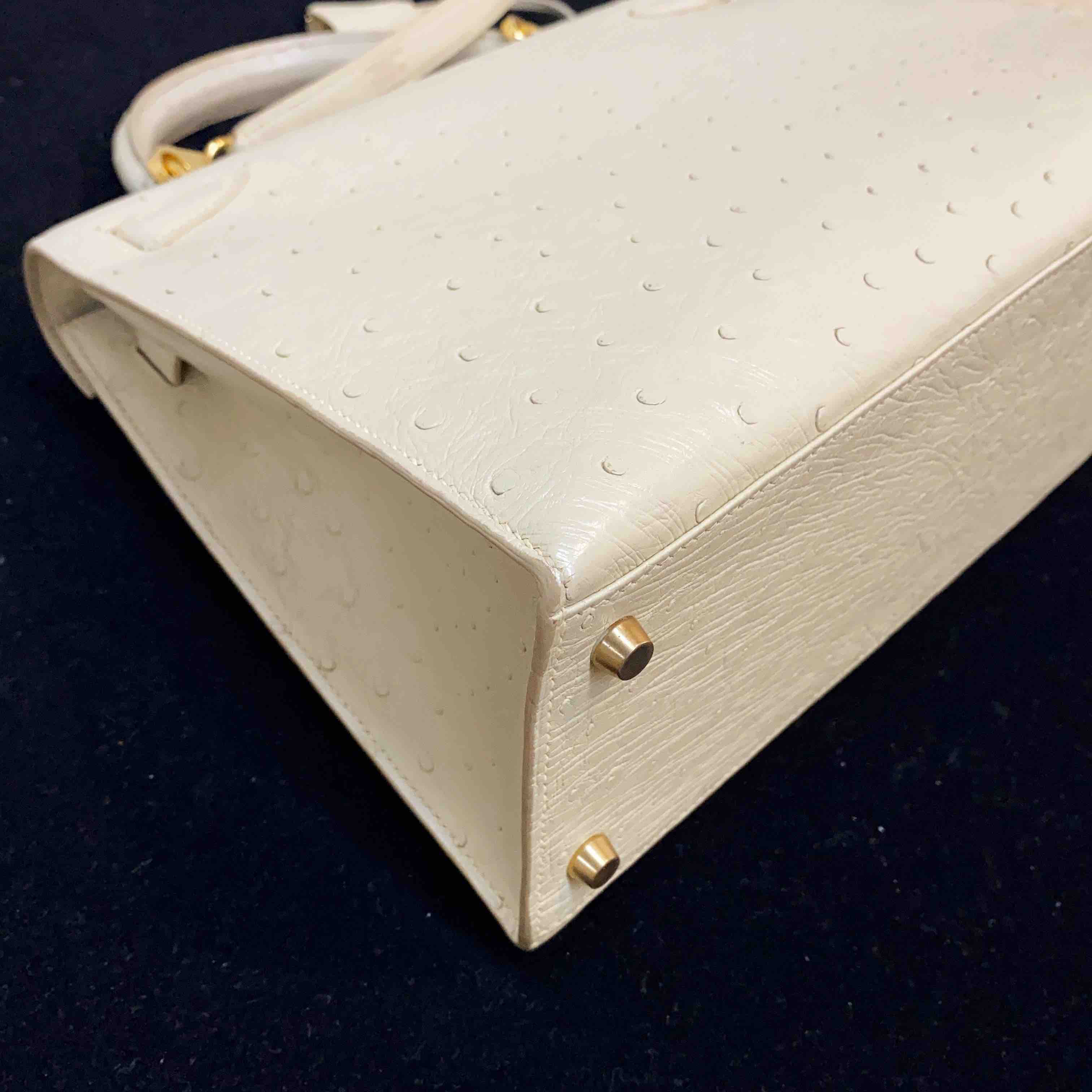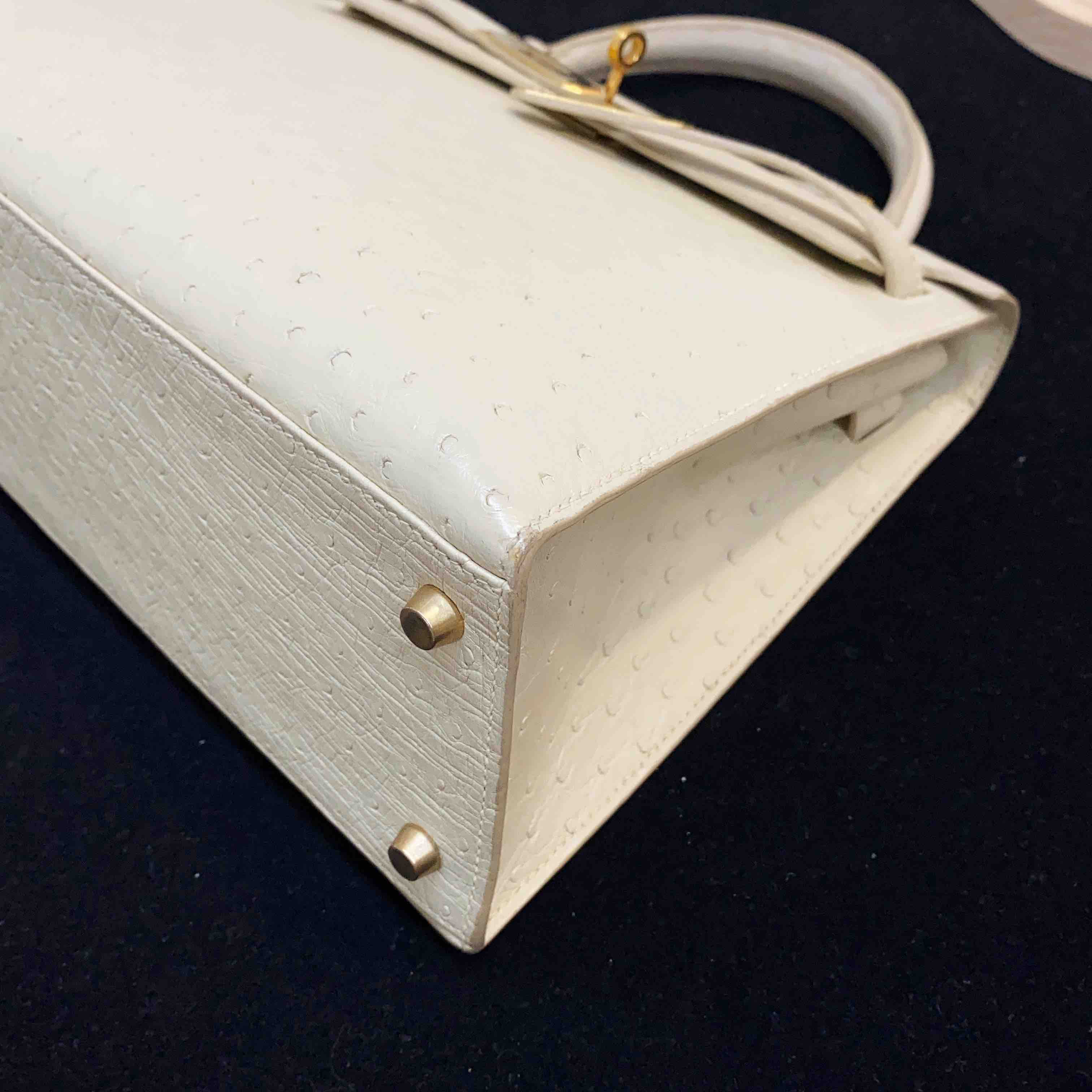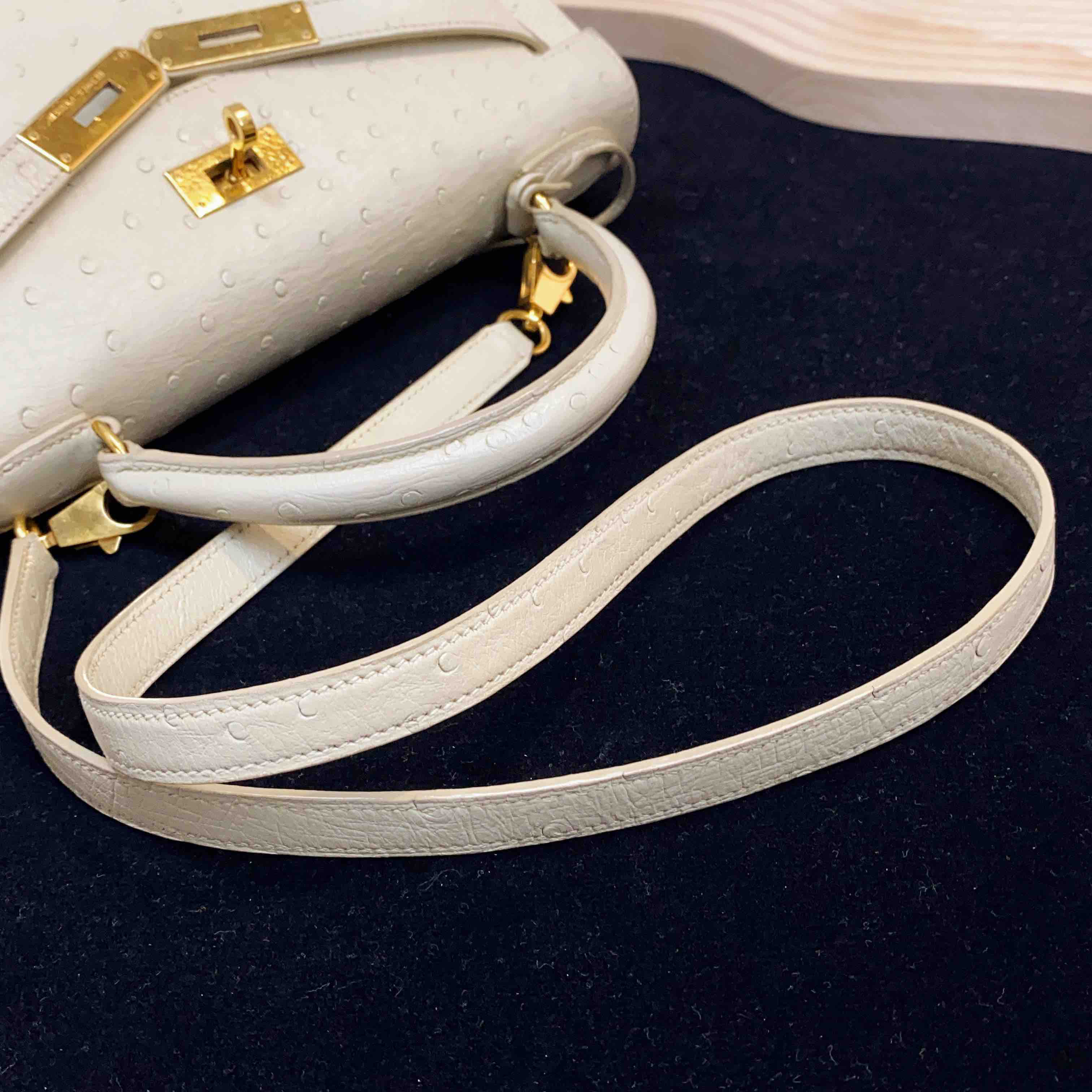 【商品描述】正品二手 Hermes Kelly28 鸵鸟皮冰川白手提包🕊95新 28×20 圆形X刻配件:锁、钥匙挂件、肩带。边角和五金有使用感。