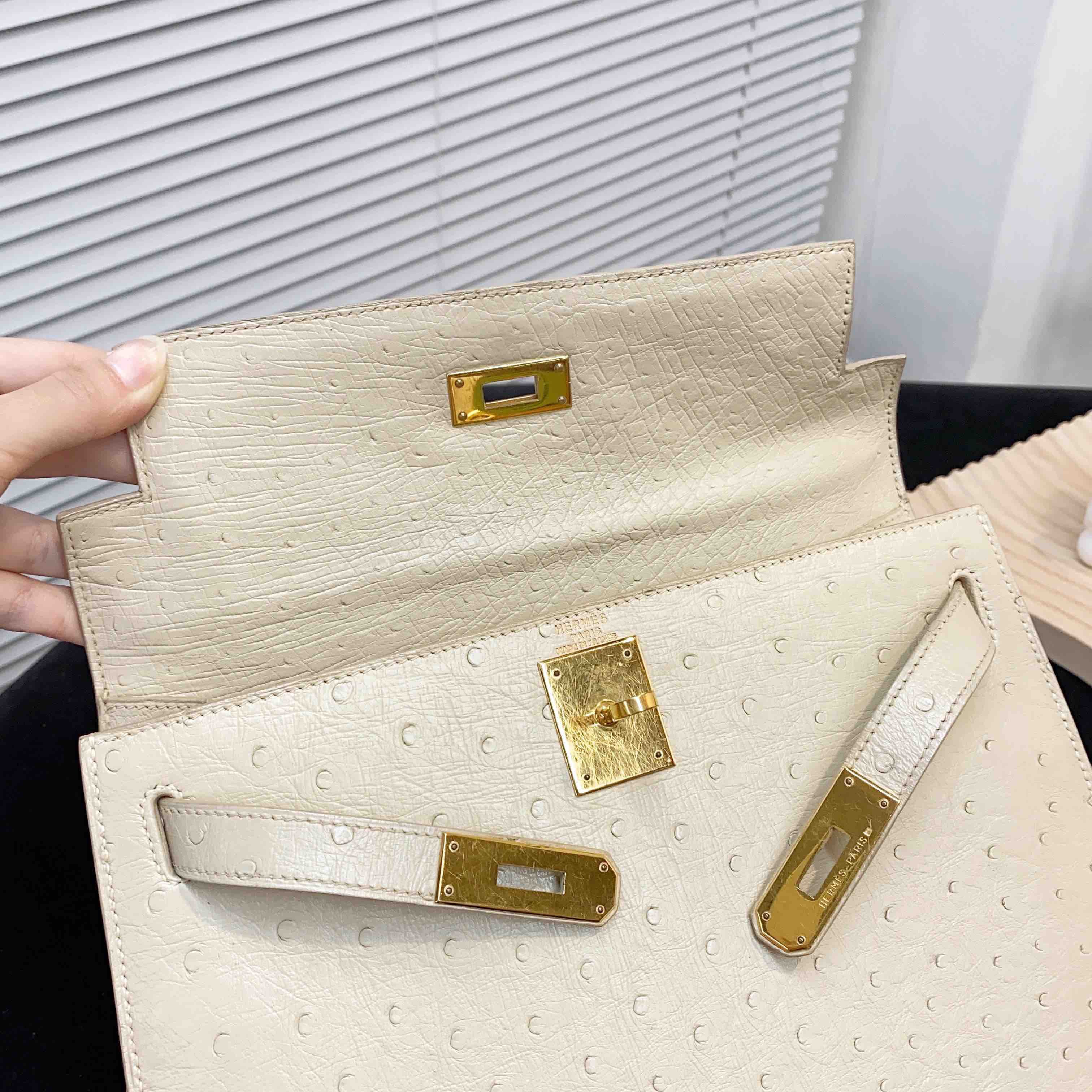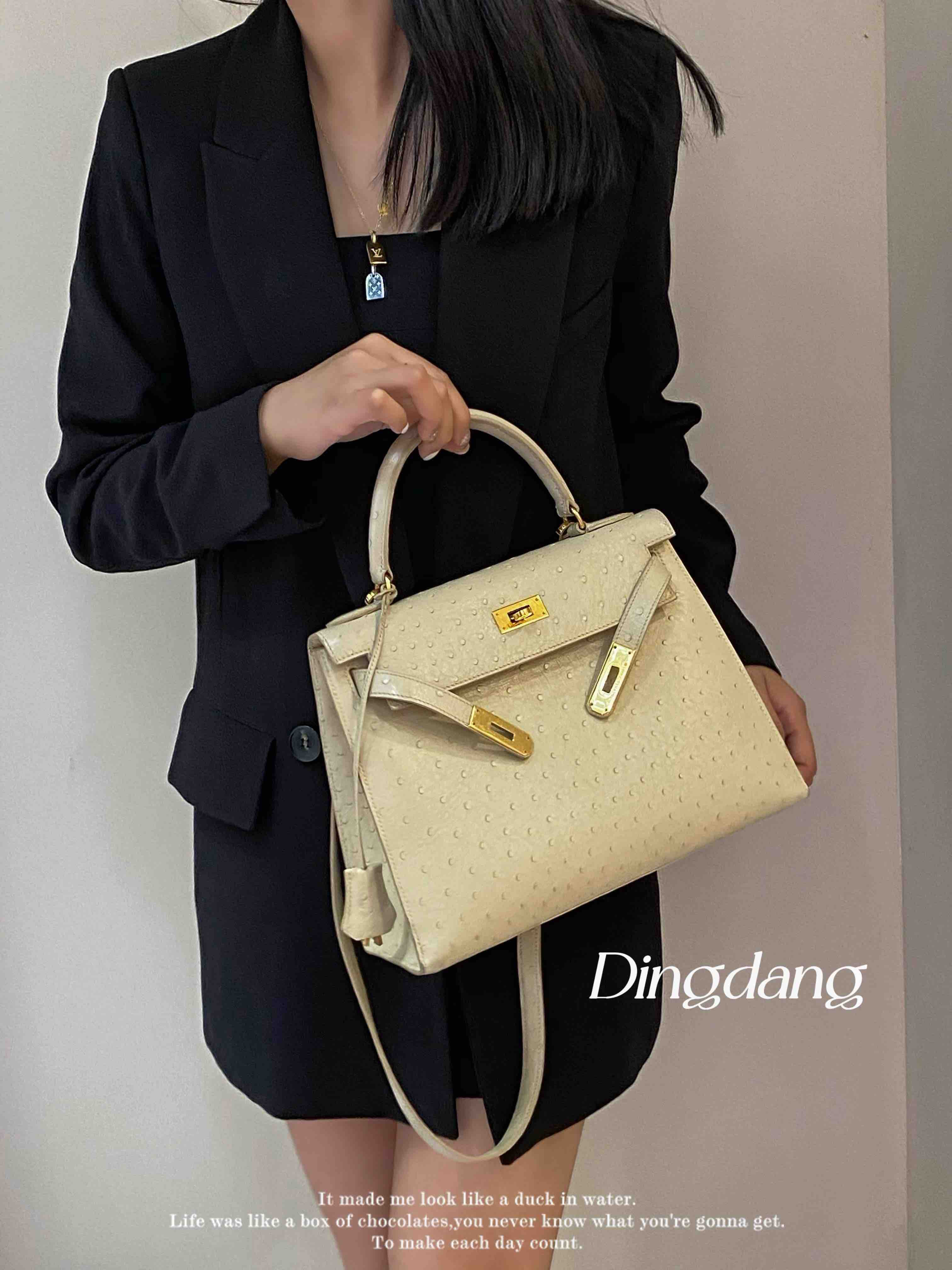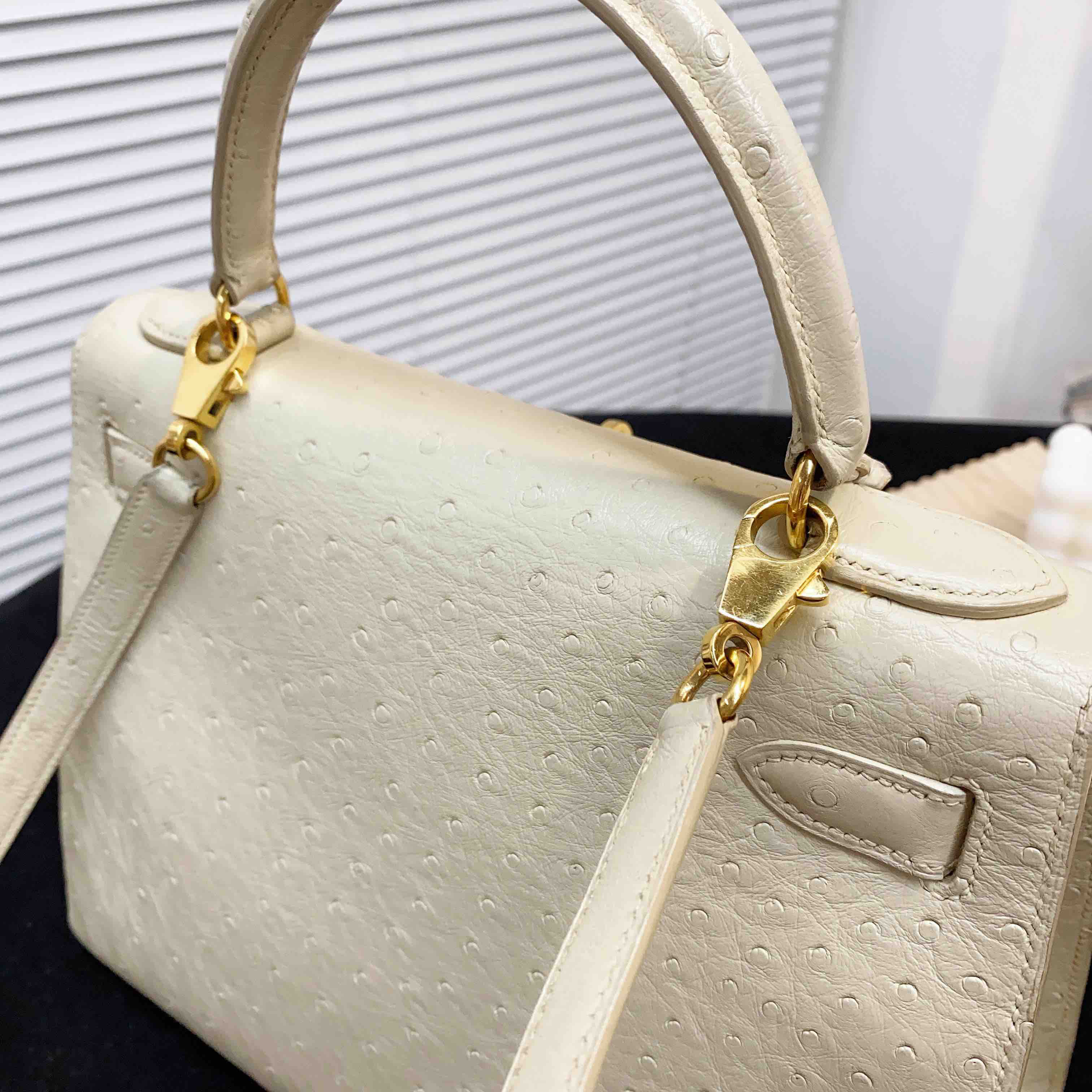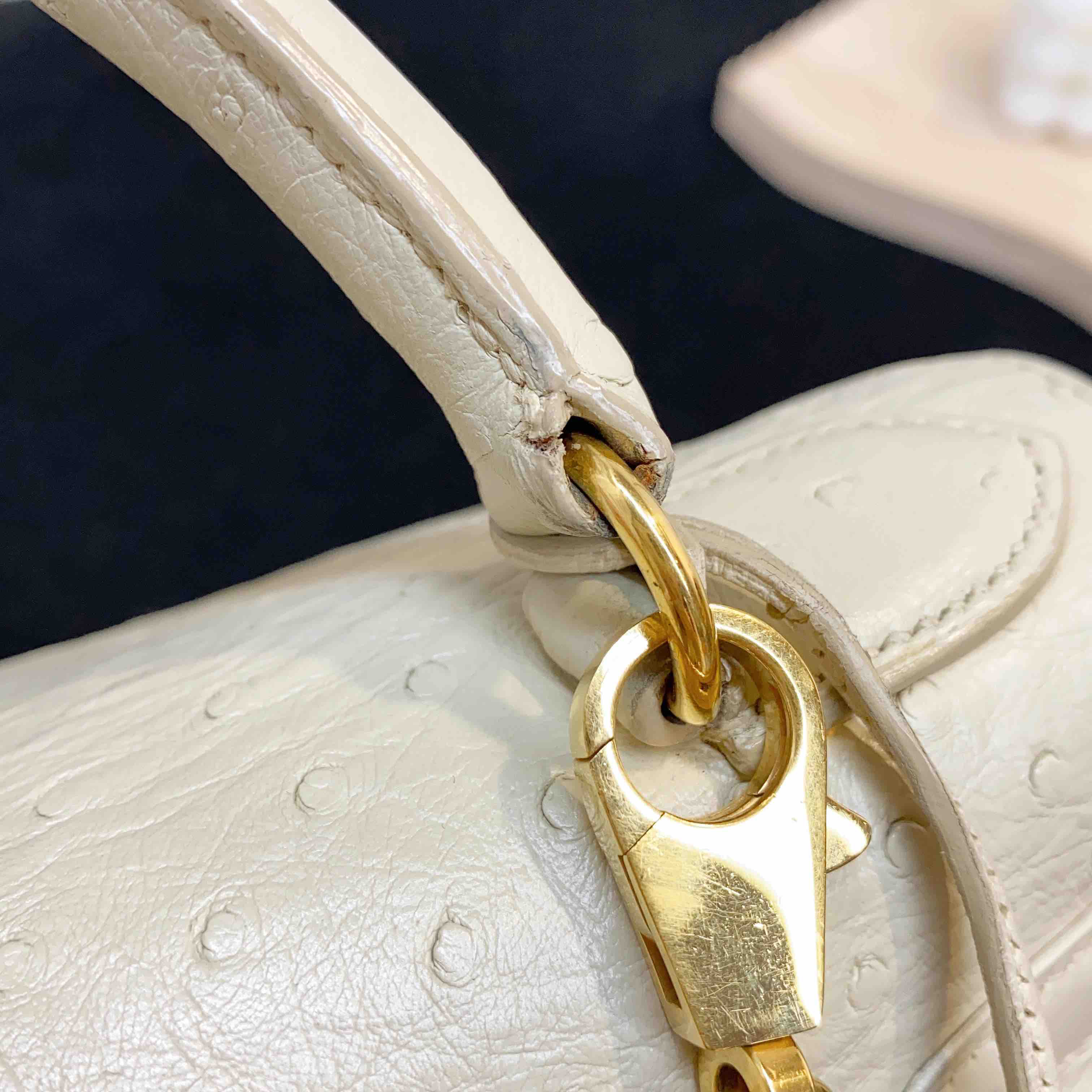 【商品描述】正品二手 Hermes Kelly28 鸵鸟皮冰川白手提包🕊95新 28×20 圆形X刻配件:锁、钥匙挂件、肩带。边角和五金有使用感。