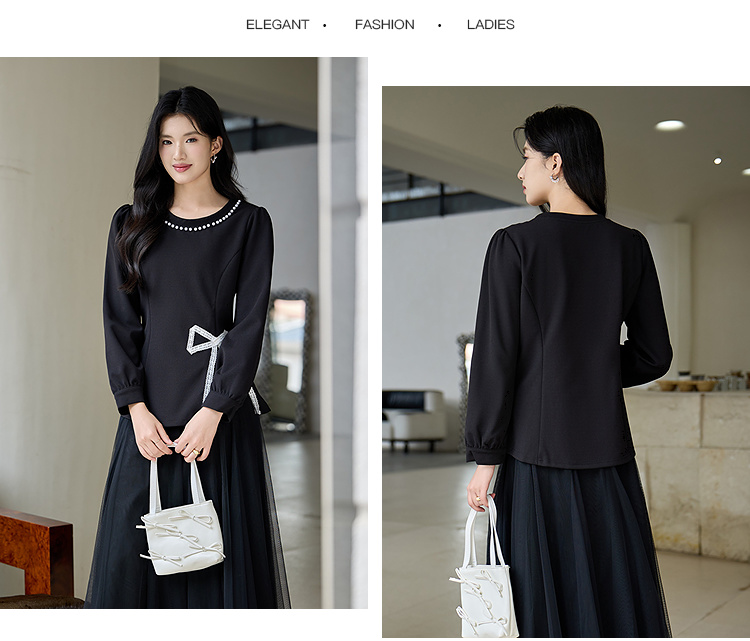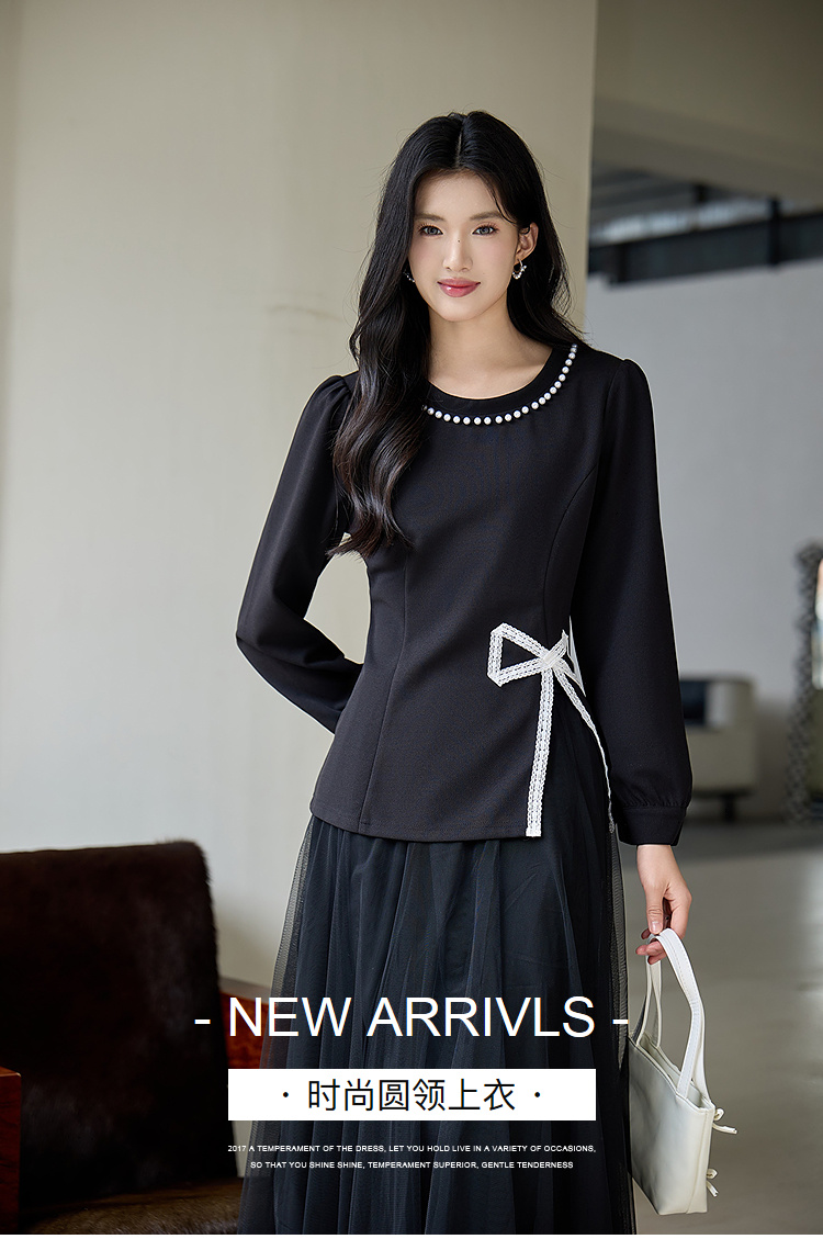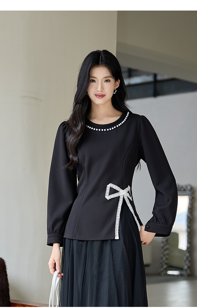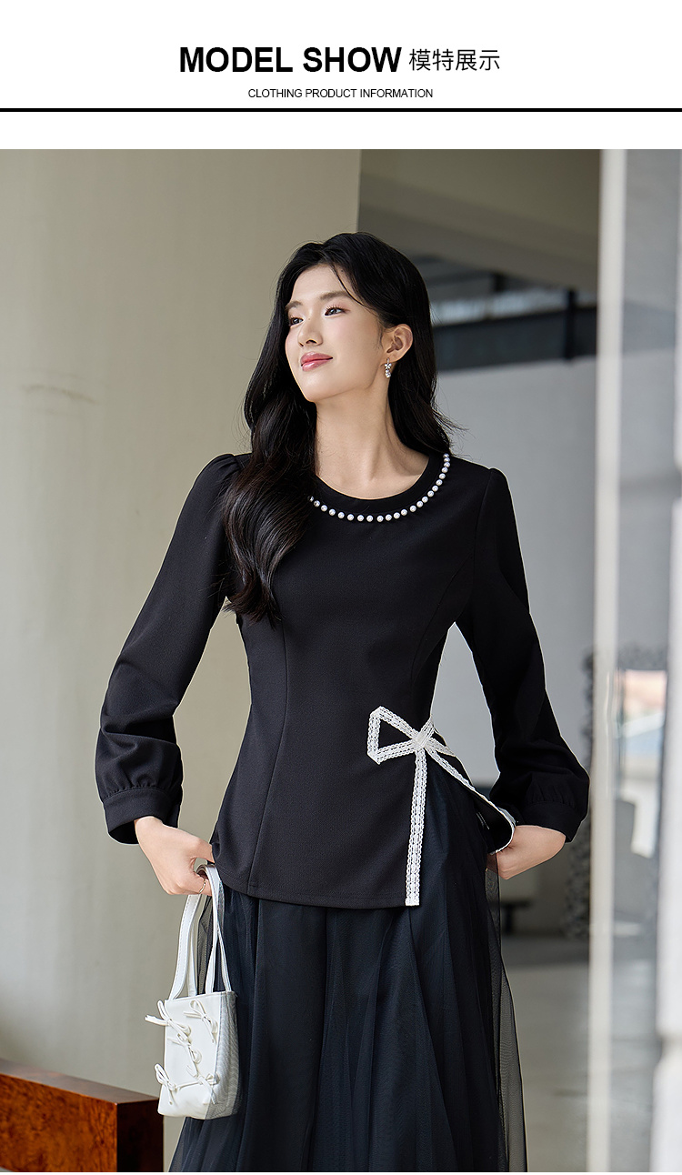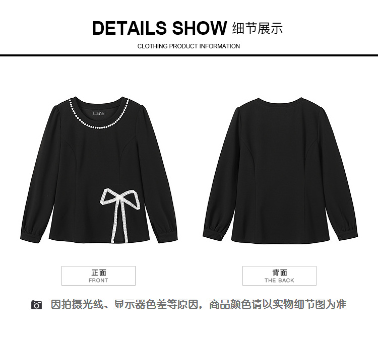 奢姿大码女装2025秋季胖妹妹时尚蝴蝶结设计气质珍珠装饰圆领上衣9953253791