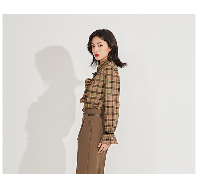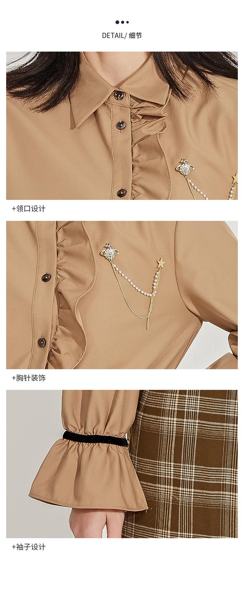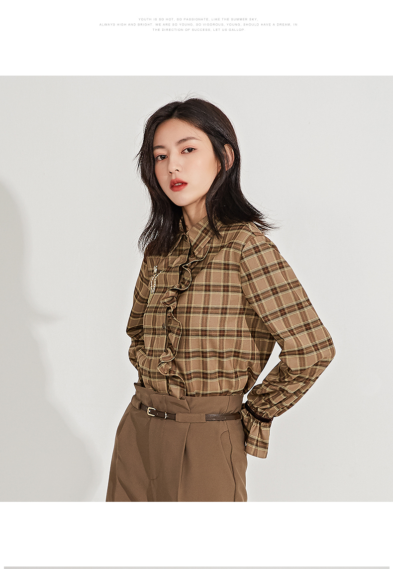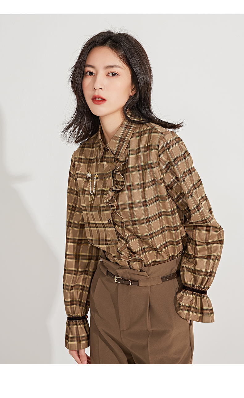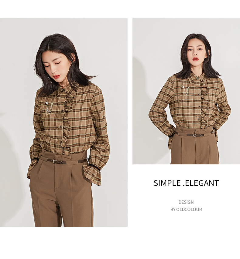 oldcolour春季新品格子复古气质花边门襟长袖衬衫女GN11013607