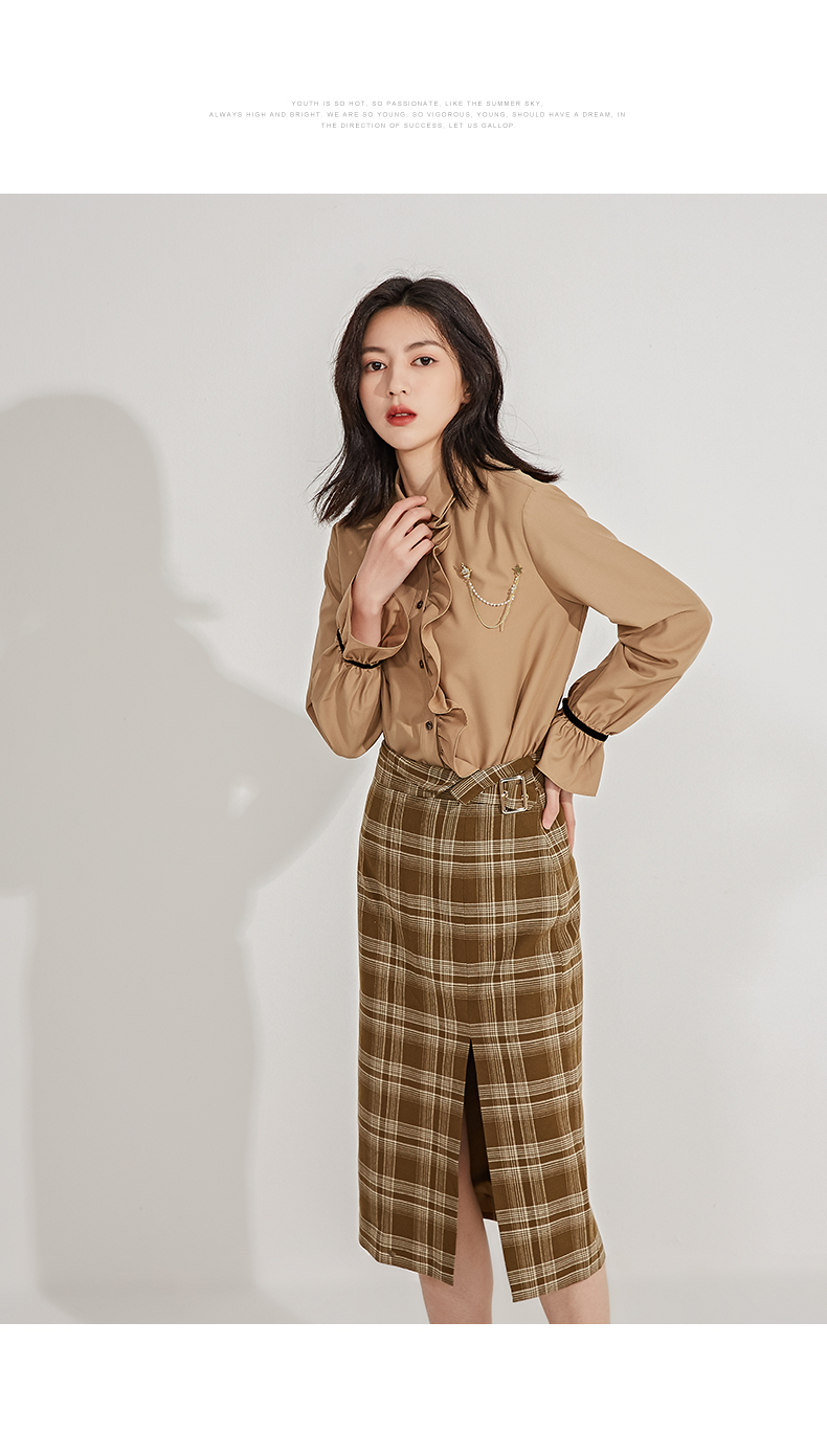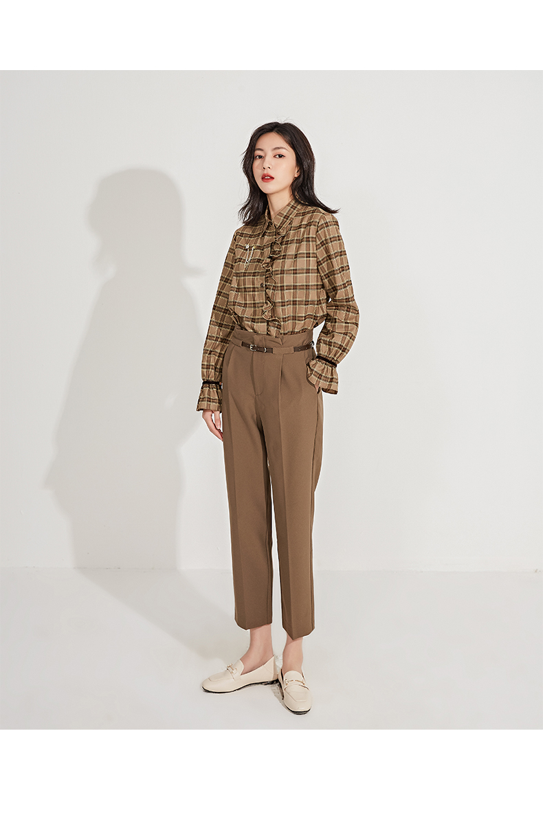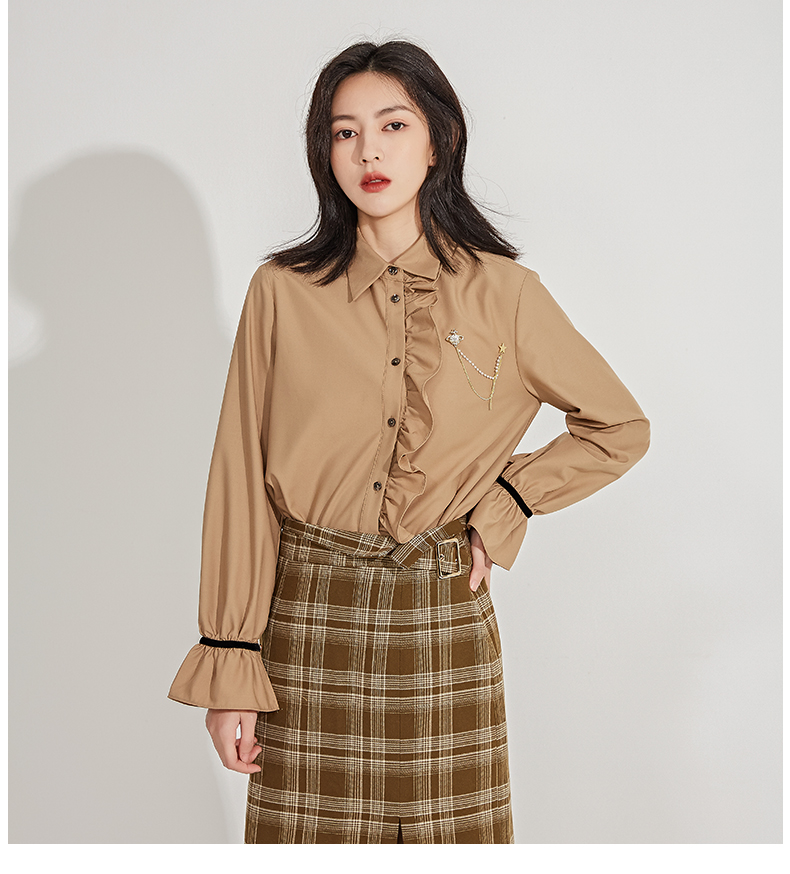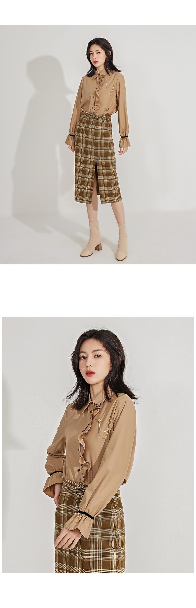 oldcolour春季新品格子复古气质花边门襟长袖衬衫女GN11013607